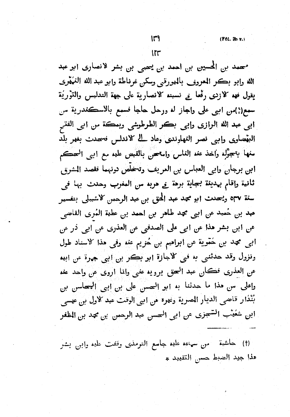 مُحَمَّدُ بْنُ الْحُسَيْنِ بْنِ أَحْمَدَ بْنِ يَحْيَى بْنِ بِشْرِ الأنْصَارِيُّ أَبُو عَبْدِ اللَّهِ وَأَبُو بَكْرٍ الْمَعْرُوفُ بِالْميورقِيِّ وَسَكَنَ غَرْنَاطَةَ وَأَبُو عَبْدِ اللَّهِ النُّمَيْرِيُّ يَقُولُ فِيهِ الأَزْدِيُّ رَفْعًا فِي نِسْبَتِهِ الأَنْصَارِيَّةِ عَلَى جِهَةِ التَّدْلِيسِ وَالتَّوْرِيَةِ سَمِعَ مِنْ أَبِي عَلِيٍّ وَأَجَازَ لَهُ وَرَحَلَ حَاجًّا فَسَمِعَ بِالإِسْكَنْدَرِيَّةِ مِنْ أَبِي عَبْدِ اللَّهِ الرَّازِيِّ وَأَبِي بَكْرٍ الطَّرْطُوشِيِّ وَبِمَكَّةَ مِنْ أَبِي الْفَتْحِ الْبَيْضَاوِيِّ وَأَبِي نَصْرٍ النَّهَاوَنْدِيِّ وَعَادَ إِلَى الأَنْدَلُسِ فَحَدَّثَ بِغَيْرِ بَلَدٍ مِنْهَا بَتَجَوُّلِهِ وَأَخَذَ عَنْهُ النَّاسُ وَامْتُحِنَ بِالْقَبْضِ عَلَيْهِ مَعَ أَبِي الْحَكَمِ ابن بُرْجَانَ وَأَبِي الْعَبَّاسِ بْنِ الْعَرِيفِ وَتَخَلَّصَ دُونَهُمَا فَقَصَدَ الْمَشْرِقَ ثَانِيَةً وَأَقَامَ بِمَدِينَةِ بِجَايَةَ بُرْهَةً فِي هَرَبِهِ مِنَ الْمَغْرِبِ وَحَدَّثَ بِهَا فِي سَنَةِ 537 وَيُحَدِّثُ أَبُو مُحَمَّدٍ عَبْدُ الْحَقِّ بْنُ عَبْدِ الرَّحْمَنِ الإِشْبِيلِيُّ بِتَفْسِيرِ عَبْدِ بْنِ حُمَيْدٍ عَنْ أَبِي مُحَمَّدٍ طَاهِرِ بْنِ أَحْمَدَ بْنِ عَطِيَّةَ الْمُرِّيِّ الْقَاضِي عَنِ ابْنِ بِشْرٍ هَذَا عَنْ أَبِي عَلِيٍّ الصَّدَفِيِّ عَنِ الْعُذْرِيِّ عَنْ أَبِي ذَرٍّ عَنْ أَبِي مُحَمَّدِ بْنِ حَمُّوَيْهِ عَنْ إِبْرَاهِيمَ بْنِ حُزَيْمٍ عَنْهُ وَفِي هَذَا الإِسْنَادِ طُولٌ وَنُزُولٌ وَقَدْ حَدَّثَنِي بِهِ فِي الإِجَازَةِ أَبُو بَكْرِ بْنُ أَبِي جَمْرَةَ عَنْ أَبِيهِ عَنْ الْعُذْرِيِّ فَكَانَ عَبْدُ الْحَقِّ يَرْوِيهِ عَنِّي وَأَنَا أَرْوِي عَنْ وَاحِدٍ عَنْهُ وَأَعْلَى مِنْ هَذَا مَا حَدَّثَنَا بِهِ أَبُو الْحَسَنِ عَلِيُّ بْنُ أَبِي الْمَحَاسِنِ بْنِ بُنْدَارٍ قَاضِي الدِّيَارِ الْمِصْرِيَّةِ وَغَيْرِهِ عَنْ أَبِي الْوَقْتِ عَبْدِ الأول بن عيسى ابن شُعَيْبٍ السِّجْزِيِّ عَنْ أَبِي الْحَسَنِ عَبْدِ الرَّحْمَنِ بْنِ مُحَمَّدِ بْنِ الْمُظَفَّرِ