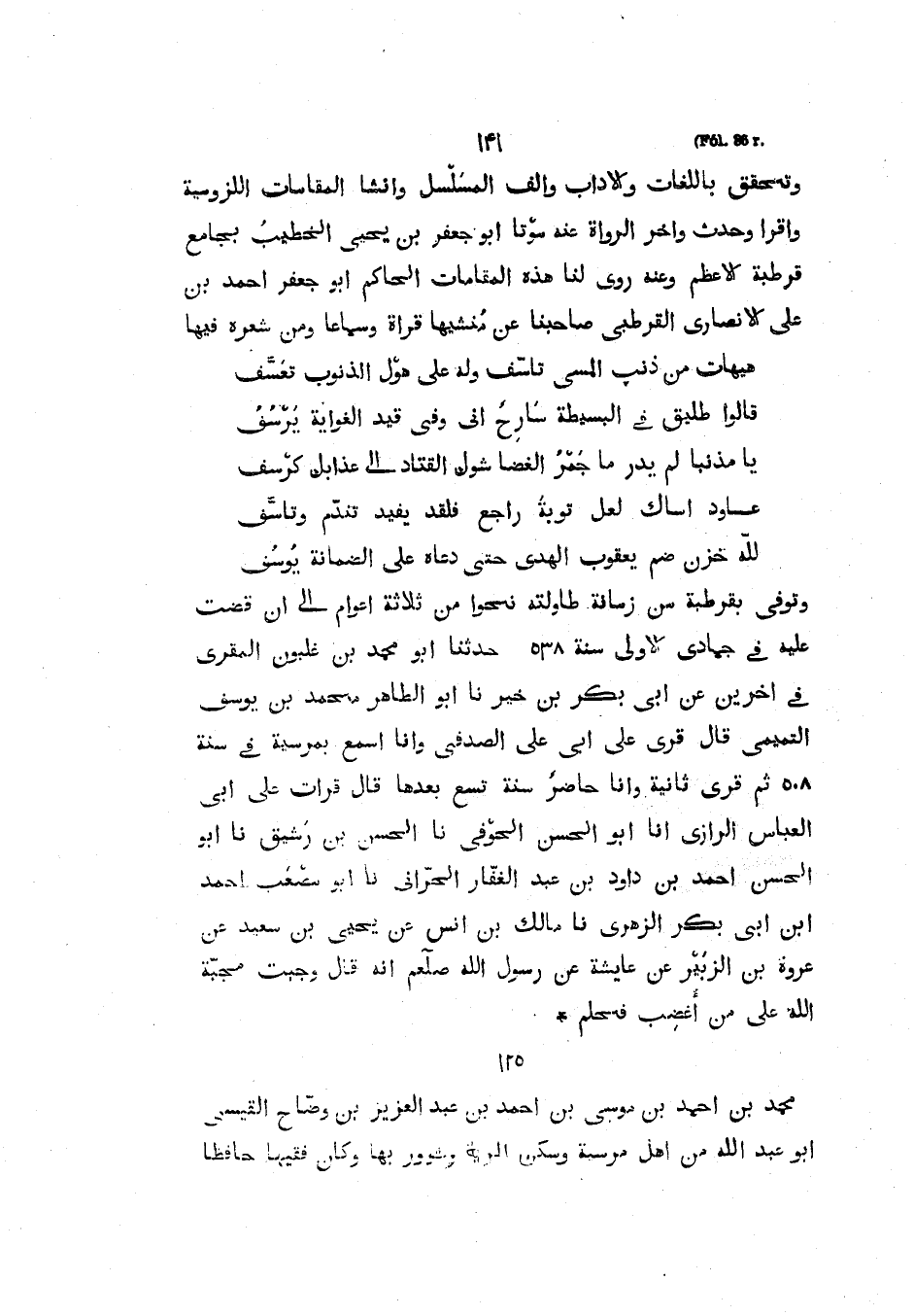 وَتُوُفِّيَ بِقُرْطُبَةَ مِنْ زَمَانَةٍ طَاوَلَتْهُ نَحْوًا مِنْ ثَلاثَةِ أَعْوَامٍ إِلَى أَنْ قَضَتْ عَلَيْهِ فِي جُمَادَى الأُولَى سَنَةَ 538 حَدَّثَنَا أَبُو مُحَمَّدِ بن غلبون المقري فِي آخَرِينَ عَنْ أَبِي بَكْرِ بْنِ خَيْرٍ نا أَبُو الطَّاهِرِ مُحَمَّدُ بْنُ يُوسُفَ التَّمِيمِيُّ قال قرى عَلَى أَبِي عَلِيٍّ الصَّدَفِيِّ وَأَنَا أَسْمَعُ بِمُرْسِيَّةَ في سنة 508 ثم قرى ثَانِيَةً وَأَنَا حَاضِرٌ سَنَةَ تِسْعٍ بَعْدَهَا قَالَ قَرَأْتُ عَلَى أَبِي الْعَبَّاسِ الرَّازِيِّ أَنَا أَبُو الْحَسَنِ الْحَوْفِيِّ نا الْحَسَنُ بْنُ رَشِيقٍ نا أَبُو الْحَسَنِ أَحْمَدُ بْنُ دَاوُدَ بْنِ عَبْدِ الغفار الحراني نا أبو مصعب أحمد ابن أَبِي بَكْرٍ الزُّهْرِيُّ نا مَالِكُ بْنُ أَنَسٍ عَنْ يَحْيَى بْنِ سَعِيدٍ عَنْ عُرْوَةَ بْنِ الزبير عن عايشة عَنْ رَسُولِ اللَّهِ صَلَّى اللَّهُ عَلَيْهِ وَسَلَّمَ أنه قال وجبت مجبة اللَّهِ عَلَى مَنْ أُغْضِبَ فَحَلِمَ