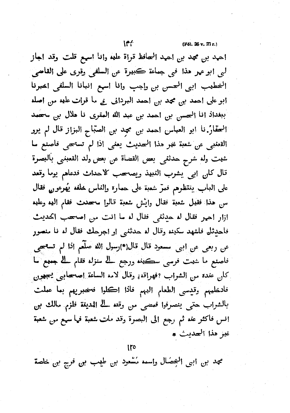 فأحدثك فأشهد سِكِّينَهُ وَقَالَ لَهُ حَدِّثْنِي أَوْ أَجْرَحُكَ فَقَالَ لَهُ نا مَنْصُورٌ عَنْ رِبْعِيٍّ عَنْ أَبِي مسعود قال قال رسل اللَّهِ صَلَّى اللَّهُ عَلَيْهِ وَسَلَّمَ إِذَا لَمْ تستحي فأصنع ما شيت فرسي سِكِّينَهُ وَرَجَعَ إِلَى مَنْزِلِهِ فَقَامَ إِلَى جَمِيعِ مَا كَانَ عِنْدَهُ مِنَ الشَّرَابِ فَهَرَاقَهُ وَقَالَ لأمه الساعة أصحابي يجيون فأدخليهم وقدسي الطعام إليهم فَإِذَا أَكَلُوا فَخَبِّرِيهُمْ بِمَا عَمِلْتُ بِالشَّرَابِ حَتَّى ينصوفوا فَمَضَى مِنْ وَقْتِهِ إِلَى الْمَدِينَةِ فَلَزِمَ مَالِكَ بْنَ أَنَسٍ فَأْكَثَر عَنْهُ ثُمَّ رَجَعَ إِلَى الْبَصْرَةِ وَقَدْ مَاتَ شُعْبَةُ فَمَا سَمِعَ مِنْ شُعْبَةَ غَيْرَ هَذَا الْحَدِيثِ