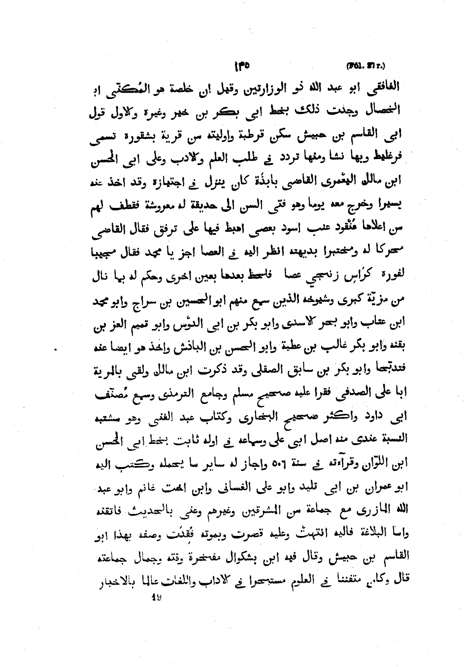 الْغَافِقِيُّ أَبُو عَبْدِ اللَّهِ ذُو الْوَزَارَتَيْنِ وَقِيلَ أن خلصة هو المكني أبي الْخِصَالِ وَجَدْتُ ذَلِكَ بِخَطِّ أَبِي بَكْرِ بْنِ خَيْرٍ وَغَيْرِهِ وَالأَوَّلُ قَوْلُ أَبِي الْقَاسِمِ بْنِ حُبَيْشٍ سَكَنَ قُرْطُبَةَ وَأَوَّلِيَّتُهُ مِنْ قَرْيَةِ بِشَقُورَةَ تُسَمَّى فُرْغُلِيطَ وَبِهَا نَشَأَ وَمِنْهَا تَرَدَّدَ فِي طلب العلم والأدب وعلى أبي الحسن ابن مالك اليعمري القاضي بابذة كَانَ يَنْزِلُ فِي اجْتِيَازِهِ وَقَدْ أَخَذَ عَنْهُ يسيراً وخرج معه يوماً وهو فى السِّنِّ إِلَى حَدِيقَةٍ لَهُ مَعْرُوشَةٍ فَقَطَفَ لَهُمْ مِنْ أَعْلاهَا عُنْقُودَ عِنَبٍ أَسْوَدَ بِعَصًى أَهْبَطَ فِيهَا عَلَى تَرَفُّقٍ فَقَالَ الْقَاضِي مُحَرِّكًا لَهُ ومختبراً بديهته انظر إليه في العصا أجز يَا مُحَمَّدُ فَقَالَ مُجِيبًا لِفَوْرِهِ كَرَأْسِ زِنْجِيٍّ عَصَا فَلَحَظَ بَعْدَهَا بِعَيْنٍ أُخْرَى وَحَكَمَ لَهُ بِمَا نَالَ مِنْ مَزِيَّةٍ كُبْرَى وَشُيُوخُهُ الَّذِينَ سَمِعَ مِنْهُمْ أَبُو الْحُسَيْنِ بْنُ سِرَاجٍ وَأَبُو محمد ابن عَتَّابٍ وَأَبُو بَحْرٍ الأَسَدِيُّ وَأَبُو بَكْرِ بْنُ أَبِي الدَّوْسِ وَأَبُو تَمِيمٍ الْعِزُّ بْنُ بَقَنَّةَ وَأَبُو بَكْرٍ غَالِبُ بْنُ عَطِيَّةَ وَأَبُو الْحَسَنِ بن الباذنش وَأَخَذَ هُوَ أَيْضًا عَنْهُ فَتَدَبَّحَا وَأَبُو بَكْرِ بْنُ سَابِقٍ الصَّقَلِّيُّ وَقَدْ ذَكَرْتُ ابْنَ مَالِكٍ وَلَقِيَ بِالْمَرِيَّةِ أَبَا عَلِيٍّ الصَّدَفِيَّ فَقَرَأَ عَلَيْهِ صَحِيحَ مُسْلِمٍ وَجَامِعَ التِّرْمِذِيِّ وَسَمِعَ مُصَنَّفَ أَبِي دَاوُدَ وَأَكْثَرَ صَحِيحِ الْبُخَارِيِّ وَكِتَابَ عَبْدِ الْغَنِيِّ وَهُوَ مُشْتَبِهُ النِّسْبَةِ عِنْدِي مِنْهُ أَصْلُ أَبِي عَلِيٍّ وَسَمَاعُهُ فِي أَوَّلِهِ ثَابِتٌ بِخَطِّ أَبِي الحسن ابن اللوان وقراءته في سنة 506 وأجاز له ساير مَا يَحْمِلُهُ وَكَتَبَ إِلَيْهِ أَبُو عِمْرَانَ بْنُ أَبِي تَلِيدٍ وَأَبُو عَلِيٍّ الْغَسَّانِيُّ وَابْنُ أُخْتِ غانم وأبو عبد الله المازري مع جماعة من المشرقين وَغَيْرِهِمْ وَعَنِيَ بِالْحَدِيثِ فَأَتْقَنَهُ وَأَمَّا الْبَلاغَةُ فَإِلَيْهِ اتنهت وَعَلَيْهِ قُصِرَتْ وَبِمَوْتِهِ فُقِدَتْ وَصَفَهُ بِهَذَا أَبُو الْقَاسِمِ بْنُ حُبَيْشٍ وَقَالَ فِيهِ ابْنُ بَشْكُوَالَ مَفْخَرَةُ وَقْتِهِ وَجَمَالُ جَمَاعَتِهِ قَالَ وَكَانَ مُتَفَنِّنًا فِي الْعُلُومِ مُسْتَبْحِرًا فِي الآدَابِ وَاللُّغَاتِ عَالِمًا بالأخبار