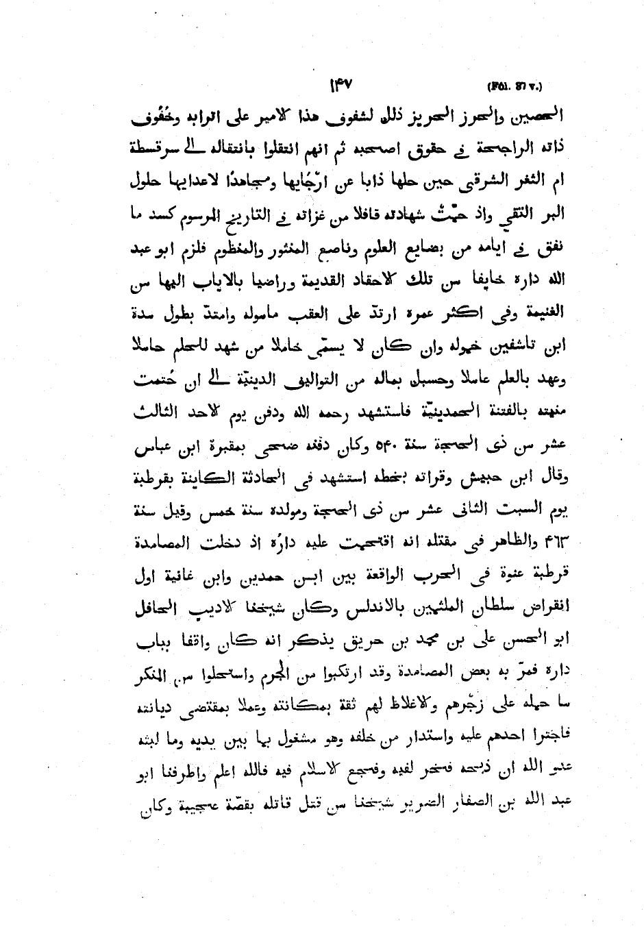 الْحَصِينِ وَالْحِرْزِ الْحَرِيزِ ذَلِكَ لِشُفُوفِ هَذَا الأَمِيرِ عَلَى أَتْرَابِهِ وَخُفُوفِ ذَاتِهِ الرَّاجِحَةِ فِي حُقُوقِ أصحبه ثُمَّ إنَّهُمُ انْتَقَلُوا بِانْتِقَالِهِ إِلَى سَرَقُسْطَةَ أُمِّ الثغر الشرقي حين حلها ذاباً عن أرجايها ومجاهداً لاعدايها حلول البر التقي وإذ حمت شهادته قَافِلا مِنْ غَزَاتِهِ فِي التَّارِيخِ الْمَرْسُومِ كَسَدَ ما نفق في أيامه من بضايع الْعُلُومِ وَنَاصِعِ الْمَنْثُورِ وَالْمَنْظُومِ فَلَزِمَ أَبُو عَبْدِ الله داره خايفاً مِنْ تِلْكَ الأَحْقَادِ الْقَدِيمَةِ وَرَاضِيًا بِالإِيَابِ إِلَيْهَا مِنَ الْغَنِيمَةِ وَفِي أَكْثَرِ عُمْرِهِ ارْتَدَّ عَلَى العقب مأموله وَامْتَدَّ بِطُولِ مُدَّةِ ابْنِ تَاشفِينَ خُمُولُهُ وَإِنْ كَانَ لا يُسَمَّى خَامِلا مَنْ شَهِدَ لِلْحِلْمِ حاملاً وعهد بالعلم عاملاً وحسبك بماله من التواليف الدينية إلى أن حتمت منته بِالْفِتْنَةِ الْحَمدِينِيَّةِ فَاسْتُشْهِدَ رَحِمَهُ اللَّهُ وَدُفِنَ يَوْمَ الأَحَدِ الثَّالِثَ عَشَرَ مِنْ ذِي الْحِجَّةِ سَنَةَ 540 وَكَانَ دَفْنُهُ ضُحًى بِمَقْبَرَةِ ابْنِ عَبَّاسٍ وَقَالَ ابن حبيش وقرأته بخطه استشهد في الحادثة الكاينة بِقُرْطُبَةَ يَوْمَ السَّبْتِ الثَّانِي عَشَرَ مِنْ ذِي الْحِجَّةِ وَمَوْلِدُهُ سَنَةَ خَمْسٍ وَقِيلَ