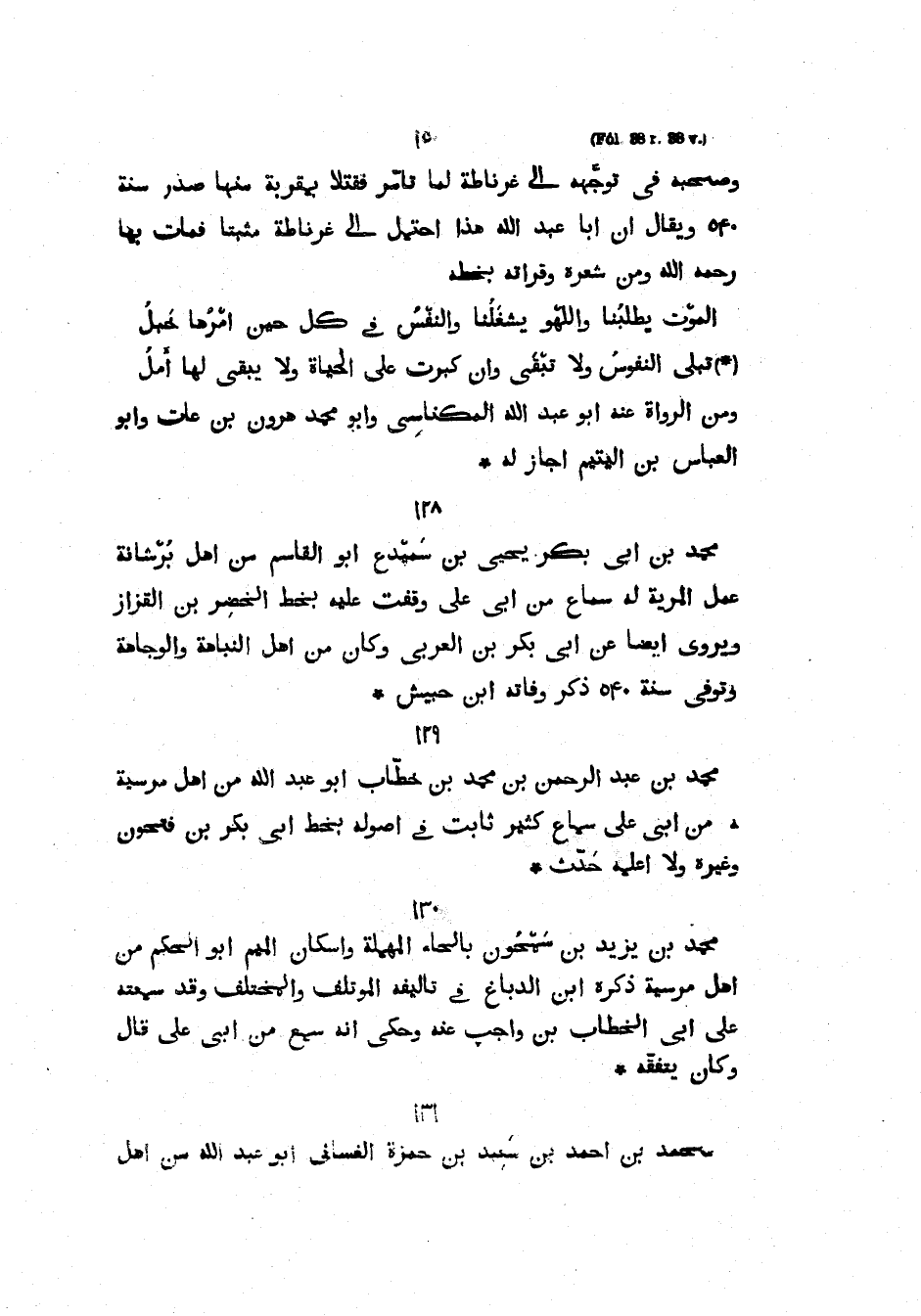 وَصَحِبَهُ فِي تَوَجُّهِهِ إِلَى غَرْنَاطَةَ لَمَّا تَآمَرَ فَقُتِلَا بِمَقْرَبَةٍ مِنْهَا صَدْرَ سَنَةَ 540 وَيُقَالُ إِنَّ أَبَا عَبْدِ اللَّهِ هَذَا احْتُمِلَ إِلَى غَرْنَاطَةَ مُثَبّتًا فَمَاتَ بِهَا رَحِمَهُ اللَّهُ وَمِنْ شِعْرِهِ وقرأته بِخَطِّهِ الْمَوْتُ يَطْلُبُنَا وَاللَّهْوُ يَشْغَلُنَا وَالنَّفْسُ فِي كُلِّ حِينٍ أَمْرُهَا خَبَلُ تَبْلَى النُّفُوسُ وَلا تبْقَى وَأَنْ كَبِرَتْ عَلَى الْحَيَاةِ وَلا يَبْقَى لَهَا أَمَلُ وَمِنَ الرُّوَاةِ عَنْهُ أَبُو عَبْدِ الله المكناسي وأبو محمد هرون بْنُ عَاتٍ وَأَبُو الْعَبَّاسِ بْنُ الْيَتِيمِ أَجَازَ لَهُ مُحَمَّدُ بْنُ أَبِي بَكْرٍ يَحْيَى بْنُ سُمَيْدِعٍ أَبُو الْقَاسِمِ مِنْ أَهْلِ بُرْشَانَةَ عَمَلِ الْمَرِيَّةِ لَهُ سَمَاعٌ مِنْ أَبِي عَلِيٍّ وَقَفْتُ عَلَيْهِ بِخَطِّ الْخَضِرِ بْنِ الْقَزَّازِ وَيُرْوَى أَيْضًا عَنْ أَبِي بَكْرِ بْنِ الْعَرَبِيِّ وَكَانَ مِنْ أَهْلِ النَّبَاهَةِ وَالْوَجَاهَةِ وَتُوُفِّيَ سَنَةَ 540 ذَكَرَ وَفَاتَهُ ابْنُ حُبَيْشٍ مُحَمَّدُ بْنُ عَبْدِ الرَّحْمَنِ بْنِ مُحَمَّدِ بْنِ خَطَّابٍ أَبُو عَبْدِ اللَّهِ مِنْ أهل مرسية مِنْ أَبِي عَلِيٍّ سَمَاعٌ كَثِيرٌ ثَابِتٌ فِي أُصُولِهِ بِخَطِّ أَبِي بَكْرِ بْنِ فَتْحُونٍ وَغَيْرِهِ وَلا أَعْلَمُهُ حَدَّثَ مُحَمَّدُ بْنُ يَزِيدَ بْنِ سَمْحُونٍ بِالْحَاءِ الْمُهْمَلَةِ وَإِسْكَانِ الْمِيمِ أَبُو الْحَكَمِ مِنْ أَهْلِ مُرْسِيَّةَ ذَكَرَهُ ابْنُ الدَّبَّاغِ فِي تاليفه الموتلف والمختلف وقد سمعه عَلَى أَبِي الْخَطَّابِ بْنِ وَاجِبٍ عَنْهُ وَحَكَى أَنَّهُ سَمِعَ مِنْ أَبِي عَلِيٍّ قَالَ وَكَانَ يَتَفَقَّهُ مُحَمَّدُ بْنُ أَحْمَدَ بْنِ سَعِيدِ بْنِ حَمْزَةَ الْغَسَّانِيُّ أَبُو عَبْدِ اللَّهِ مِنْ أَهْلِ