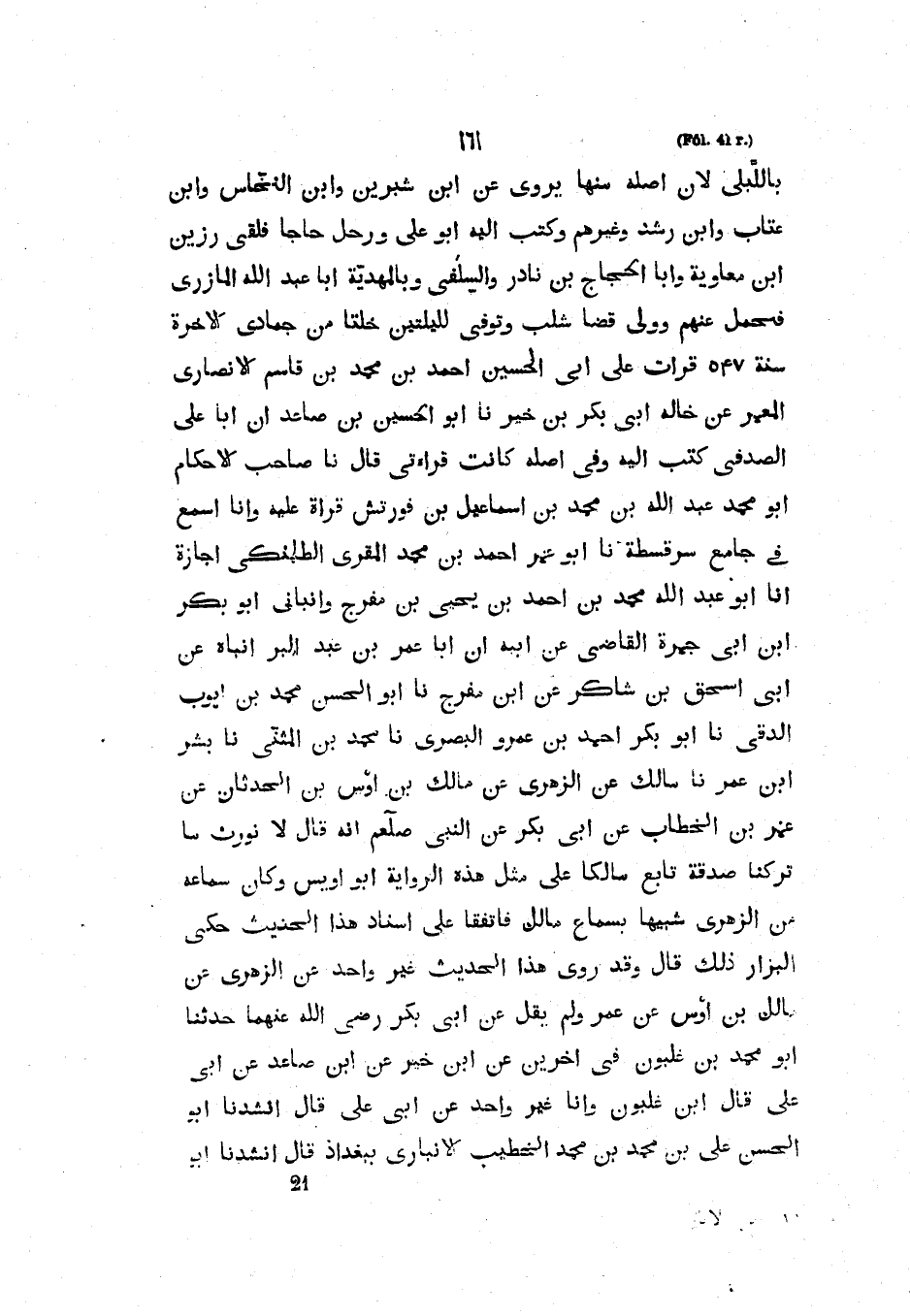 بالليلي لأَنَّ أَصْلَهُ مِنْهَا يَرْوِي عَنِ ابْنِ شبرين وَابْنِ النَّخَّاسِ وَابْنِ عَتَّابٍ وَابْنِ رُشْدٍ وَغَيْرِهِمْ وَكَتَبَ إِلَيْهِ أَبُو عَلِيٍّ وَرَحَلَ حَاجًّا فَلَقِيَ رزين ابن مُعَاويَةَ وَأَبَا الْحَجَّاجِ بْنَ نَادِرٍ وَالسِّلَفِيَّ وَبِالْمَهْدِيَّةِ أبا عبد الله المازوي فحمل عنهم وولى قضا شِلْبَ وَتُوُفِّيَ لِلَيْلَتَيْنِ خَلَتَا مِنْ جُمَادَى الآخِرَةِ سَنَةَ 547 قَرَأْتُ عَلَى أَبِي الْحُسَيْنِ أَحْمَدَ بْنِ مُحَمَّدِ بْنِ قَاسِمٍ الْأَنْصَارِيِّ الْمُعَمَّرِ عَنْ خَالِهِ أَبِي بَكْرِ بْنِ خَيْرٍ نا أَبُو الْحُسَيْنِ بْنُ صَاعِدٍ أَنَّ أَبَا عَلِيٍّ الصَّدَفِيَّ كَتَبَ إِلَيْهِ وَفِي أَصْلِهِ كَانَتْ قِرَاءَتِي قَالَ نا صَاحِبُ الأَحْكَامِ أَبُو مُحَمَّدٍ عَبْدُ اللَّهِ بْنُ محمد بن إسماعيل بن فورتش قراة عَلَيْهِ وَأَنَا أَسْمَعُ فِي جَامِعِ سَرَقُسْطَةَ نا أبو عمر أحمد بن محمد المقري الطَّلَمَنْكِيُّ إِجَازَةً أَنَا أَبُو عَبْدِ اللَّهِ مُحَمَّدُ بْنُ أَحْمَدَ بْنِ يَحْيَى بْنِ مُفَرِّجٍ وَأَنْبَأَنِي أبو بكر ابن أَبِي جَمْرَةَ الْقَاضِي عَنْ أَبِيهِ أَنَّ أَبَا عُمَرَ بْنَ عَبْدِ الْبَرِّ أَنْبَأَهُ عَنْ أَبِي إسحق بْنِ شَاكِرٍ عَنِ ابْنِ مُفَرِّجٍ نا أَبُو الْحَسَنِ مُحَمَّدُ بْنُ أَيُّوبَ الدُّقِّيُّ نا أَبُو بَكْرٍ أَحْمَدُ بْنُ عَمْرٍو الْبَصْرِيُّ نا مُحَمَّدُ بن المثنى نا بشر ابن عن مر مَالِكٌ عَنِ الزُّهْرِيِّ عَنْ مَالِكِ بْنِ أَوْسِ بْنِ الْحَدَثَانِ عَنْ عُمَرَ بْنِ الْخَطَّابِ عَنْ أَبِي بَكْرٍ عَنِ النَّبِيِّ صَلَّى اللَّهُ عَلَيْهِ وَسَلَّمَ أَنَّهُ قَالَ لا نُورَثُ مَا تَرَكْنَا صَدَقَةٌ تَابَعَ مَالِكًا عَلَى مِثْلِ هَذِهِ الرِّوَايَةِ أَبُو أُوَيْسٍ وَكَانَ سَمَاعُهُ مِنَ الزُّهْرِيِّ شَبِيهًا بِسَمَاعِ مَالِكٍ فَاتَّفَقَا عَلَى إِسْنَادِ هَذَا الْحَدِيثِ حَكَى الْبَزَّارُ ذَلِكَ قَالَ وَقَدْ رَوَى هَذَا الْحَدِيثَ غَيْرُ وَاحِدٍ عَنِ الزُّهْرِيِّ عَنْ مَالِكِ بْنِ أَوْسٍ عَنْ عُمَرَ ولَمْ يَقُلْ عَنْ أبي بكر رضي الله عنه حَدَّثَنَا أَبُو مُحَمَّدِ بْنُ غَلْبُونٍ فِي آخَرِينَ عَنِ ابْنِ خَيْرٍ عَنِ ابْنِ صَاعِدٍ عَنْ أَبِي عَلِيٍّ قَالَ ابْنُ غَلْبُونٍ وَأَنَا غَيْرُ وَاحِدٍ عَنْ أَبِي عَلِيٍّ قَالَ أَنْشَدَنَا أَبُو الْحَسَنِ عَلِيُّ بْنُ مُحَمَّدِ بْنِ مُحَمَّدٍ الْخَطِيبُ الأَنْبَارِيُّ بِبَغْدَادَ قَالَ أَنْشَدَنَا أَبُو