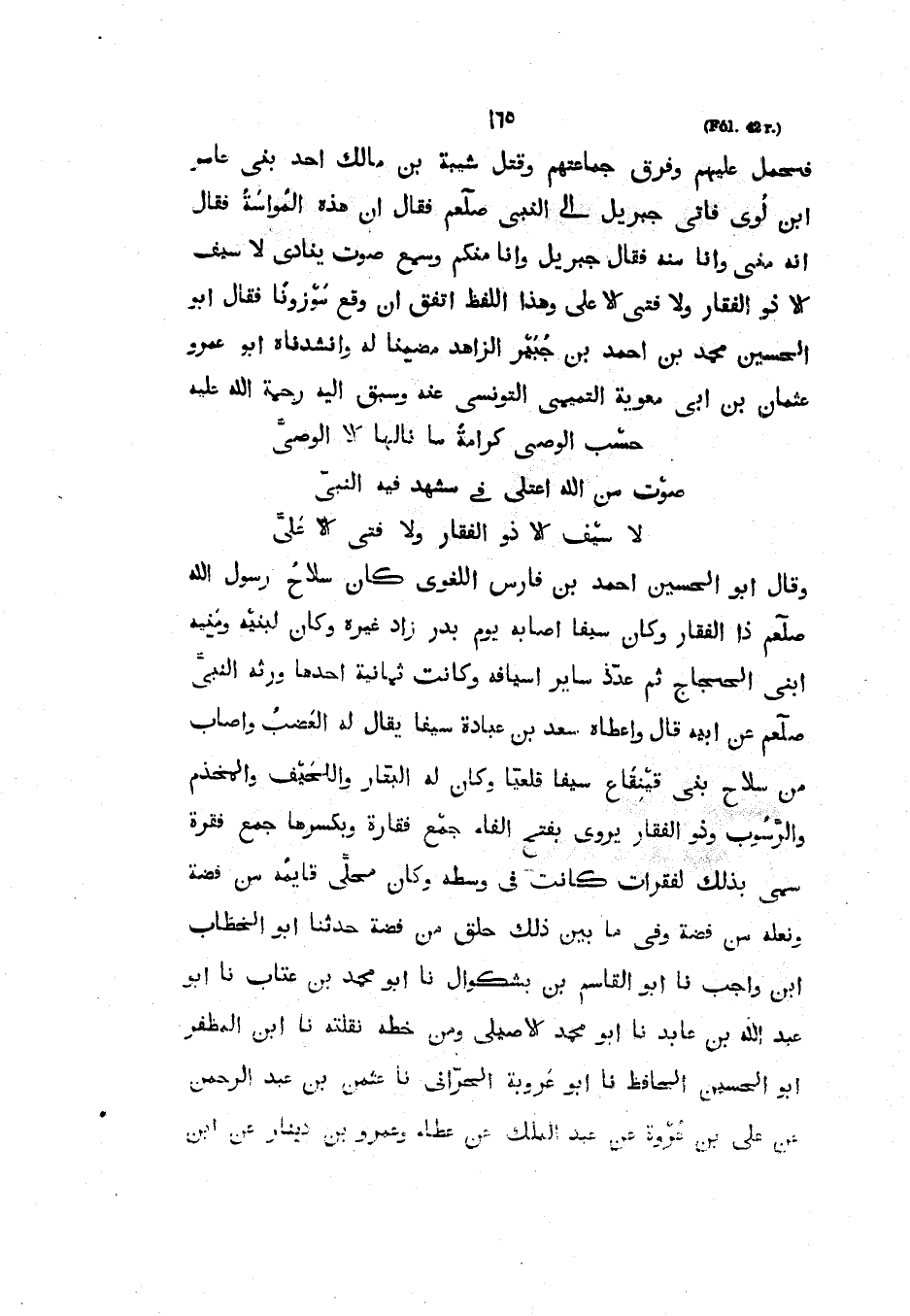 وَقَالَ أَبُو الْحُسَيْنِ أَحْمَدُ بْنُ فَارِسٍ اللُّغَوِيُّ كَانَ سِلاحُ رَسُولِ اللَّهِ صَلَّى اللَّهُ عَلَيْهِ وَسَلَّمَ ذَا الْفَقَارِ وَكَانَ سَيْفًا أَصَابَهُ يَوْمَ بَدْرٍ زَادَ غَيْرُهُ وكان لبنيه ومنيه أبي الحجاج ثم عدد ساير أَسْيَافِهِ وَكَانَتْ ثَمَانِيَةً أَحَدَهَا وَرِثَهُ النَّبِيُّ صَلَّى اللَّهُ عَلَيْهِ وَسَلَّمَ عَنْ أَبِيهِ قَالَ وَأَعْطَاهُ سَعْدُ بْنُ عُبَادَةَ سَيْفًا يُقَالُ لَهُ العَضْبُ وأصاب من سلاح بني قينقاع سيفا قلعيا وكان له البتار واللحيف والمخدم وَالرَّسُوبُ وَذُو الْفَقَارِ يُرْوَى بِفَتْحِ الْفَاءِ جَمْعُ فَقَارَةٍ وَبِكَسْرِهَا جَمْعُ فَقْرَةٍ سُمِّيَ بِذَلِكَ لِفَقَرَاتٍ كانت في وسطه وكان محلى قايمة مِنْ فِضَّةٍ وَنَعْلُهُ مِنْ فِضَّةٍ وَفِي مَا بَيْنَ ذَلِكَ حَلَقٌ مِنْ فِضَّةٍ حَدَّثَنَا أَبُو الخطاب ابن وَاجِبٍ نا أَبُو الْقَاسِمِ بْنُ بَشْكُوَالَ نا أَبُو مُحَمَّدِ بْنُ عَتَّابٍ نا أَبُو عَبْدِ الله بن عابد أَبُو مُحَمَّدٍ الأَصِيلِيُّ وَمِنْ خَطِّه نَقَلْتُهُ نا ابْنُ الْمُظَفَّرِ أَبُو الْحُسَيْنِ الْحَافِظُ نا أَبُو عروبة الحراني نا عثمن بْنُ عَبْدِ الرَّحْمَنِ عَنْ عَلِيِّ بْنِ عُرْوَةَ عَنْ عَبْدِ الْمَلِكِ عَنْ عَطَاءٍ وَعَمْرِو بْنِ دِينَارٍ عَنْ ابْنِ