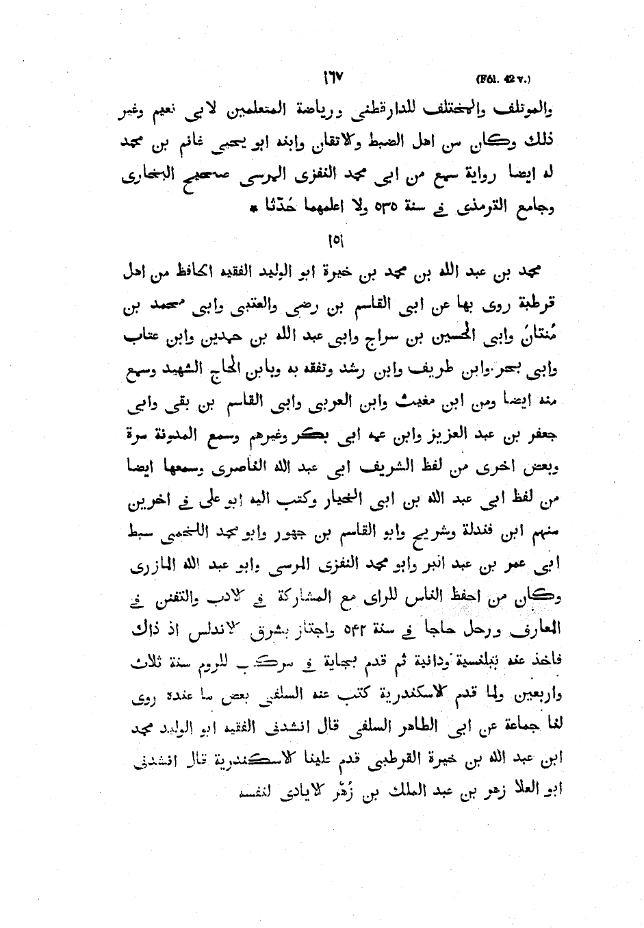 والموتلف والمختلف للدار قطني وَرِيَاضَةَ الْمُتَعَلِّمِينَ لأَبِي نُعَيْمٍ وَغَيْرَ ذَلِكَ وَكَانَ مِنْ أَهْلِ الضَّبْطِ وَالإِتْقَانِ وَابْنُهُ أَبُو يَحْيَى غَانِمُ بْنُ مُحَمَّدٍ لَهُ أَيْضًا رِوَايَةٌ سَمِعَ مِنْ أَبِي مُحَمَّدٍ النِّفَرِيِّ الْمُرْسِيِّ صَحِيحَ الْبُخَارِيِّ وجامع الترمذي في سنة 535 ولا اعلمها حَدَّثَا.