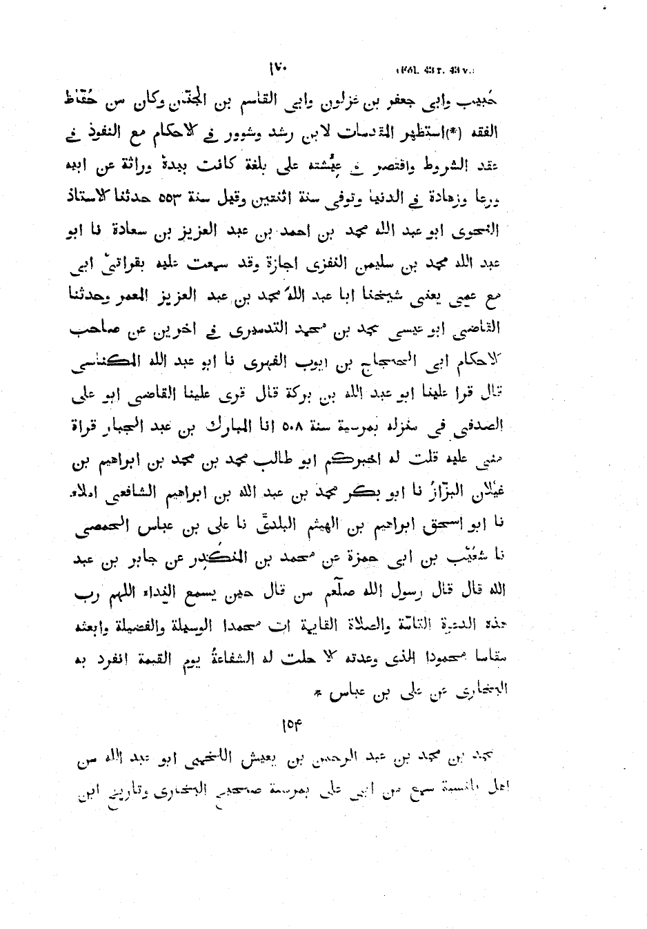 حَبِيبٍ وَأَبِي جَعْفَرِ بْنِ غَزْلُونٍ وَأَبِي الْقَاسِمِ بْنِ الْجَنَّانِ وَكَانَ مِنْ حُفَّاظِ الْفِقْهِ اسْتَظْهَرَ المقدمات لابْنِ رُشْدٍ وَشُووِرَ فِي الأَحْكَامِ مَعَ النُّفُوذِ فِي عَقْدِ الشُّرُوطِ وَاقْتَصَرَ فِي عِيشَتِهِ عَلَى بلغة كانت بيده وراثة عن أبيه وربما وَزَهَادَةً فِي الدُّنْيَا وَتُوُفِّيَ سَنَةَ اثْنَتَيْنِ وَقِيلَ سَنَةَ 553 حَدَّثَنَا الأُسْتَاذُ النَّحْوِيُّ أَبُو عَبْدِ اللَّهِ مُحَمَّدُ بْنُ أَحْمَدَ بْنِ عَبْدِ الْعَزِيزِ بْنِ سَعَادَةَ نا أَبُو عَبْدِ اللَّهِ مُحَمَّدُ بْنُ سليمان النفري أجازة وقد سمعت عليه بقراتي أَبِي مَعَ عَمِّي يَعْنِي شَيْخَنَا أَبَا عَبْدِ اللَّهِ مُحَمَّدَ بْنَ عَبْدِ الْعَزِيزِ الْمُعَمَّرَ وَحَدَّثَنَا الْقَاضِي أَبُو عِيسَى مُحَمَّدَ بْنَ مُحَمَّدٍ التَّدْمِيرِيُّ فِي آخَرِينَ عَنْ صَاحِبِ الأَحْكَامِ أَبِي الْحَجَّاجِ بْنِ أَيُّوبَ الْفِهْرِيِّ نا أَبُو عَبْدِ اللَّهِ المكناسي قال قرأ علينا أبلو عبد الله بن بركة قال قرى عَلَيْنَا الْقَاضِي أَبُو عَلِيٍّ الصَّدَفِيُّ فِي مَنزِلِهِ بِمُرْسِيَّةَ سَنَةَ 508 أَنَا الْمُبَارَكُ بْنُ عَبْدِ الْجَبَّارِ قراة مني عليه لَهُ أَخْبَرَكُمْ أَبُو طَالِبٍ مُحَمَّدُ بْنُ مُحَمَّدِ بن إبراهيم بن غيلان البزاز نا أَبُو بَكْرٍ مُحَمَّدُ بْنُ عَبْدِ اللَّهِ بن إبراهيم الشافعي إملاء نا أبو إسحق إبراهيم الشافعي بْنُ الْهَيْثَمِ الْبَلَدِيُّ نا عَلِيُّ بْنُ عَبَّاسٍ الْحِمْصِيُّ نا شُعَيْبُ بْنُ أَبِي حَمْزَةَ عَنْ مُحَمَّدِ بْنِ الْمُنْكَدِرِ عَنْ جَابِرِ بْنِ عَبْدِ اللَّهِ قَالَ قَالَ رَسُولُ اللَّهِ صَلَّى اللَّهُ عَلَيْهِ وَسَلَّمَ مَنْ قَالَ حِينَ يَسْمَعُ النِّدَاءَ اللَّهُمَّ رَبِّ هَذِهِ الدَّعْوَةِ التَّامَّةِ وَالصَّلاةِ الْقَائِمَةِ أتي مُحَمَّدًا الْوَسِيلَةَ وَالْفَضِيلَةَ وَابْعَثْهُ مَقَامًا مَحْمُودًا الَّذِي وَعَدْتَهُ إِلا حَلَّتْ لَهُ الشَّفَاعَةُ يَوْمَ الْقِيَامَةِ انْفَرَدَ بِهِ الْبُخَارِيُّ عَنْ عَلِيِّ بْنِ عَبَّاسٍ