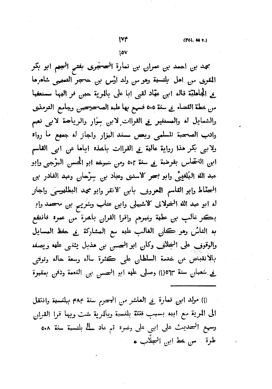 مُحَمَّدُ بْنُ أَحْمَدَ بْنِ عِمْرَانَ بْنِ نمَارَةَ الحجري بفتح الجيم أبو بكر المقري مِنْ أَهْلِ بَلَنْسِيَةَ وَهُوَ مِنْ وَلَدِ أَوْسِ بْنِ حَجَرٍ التَّمِيمِيِّ شَاعِرِهَا فِي الْجَاهِلِيَّةِ قَالَهُ ابْنُ عَيَّادٍ لَقِيَ أَبَا عَلِيٍّ بِالْمَرِيَّةِ حِينَ فر إليها مستعينا مِنْ خُطَّةِ الْقَضَاءِ فِي سَنَةِ 505 فَسَمِعَ بِهَا عليها الصحيحين وجامع الترمذي والشمايل له والمستنير في القراات لابْنِ سِوَارٍ وَالرِّيَاضَةَ لأَبِي نُعَيْمٍ وَأَدَبَ الصُّحْبَةِ لِلسُّلَمِيِّ وَبَعْضَ مُسْنَدِ الْبَزَّارِ وَأَجَازَ لَهُ جَمِيعَ مَا رَوَاهُ وَلأَبِي بَكْرٍ هَذَا رِوَايَةٌ عَالِيَةٌ في القراات بأخذه إياها عن أبي القاسم بن النَّخَّاسِ بِقُرْطُبَةَ فِي سَنَةِ 502 وَمِنْ شُيُوخِهِ أَبُو الحسن البرجي وأبو عبد الله البلغي وَأَبُو بَحْرٍ الأَسَدِيُّ وَعَبَّادُ بْنُ سِرْحَانَ وَعَبْدُ الْقَادِرِ بْنُ الْحَنَّاطِ وَأَبُو الْقَاسِمِ الْمَعْرُوفُ بِابْنِ الأَنْقَرِ وَأَبُو مُحَمَّدٍ الْبَطَلْيَوْسِيُّ وَأَجَازَ لَهُ أَبُو عَبْدِ اللَّهِ الْخَوْلانِيُّ الإِشْبِيلِيُّ وَابْنُ عَتَّابٍ وَشُرَيْحُ بْنُ مُحَمَّدٍ وَأَبُو بَكْرٍ غَالِبُ بْنُ عَطِيَّةَ وَغَيْرُهُمْ وَأَقْرَأَ الْقُرْآنَ بِآخِرَةٍ مِنْ عُمْرِهِ فَانْتَفَعَ بِهِ النَّاسُ وَهُوَ كَانَ الْغَالِبَ عَلَيْهِ مَعَ المشاركة في حفظ المسايل وَالْوُقُوفِ عَلَى الْخِلافِ وَكَانَ أَبُو الْحَسَنِ بْنُ هُذَيْلٍ يُثْنِي عَلَيْهِ وَيَصِفُهُ بِالانْقِبَاضِ عَنْ خِدْمَةِ السُّلْطَانِ عَلَى كَثْرَةِ مَالِهِ وَسِعَةِ حَالِهِ وَتُوُفِّيَ فِي شَعْبَانَ سَنَةَ 563 وَصَلَّى عَلَيْهِ أَبُو الْحَسَنِ بن النعمة ودفن بقبرة