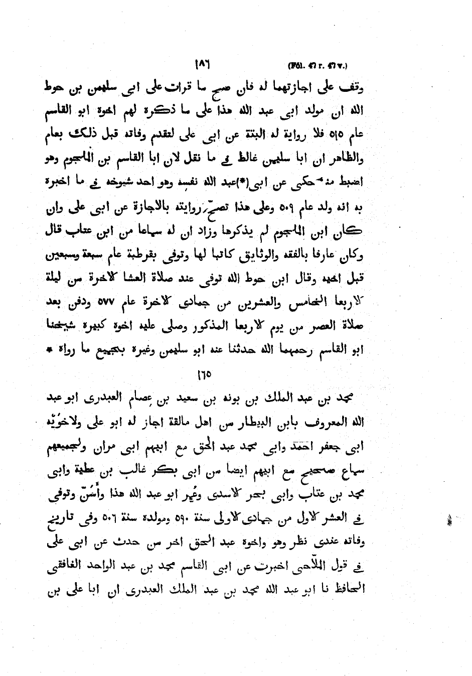 وقف على إجازتهما له فإن صح ما قرأت عَلَى أَبِي سُلَيْمَانَ بْنِ حَوْطِ اللَّهِ أَنَّ مَوْلِدَ أَبِي عَبْدِ اللَّهِ هَذَا عَلَى مَا ذَكَرَهُ لَهُمْ أَخُوهُ أَبُو الْقَاسِمِ عَامَ 515 فَلا رِوَايَةَ لَهُ الْبَتَةَ عَنْ أَبِي عَلِيٍّ لِتَقَدُّمِ وَفَاتِهِ قَبْلَ ذَلِكَ بِعَامٍ وَالظَّاهِرُ أَنَّ أَبَا سُلَيْمَانَ غَالَطَ فِي مَا نَقَلَ لأَنَّ أَبَا الْقَاسِمِ بْنَ الْمَلْجُومِ وَهُوَ أَضْبَطُ مِنْهُ حَكَى عَنْ أَبِي عَبْدِ اللَّهِ نَفْسِهِ وَهُوَ أَحَدُ شُيُوخِهِ فِي مَا أَخْبَرَهُ بِهِ أَنَّهُ وُلِدَ عَامَ 509 وَعَلَى هَذَا تَصِحُّ رِوَايَتُهُ بِالإِجَازَةِ عَنْ أَبِي عَلِيٍّ وَإِنْ كَانَ ابْنُ الْمَلْجُومِ لَم يَذْكُرْهَا وَزَادَ أَنَّ لَهُ سَمَاعًا مِنِ ابْنِ عَتَّابٍ قَالَ وَكَانَ عَارِفًا بِالْفِقْهِ وَالْوَثَائِقِ كَاتِبًا لَهَا وَتُوُفِّيَ بِقُرْطُبَةَ عَامَ سَبْعَةٍ وَسَبْعِينَ قَبْلَ أَخِيهِ وَقَالَ ابْنُ حَوْطِ اللَّهِ تُوُفِّيَ عِنْدَ صلاة العشا الآخرة من ليلة الأربعا الْخَامِسِ وَالْعِشْرِينَ مِنْ جُمَادَى الآخِرَةِ عَامَ 557 وَدُفِنَ بعد صلاة العصر من يوم الأربعا الْمَذْكُورِ وَصَلَّى عَلَيْهِ أَخُوهُ كَبِيرُهُ شَيْخُنَا أَبُو الْقَاسِمِ رَحِمَهُمَا اللَّهُ حَدَّثَنَا عَنْهُ أَبُو سُلَيْمَانَ وَغَيْرُهُ بِجَمِيعِ مَا رَوَاهُ.