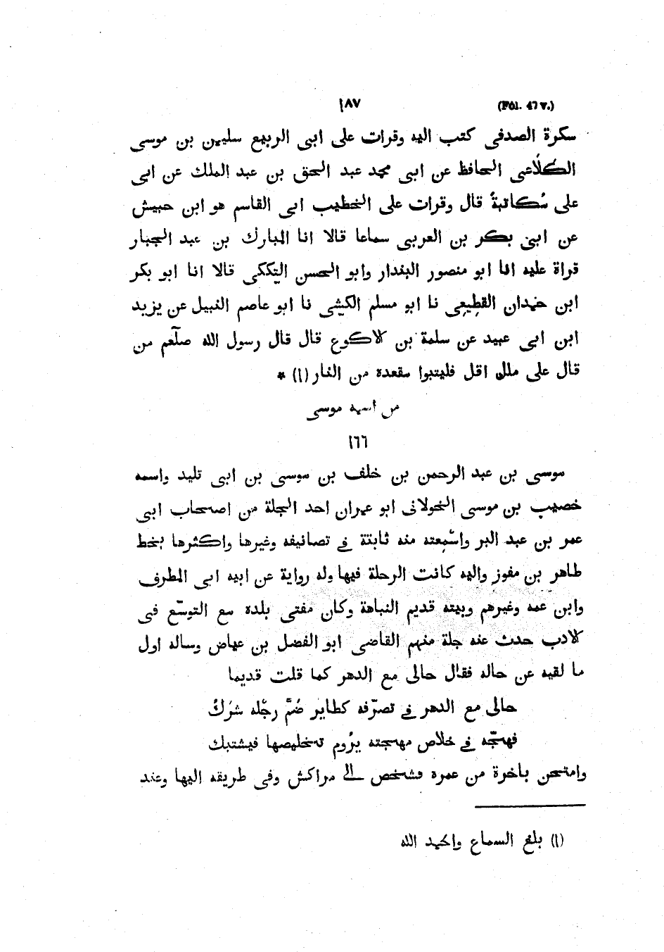 سُكَّرَةَ الصَّدَفِيَّ كَتَبَ إِلَيْهِ وَقَرَأْتُ عَلَى أَبِي الربيع سليمان بن موسى الكالعي الْحَافِظِ عَنْ أَبِي مُحَمَّدٍ عَبْدِ الْحَقِّ بْنِ عَبْدِ الْمَلِكِ عَنْ أَبِي عَلِيٍّ مُكَاتَبَةً قَالَ وَقَرَأْتُ عَلَى الْخَطِيبِ أَبِي الْقَاسِمِ هُوَ ابْنُ حُبَيْشٍ عَنْ أَبِي بَكْرِ بْنِ الْعَرَبِيِّ سَمَاعًا قالا أنا المبارك بن عبد الجبار قراة عليه أنا أبو منصور البندار وأبو الحسن التككي قالا أنا أبو بكر ابن حَمْدَانَ الْقَطِيعِيُّ نا أَبُو مُسْلِمٍ الْكَشِّيُّ نا أبو عاصم النبيل عن يزيد ابن أَبِي عُبَيْدٍ عَنْ سَلَمَةَ بْنِ الأَكْوَعِ قَالَ قَالَ رَسُولُ اللَّهِ صَلَّى اللَّهُ عَلَيْهِ وَسَلَّمَ من قال على ملك أَقُلْ فَلْيَتَبَوَّأْ مَقْعَدَهُ مِنَ النَّارِ.