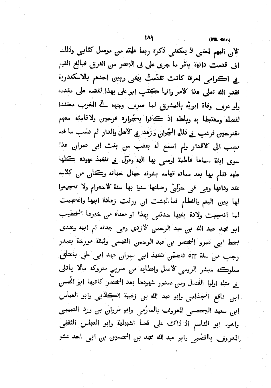 لأن إِلَيْهِمْ لِمَعْنًى لا يُمْكِنُنِي ذِكْرُهُ رُبَّمَا عَلِمْتَهُ مِنْ مُوَصِّلِ كِتَابِي وَذَلِكَ أَنِّي قَدِمْتُ دَانِيَةَ بِأَثَرِ مَا جَرَى عَلَيَّ فِي الْبَحْرِ مِنَ الْغَرَقِ فَبَالَغَ الْقَوْمُ فِي إِكْرَامِي لِمَعْرِفَةٍ كَانَتْ تَقَدَّمَتْ بَيْنِي وَبَيْنَ أَحَدِهِمْ بِالإِسْكَنْدَرِيَّةِ فَقَدَّرَ اللَّهُ تَعَالَى هَذَا الأَمْرَ وَإِنَّمَا كَتَبَ أَبُو عَلِيٍّ بِهَذَا لِنَدَمِهِ عَلَى مَقْدَمِهِ وَلَوْ عَرَفَ وَفَاةَ أبويه بالمشرق لما صرف وجهه إلى الغرب معتقدا لفضله ومغتضبا به وبأهله إذ كانوا بجواره فرحين ولا قامته مَعَهُمْ مُقْتَرِحِينَ فَرَغِبَ فِي ذَلِكَ الْجَوَانِ وَزَهِدَ فِي الأَهْلِ وَالدَّارِ ثُمَّ نَسَبَ مَا فِيهِ نسب إِلَى الأَقْدَارِ وَلَمْ أَسْمَعْ لَهُ بِعَقِبٍ مِنْ بِنْتِ أَبِي عِمْرَانَ هَذَا سِوَى ابْنَةٍ سَمَّاهَا فَاطِمَةَ أَوْصَى بِهَا إِلَيْهِ وَعَوَّلَ فِي تَنْفِيذِ عُهُودِهِ كُلِّهَا عَلَيْهِ فَقَامَ بِهَا بَعْدَ مَمَاتِهِ قيامه بشونة حِيَالَ حَيَاتِهِ وَكَانَ مِنْ كَلامِهِ عِنْدَ وَدَاعِهَا وهي في حولها رَضَاعِهَا سُنُّوا بِهَا سُنَّةَ الاحْتِرَامِ وَلا تُجْمِعُوا لَهَا بَيْنَ الْيُتْمِ وَالْفِطَامِ فَمَا لَبِثَتْ أَنْ وَرِثَتْ زَهَادَةَ أَبِيهَا وَأُعْجِبْتُ لَمَّا أَنْجَبَتْ وِلادَةَ بَنِيهَا حَدَّثَنِي بِهَذَا أَوْ مَعْنَاهُ مِنْ خَبَرِهَا الْخَطِيبُ أَبُو مُحَمَّدٍ عَبْدُ اللَّهِ بْنُ عَبْدِ الرَّحْمَنِ الْأزْدِيُّ وَهِيَ جَدَّتُهُ أُمُّ أَبِيهِ وَعِنْدِي بِخَطِّ أَبِي عَمْرٍو الْخَضِرِ بْنِ عَبْدِ الرَّحْمَنِ القيسي وثيقة مورخة بِصَدْرِ رَجَبٍ مِنْ سَنَةِ 522 تَتَضَمَّنُ تَنْفِيذَ أَبِي سمران عَهْدِ أَبِي عَلِيٍّ بِإِعْتَاقِ مَمْلُوكِهِ مُبَشِّرٍ الرُّومِيِّ الأصل وأعطايه مِنْ صَرِيحِ مَتْرُوكِهِ مَالا يَأْتَلِي فِي مِثْلِهِ أُولُوا الْفَضْلِ وَمِنْ صُدُورِ شُهُودِهَا بَعْدَ الْخَضِرِ كاتبها أبو الحسن ابن نَافِعٍ الْجُذَامِيُّ وَأَبُو عَبْدِ اللَّهِ بْنُ زُغَيْبَةَ الكلابي وأبو العباس ابن سَعِيدٍ الْيَحْصِبِيُّ الْمَعْرُوفُ بِالْمَارُمِيِّ وَأَبُو مَرْوَانَ بْنُ وَرْدٍ التَّمِيمِيُّ وَأَخُوهُ أَبُو الْقَاسِمِ إِذْ ذَاكَ على قضا إِشْبِيلِيَةَ وَأَبُو الْعَبَّاسِ الثَّقَفِيُّ الْمَعْرُوفُ بِالْقَصَبِيِّ وَأَبُو عَبْدِ اللَّهِ مُحَمَّدُ بْنُ الْحُسَيْنِ بْنِ أَبِي أحد عشر