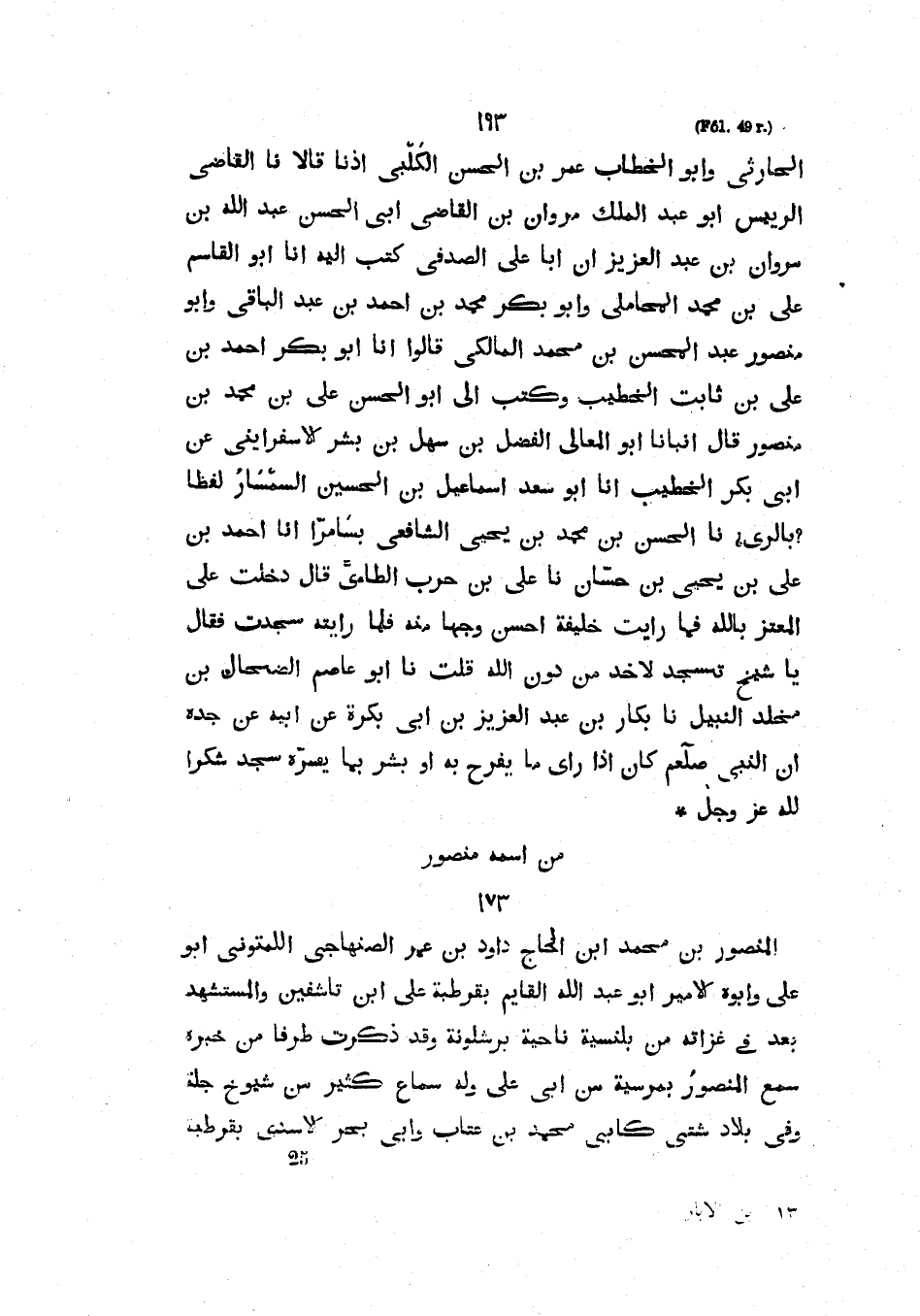 الْحَارِثِيُّ وَأَبُو الْخَطَّابِ عُمَرُ بْنُ الْحَسَنِ الْكَلْبِيُّ أذنا قالا نا القاضي الربيس أَبُو عَبْدِ الْمَلِكِ مَرْوَانُ بْنُ الْقَاضِي أَبِي الْحَسَنِ عَبْدِ اللَّهِ بْنِ مَرْوَانَ بْنِ عَبْدِ الْعَزِيزِ أَنَّ أَبَا عَلِيٍّ الصَّدَفِيَّ كَتَبَ إِلَيْهِ أنا أَبُو الْقَاسِمِ عَلِيُّ بْنُ مُحَمَّدٍ الْمَحَامِلِيُّ وَأَبُو بَكْرٍ مُحَمَّدُ بْنُ أَحْمَدَ بْنِ عَبْدِ الْبَاقِي وَأَبُو مَنْصُورٍ عَبْدُ الْمُحْسِنِ بْنُ مُحَمَّدٍ الْمَالِكِيُّ قَالُوا أَنَا أَبُو بَكْرٍ أَحْمَدُ بْنُ عَلِيِّ بْنِ ثَابِتٍ الْخَطِيبُ وَكَتَبَ إِلَى أَبُو الْحَسَنِ عَلِيُّ بْنُ مُحَمَّدِ بْنِ مَنْصُورٍ قَالَ أَنْبَانَا أَبُو الْمَعَالِي الْفَضْلُ بْنُ سَهْلِ بْنِ بشر الأسفرايني عَنْ أَبِي بَكْرٍ الْخَطِيبِ أَنَا أَبُو سَعْدٍ إِسْمَاعِيلُ بْنُ الْحُسَيْنِ السِّمْسَارُ لَفْظًا بِالرَّيِّ نا الحسن بن محمد بن يحيى الشافعي بسامرا أَنَا أَحْمَدُ بْنُ عَلِيِّ بْنِ يَحْيَى بْنِ حَسَّانٍ نا عَلِيُّ بْنُ حَرْبٍ الطَّائِيُّ قَالَ دَخَلْتُ عَلَى الْمُعْتَزِّ بِاللَّهِ فَمَا رَأَيْتُ خَلِيفَةً أحسن وجها منه رأيته سجدت فقال يا شيخ تسجد لأخذ مِنْ دُونِ اللَّهِ قُلْتُ نا أَبُو عَاصِمٍ الضحال بْنُ مَخْلَدٍ النَّبِيلُ نا بَكَّارُ بْنُ عَبْدِ الْعَزِيزِ بْنِ أَبِي بَكْرَةَ عَنْ أَبِيهِ عَنْ جَدِّهِ أَنَّ النَّبِيَّ صَلَّى اللهُ عَلَيْهِ وَسَلَّمَ كَانَ إِذَا رَأَى مَا يَفْرَحُ بِهِ أَوْ بشر بما يسره سجد شكرا لله عزوجل.