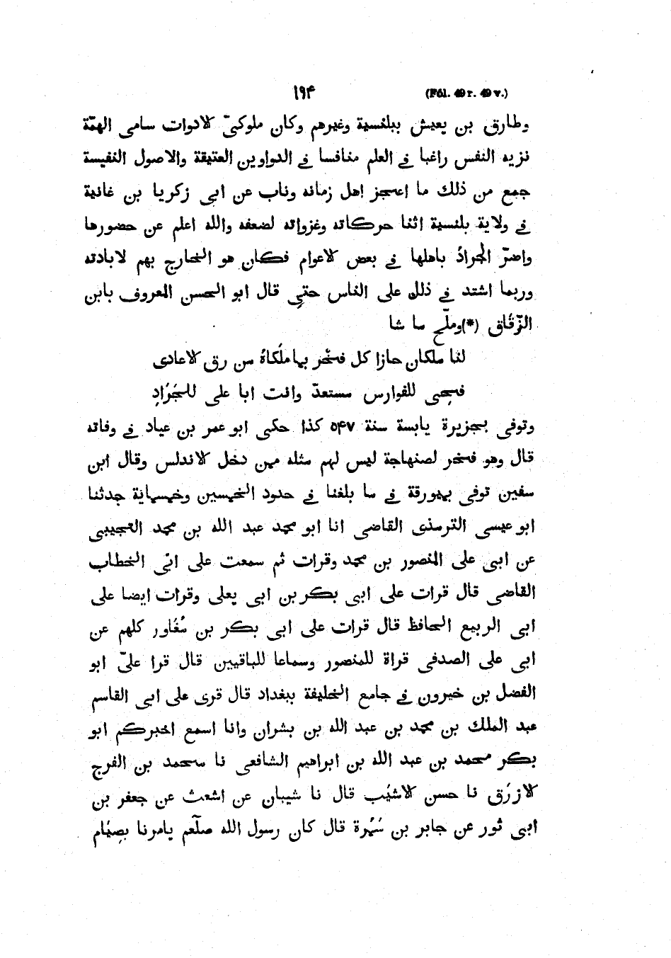 وَتُوُفِّيَ بِجَزِيرَةٍ يَابِسَةٍ سَنَةَ 547 كَذَا حَكَى أَبُو عُمَرَ بْنُ عَيَّادٍ فِي وَفَاتِهِ قَالَ وَهُوَ فَخْرٌ لِصِنْهَاجَةَ لَيْسَ لَهُمْ مِثْلُهُ مِمَّنْ دَخَلَ الأندلس وقال ابن سفين تُوُفِّيَ بِمَيُورْقَةَ فِي مَا بَلَغَنَا فِي حُدُودِ الْخَمْسِينِ وَخَمْسِمِائَةٍ حَدَّثَنَا أَبُو عِيسَى التِّرْمِذِيُّ الْقَاضِي أَنَا أَبُو مُحَمَّدٍ عَبْدُ اللَّهِ بْنُ مُحَمَّدٍ التجيبي عن أبي علي المنصور بمحمد قرأت ثُمَّ سَمِعْتُ عَلَى أَبِي الْخَطَّابِ الْقَاضِي قَالَ قَرَأْتُ عَلَى أَبِي بَكْرِ بْنِ أَبِي يَعْلَى وَقَرَأْتُ أَيْضًا عَلَى أَبِي الرَّبِيعِ الْحَافِظِ قَالَ قَرَأْتُ عَلَى أَبِي بَكْرِ بْنِ مُغَاوِرّ كُلُّهُمْ عن أبي علي الصدفي قراة للمنصور وسماعا للباقيين قَالَ قَرَأَ عَلَيَّ أَبُو الْفَضْلِ بْنُ خَيْرُونَ في جامع الخليفة ببغداد قرى عَلَى أَبِي الْقَاسِمِ عَبْدِ الْمَلِكِ بْنِ مُحَمَّدِ بْنِ عَبْدِ اللَّهِ بْنِ بِشْرَانَ وَأَنَا أَسْمَعُ أَخْبَرَكُمْ أَبُو بَكْرٍ مُحَمَّدُ بْنُ عَبْدِ اللَّهِ بْنِ إِبْرَاهِيمَ الشَّافِعِيُّ نَا مُحَمَّدُ بْنُ الْفَرَجِ الأَزْرَقُ نا حَسَنٌ الأَشْيَبُ قَالَ نَا شَيْبَانُ عَنْ أَشْعَثَ عَنْ جَعْفَرِ بْنِ أَبِي ثَوْرٍ عَنْ جَابِرِ بْنِ سَمُرَةَ قَالَ كَانَ رَسُولُ اللَّهِ صَلَّى اللهُ عَلَيْهِ وَسَلَّمَ يَأْمُرُنَا بِصِيَامِ