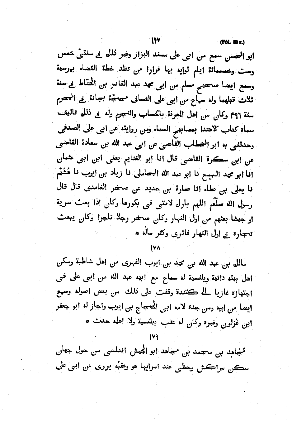 أَبُو الْحَسَنِ سَمِعَ مِنْ أَبِي عَلِيٍّ مِسْنَدَ الْبَزَّارِ وَغَيْرَ ذَلِكَ فِي سَنَتَيْ خَمْسٍ وَسِتٍّ وخمسمائة أيام ثوايه بِهَا فِرَارًا مِنْ تَقَلُّدِ خِطَّةِ الْقَضَاءِ بِمُرْسِيَّةَ وَسَمِعَ أَيْضًا صَحِيحَ مُسْلِمٍ مِنْ أَبِي مُحَمَّدٍ عَبْدِ الْقَادِرِ بْنِ الْحَنَّاطِ فِي سَنَةِ ثَلاثٍ قَبْلَهُمَا وَلَهُ سَمَاعٌ مِنْ أَبِي عَلِيٍّ الْغَسَّانِيِّ مَحَجَّةً بِجَانَةَ فِي الْمُحَرَّمِ سَنَةَ 496 وَكَانَ مِنْ أَهْلِ الْمَعْرِفَةِ بِالْحِسَابِ وَالنُّجُومِ وَلَهُ فِي ذَلِكَ تَأْلِيفٌ سَمَّاهُ كِتَابَ الاهْتِدَاءِ بِمَصَابِيحِ السَّمَاءِ وَمِنْ رِوَايَتِهِ عَنْ أَبِي عَلِيٍّ الصَّدَفِيِّ وَحَدَّثَنِي بِهِ أَبُو الْخَطَّابِ الْقَاضِي عَنْ أَبِي عَبْدِ اللَّهِ بْنِ سَعَادَةَ الْقَاضِي عَنِ ابْنِ سُكَّرَةَ الْقَاضِي قَالَ أَنَا أَبُو الْغَنَايِمِ يَعْنِي ابْنَ أَبِي عُثْمَانَ أَنَا أَبُو مُحَمَّدٍ الْبَيِّعُ نا أَبُو عَبْدِ اللَّهِ الْمَحَامِلِيُّ نَا زِيَادُ بْنُ أَيُّوبَ نَا هُشَيْمٌ نَا يَعْلَى بْنُ عَطَاءٍ أَنَا عُمَارَةُ بْنُ حَدِيدٍ عَنْ صَخْرٍ الْغَامِدِيِّ قَالَ قال رسول الله صلى الله عليه وسلماللهم بارك لأمتي في بكورها وكان إذا بهث سَرِيَّةً أَوْ جَيْشًا بَعَثَهُمْ مِنْ أَوَّلِ النَّهَارِ وكان صخر رجلا تاجرا وكان يبهث تُجَّارَهُ فِي أَوَّلِ النَّهَارِ فَأُثْرِيَ وَكَثُرَ مَالُهُ.