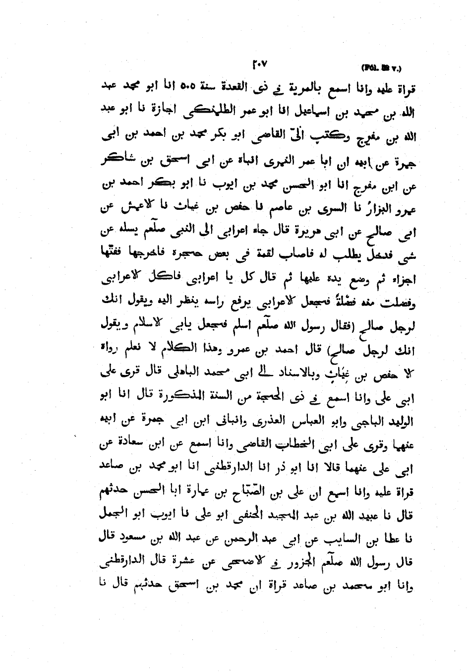وأنا أسمع فِي ذِي الْقَعْدَةِ سَنَةَ 505 أَنَا أَبُو مُحَمَّدٍ عَبْدُ اللَّهِ بْنُ مُحَمَّدِ بْنِ إِسْمَاعِيلَ انا أَبُو عُمَرَ الطَّلَمَنْكِيُّ إِجَازَةً نا أَبُو عَبْدِ اللَّهِ بْنُ مُفَرِّجٍ وَكَتَبَ إِلَيَّ الْقَاضِي أَبُو بكر بْنُ أَحْمَدَ بْنِ أَبِي جَمْرَةَ عَنْ أَبِيهِ أَنَّ أَبَا عُمَرَ النِّمْرِيَّ أَنْبَأَهُ عَنْ أَبِي إسحق بْنِ شَاكِرٍ عَنْ ابْنِ مُفَرِّجٍ أَنَا أَبُو الْحَسَنِ مُحَمَّدُ بْنُ أَيُّوبَ نا أَبُو بَكْرٍ أحمد بن عمرو البزارنا السُّرِّيُّ بْنُ عَاصِمٍ نا حَفْصُ بْنُ غِيَاثٍ نا الأَعْمَشُ عَنْ أَبِي صَالِحٍ عَنْ أَبِي هُرَيْرَةَ قَالَ جَاءَ أَعْرَابِيٌّ إِلَى النَّبِيِّ صَلَّى الله عليه وسلميسله عَنْ شَيْءٍ فَدَخَلَ يَطْلُبُ لَهُ فَأَصَابَ لُقْمَةً فِي بَعْضِ حِجْرِهِ فَأَخْرَجَهَا فَفَتَّهَا أَجْزَاءَ ثُمَّ وَضَعَ يَدَهُ عَلَيْهَا ثُمَّ قَالَ كُلْ يَا أَعْرَابِيُّ فَأَكَلَ الأَعْرَابِيُّ وَفَضَلَتْ مِنْهُ فَضْلَةً فَجَعَلَ الأعرابي يرفع رأسه ينظر إليه ويقول إِنَّكَ لَرَجُلٌ صَالِحِ) فَقَالَ رَسُولُ اللَّهِ صَلَّى اللَّهُ عَلَيْهِ وَسَلَّمَ أَسْلِمْ فَجَعَلَ يَأْبَى الْإسْلَامَ وَيَقُولُ إِنَّكَ لَرَجُلٌ صَالِحٌ (قَالَ أَحْمَدُ بْنُ عَمْرٍو وَهَذَا الْكَلامُ لا نَعْلَمُ رَوَاهُ إِلا حَفْصُ بْنُ غِيَاثٍ وَبِالإِسْنَادِ إِلَى أَبِي مُحَمَّدٍ الباهلي قال قرى عَلَى أَبِي عَلِيٍّ وَأَنَا أَسْمَعُ فِي ذِي الحجة من السنة المذكوة قَالَ أَنَا أَبُو الْوَلِيدِ الْبَاجِيُّ وَأَبُو الْعَبَّاسِ الْعُذْرِيُّ وَأَنْبَأَنِي ابْنُ أَبِي جَمْرَةَ عَنْ أَبِيهِ عنهما وقرى عَلَى أَبِي الْخَطَّابِ الْقَاضِي وَأَنَا أَسْمَعُ عَنِ ابْنِ سَعَادَةَ عَنْ أَبِي عَلِيٍّ عَنْهُمَا قَالا أنا أبو ذر أنا الدارقطني أنا أبو محمد بن صاعد قراة عليها وَأَنَا أَسْمَعُ أَنَّ عَلِيَّ بْنَ الصَّبَّاحِ بْنِ عُمَارَةَ أَبَا الْحَسَنُ حَدَّثَهُمَ قَالَ نَا عُبَيْدُ اللَّهِ بْنُ عَبْدِ الْمَجِيدِ الْحَنَفِيُّ أَبُو عَلِيٍّ نا أيوب أبو الجمل نا عطا بن السايب عَنْ أَبِي عَبْدِ الرَّحْمَنِ عَنْ عَبْدِ اللَّهِ بْنِ مَسْعُودٍ قَالَ قَالَ رَسُولُ اللَّهِ صَلَّى اللَّهُ عَلَيْهِ وَسَلَّمَ الْجَزُورُ فِي الأَضْحَى عَنْ عشرة قال الدارقطني وأنا أبو محمد بن صاعد قراة أن محمد بن إسحق حَدَّثَهُمْ قَالَ نَا