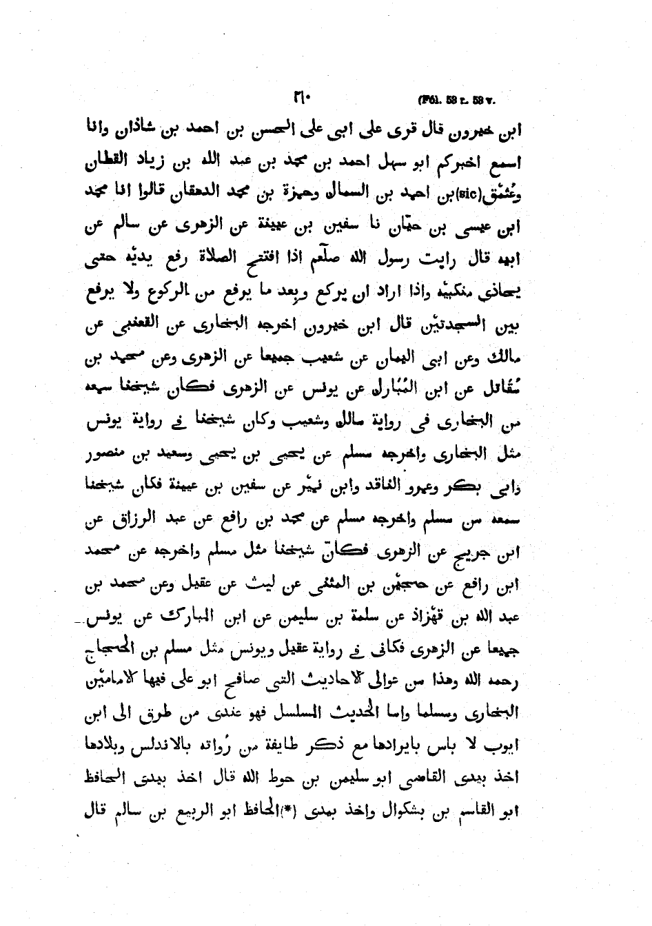 ابن خيرون قال قرى عَلَى أَبِي عَلِيٍّ الْحَسَنِ بْنِ أَحْمَدَ بْنِ شَاذَانَ وَأَنَا أَسْمَعُ أَخْبَرَكُمْ أَبُو سَهْلٍ أَحْمَدُ بْنُ مُحَمَّدِ بْنِ عَبْدِ اللَّهِ بْنِ زِيَادٍ القطان وعثمن بن أحمد بن السمال وَحَمْزَةُ بْنُ مُحَمَّدٍ الدِّهْقَانُ قَالُوا أَنَا مُحَمَّدُ ابن عيسى بن حيان نا سفين بْنُ عُيَيْنَةَ عَنِ الزُّهْرِيِّ عَنْ سَالِمٍ عَنْ أَبِيهِ قَالَ رَأَيْتُ رَسُولَ اللَّهِ صَلَّى اللَّهُ عليه وسلمإذا افْتَتَحَ الصَّلاةَ رَفَعَ يَدَيْهِ حَتَّى يُحَاذِي مَنْكِبَيْهِ وَإِذَا أَرَادَ أَنْ يَرْكَعَ وَبَعْدَ مَا يَرْفَعُ مِنَ الرُّكُوعِ وَلا يَرْفَعُ بَيْنَ السَّجْدَتَيْنِ قَالَ ابْنُ خَيْرُونَ أَخْرَجَهُ الْبُخَارِيُّ عَنِ الْقَعْنَبِيُّ عَنْ مَالِكٍ وَعَنْ أَبِي الْيَمَانِ عَنْ شُعَيْبٍ جَمِيعًا عَنِ الزُّهْرِيِّ وَعَنْ مُحَمَّدِ بْنِ مُقَاتِلٍ عَنِ ابْنِ الْمُبَارَكِ عَنْ يُونُسَ عَنِ الزُّهْرِيِّ فَكَانَ شَيْخُنَا سَمِعَهُ مِنَ الْبُخَارِيِّ فِي رِوَايَةِ مَالِكٍ وَشُعَيْبٍ وَكَانَ شَيْخُنَا فِي رِوَايَةِ يُونُسَ مِثْلَ الْبُخَارِيِّ وَأَخْرَجَهُ مُسْلِمٌ عَنْ يَحْيَى بْنِ يَحْيَى وَسَعِيدِ بْنِ مَنْصُورٍ وَأَبِي بَكْرٍ وَعَمْرٍو النَّاقِدِ وابن نمير عن سفين بْنِ عُيَيْنَةَ فَكَانَ شَيْخُنَا سَمِعَهُ مِنْ مُسْلِمٍ وَأَخْرَجَهُ مُسْلِمٌ عَنْ مُحَمَّدِ بْنِ رَافِعٍ عَنْ عبد الرزاق عن ابن جريح عَنِ الزُّهْرِيِّ فَكَأَنَّ شَيْخَنَا مِثْلُ مُسْلِمٍ وَأَخْرَجَهُ عن محمد ابن رَافِعٍ عَنْ حُجَيْنِ بْنِ الْمُثَنَّى عَنْ لَيْثٍ عَنْ عَقِيلٍ وَعَنْ مُحَمَّدِ بْنِ عَبْدِ اللَّهِ بْنِ قهزاذَ عَنْ سَلَمَةَ بْنِ سُلَيْمَانَ عَنِ ابْنِ الْمُبَارَكِ عَنْ يُونُسَ جَمِيعًا عَنِ الزُّهْرِيِّ فَكَأَنِّيً فِي رِوَايَةِ عَقِيلٍ وَيُونُسَ مِثْلُ مُسْلِمِ بْنِ الْحَجَّاجِ رَحِمَهُ اللَّهُ وَهَذَا مِنْ عَوَالِي الأَحَادِيثِ الَّتِي صَافَحَ أَبُو عَلِيٍّ فِيهَا الإِمَامَيْنِ البخاري ومسلما وأما الحديث المسلسل عندي فهو مِنْ طُرُقٍ إِلَى ابْنِ أَيُّوبَ لا بَأْسَ بإيرادها مع ذكر طايفة مِنْ رُوَاتِهِ بِالأَنْدَلُسِ وَبِلادِهَا أَخَذَ بِيَدِي الْقَاضِي أَبُو سُلَيْمَانَ بْنُ حَوْطِ اللَّهِ قَالَ أَخَذَ بِيَدِي الْحَافِظُ أَبُو الْقَاسِمِ بْنُ بَشْكُوَالَ وَأَخَذَ بِيَدِي الْحَافِظُ أَبُو الرَّبِيعِ بْنُ سَالِمٍ قَالَ