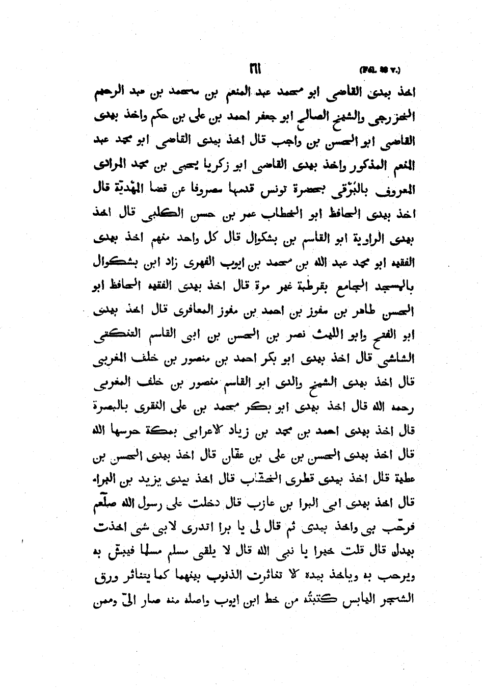 أَخَذَ بِيَدِي الْقَاضِي أَبُو مُحَمَّدٍ عَبْدُ الْمُنْعِمِ بْنُ مُحَمَّدِ بْنِ عَبْدِ الرَّحِيمِ الْخَزْرَجِيُّ وَالشَّيْخُ الصَّالِحُ أَبُو جَعْفَرٍ أَحْمَدُ بْنُ عَلِيِّ بْنِ حَكَمٍ وَأَخَذَ بِيَدِي الْقَاضِي أَبُو الْحَسَنِ بْنُ وَاجِبٍ قَالَ أَخَذَ بِيَدِي الْقَاضِي أَبُو مُحَمَّدٍ عَبْدُ الْمُنْعِمِ الْمَذْكُورُ وَأَخَذَ بِيَدِي الْقَاضِي أَبُو زَكَرِيَّا يَحْيَى بْنُ مُحَمَّدٍ الْمُرَادِيُّ الْمَعْرُوفُ بِالْبَرْقِيِّ بحضرة تونس قدمها مصروفا عن قضا الْمَهْدِيَّةِ قَالَ أَخَذَ بِيَدِي الْحَافِظُ أَبُو الْخَطَّابِ عُمَرُ بْنُ حَسَنٍ الْكَلْبِيُّ قَالَ أَخَذَ بِيَدِي الرِّوَايَةُ أَبُو الْقَاسِمِ بْنُ بَشْكُوَالَ قَالَ كُلُّ وَاحِدٍ مِنْهُمْ أَخَذَ بِيَدِي الْفَقِيهُ أَبُو مُحَمَّدٍ عَبْدِ اللَّهِ بْنِ مُحَمَّدِ بْنِ أَيُّوبَ الْفِهْرِيُّ زَادَ ابْنُ بَشْكُوَالَ بِالْمَسْجِدِ الْجَامِعِ بِقُرْطُبَةَ غَيْرَ مرة قال أخذ بيدي الْحَافِظُ أَبُو الْحَسَنِ طَاهِرُ بْنُ مُفَوِّزِ بْنِ أَحْمَدَ بْنِ مُفَوِّزٍ الْمَعَافِرِيُّ قَالَ أَخَذَ بِيَدِي أَبُو الْفَتْحِ وَأَبُو اللَّيْثِ نَصْرُ بْنُ الْحَسَنِ بْنِ أَبِي الْقَاسِمِ التُّنْكَتِيُّ الشَّاشِيُّ قَالَ أَخَذَ بِيَدِي أَبُو بَكْرٍ أَحْمَدُ بْنُ مَنْصُورِ بْنِ خَلَفٍ الْمَغْرِبِيُّ قَالَ أَخَذَ بِيَدِي الشَّيْخُ وَالِدِي أَبُو الْقَاسِمِ مَنْصُورُ بْنُ خَلَفٍ الْمَغْرِبِيُّ رَحِمَهُ اللَّهُ قَالَ أَخَذَ بِيَدِي أَبُو بَكْرٍ مُحَمَّدُ بْنُ عَلِيٍّ النُّقُرِيُّ بِالْبَصْرَةِ قَالَ أَخَذَ بِيَدِي أَحْمَدُ بْنُ مُحَمَّدِ بْنِ زِيَادٍ الأَعْرَابِيُّ بِمَكَّةَ حَرَسَهَا اللَّهُ قَالَ أَخَذَ بِيَدِي الْحَسَنُ بْنُ عَلِيِّ بْنِ عَفَّانَ قَالَ أَخَذَ بِيَدِي الْحَسَنُ بْنُ عَطِيَّةَ قَالَ أَخَذَ بِيَدِي قِطْرِيٌّ الْخَشَّابُ قَالَ أَخَذ