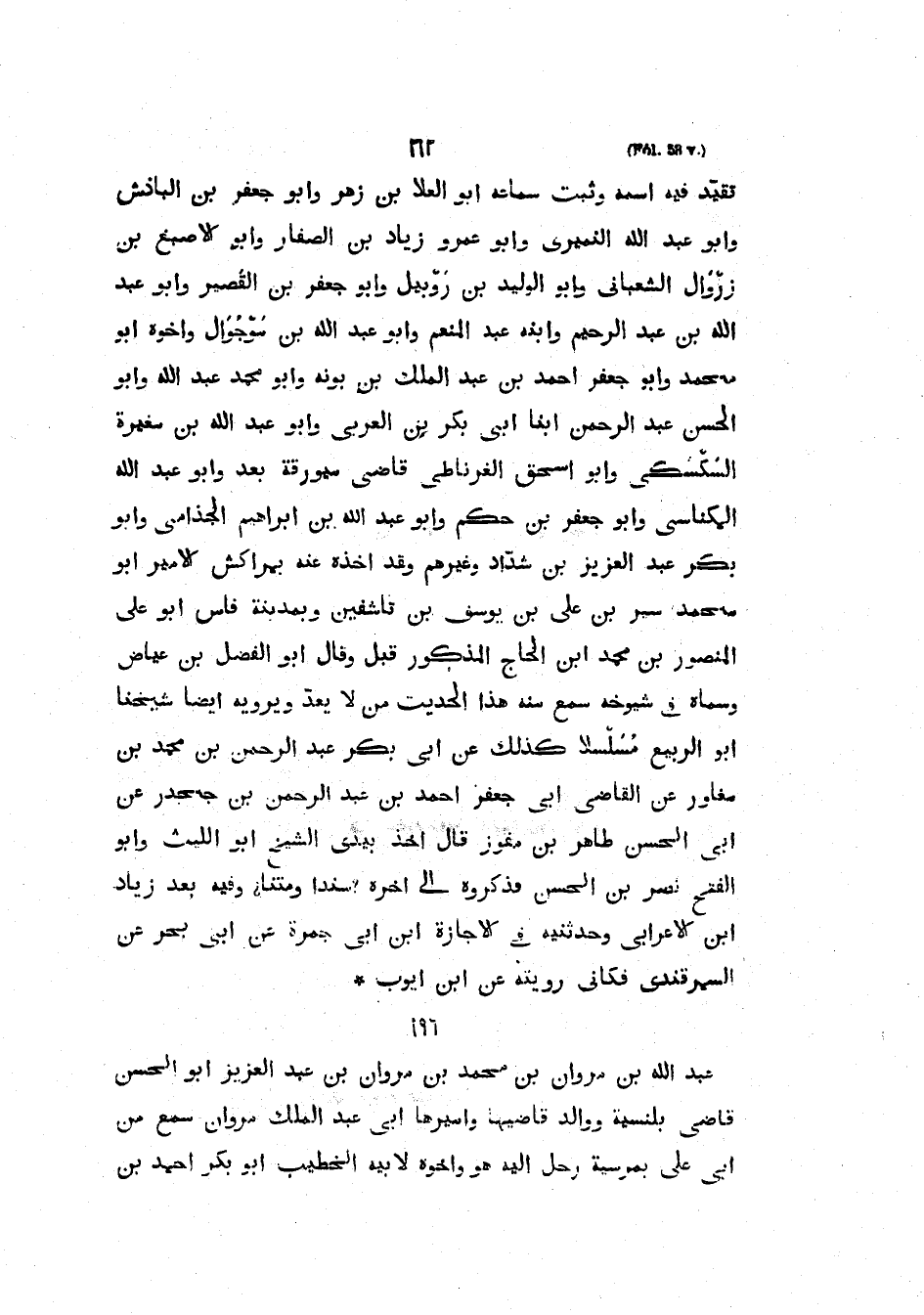 تقيد فيه اسمه وثبت سماعه أبو العلا بن زهر وأبو جعفر بن الباذش وأبو عَبْدِ اللَّهِ النُّمَيْرِيُّ وَأَبُو عَمْرٍو زِيَادُ بْنُ الصَّفَّارِ وَأَبُو الأَصْبَغِ بْنُ زَرْوَالٍ الشَّعْبَانِيُّ وَأَبُو الوليد بن روبيل وأبو جعفر بن الْقَصِيرُ وَأَبُو عَبْدِ اللَّهِ بْنُ عَبْدِ الرَّحِيمِ وَابْنُهُ عَبْدُ الْمُنْعِمِ وَأَبُو عَبْدِ اللَّهِ بْنُ مَوْجُوَالٍ وَأَخُوهُ أَبُو مُحَمَّدٍ وَأَبُو جَعْفَرٍ أَحْمَدُ بْنُ عَبْدِ الْمَلِكِ بْنِ بُونُهْ وَأَبُو مُحَمَّدٍ عَبْدُ اللَّهِ وَأَبُو الْحَسَنِ عَبْدُ الرَّحْمَنِ ابْنَا أَبِي بَكْرِ بْنِ الْعَرَبِيِّ وَأَبُو عَبْدِ اللَّهِ بن مغيرة السكسكي وأبو اسحق الْغَرْنَاطِيُّ قَاضِي مَيُورْقَةَ بَعْدُ وَأَبُو عَبْدِ اللَّهِ الْمَكْنَاسِيُّ وَأَبُو جَعْفَرِ بْنُ حَكَمٍ وَأَبُو عَبْدِ الله بن إبرهيم الْجُذَامِيُّ وَأَبُو بَكْرٍ عَبْدُ الْعَزِيزِ بْنُ شَدَّادٍ وَغَيْرُهُمْ وَقَدْ أَخَذَهُ عَنْهُ بِمَرَاكِشَ الأَمِيرُ أَبُو مُحَمَّدٍ سِيرُ بْنُ عَلِيِّ بْنِ يُوسُفَ بْنِ تَاشْفِينَ وَبِمَدِينَةِ فَاسَ أَبُو عَلِيٍّ الْمَنْصُورُ بْنُ محمد ابن الْحَاجِّ الْمَذْكُورُ قَبْلُ وَقَالَ أَبُو الْفَضْلِ بْنُ عِيَاضٍ وَسَمَّاهُ فِي شُيُوخِهِ سَمِعَ مِنْهُ هَذَا الْحَدِيثَ مِنْ لا يُعَدُّ وَيَرْوِيهِ أَيْضًا شَيْخُنَا أَبُو الرَّبِيعِ مُسَلْسَلا كَذَلِكَ عَنْ أَبِي بَكْرٍ عَبْدِ الرَّحْمَنِ بْنِ مُحَمَّدِ بْنِ مُغَاوِرٍ عَنِ الْقَاضِي أَبِي جَعْفَرٍ أَحْمَدَ بْنِ عَبْدِ الرَّحْمَنِ بْنِ جُحْدُرٍ عَنْ أَبِي الْحَسَنِ طَاهِرِ بْنِ مُفَوِّزٍ قَالَ أَخَذَ بِيَدِي الشَّيْخُ أَبُو اللَّيْثِ وَأَبُو الْفَتْحِ نَصْرُ بْنُ الْحَسَنِ فَذَكَرُوهُ إِلَى آخره سندا ومتناه وفيه بعد زياد ابن الأَعْرَابِيِّ وَحَدَّثَنِيهِ فِي الإِجَازَةِ ابْنُ أَبِي جَمْرَةَ عَنْ أَبِي بَحْرٍ عَنِ السَّمَرْقَنْدِيِّ فَكَأَنِّي رَوَيْتُهُ عَنِ ابْنِ أَيُّوبَ