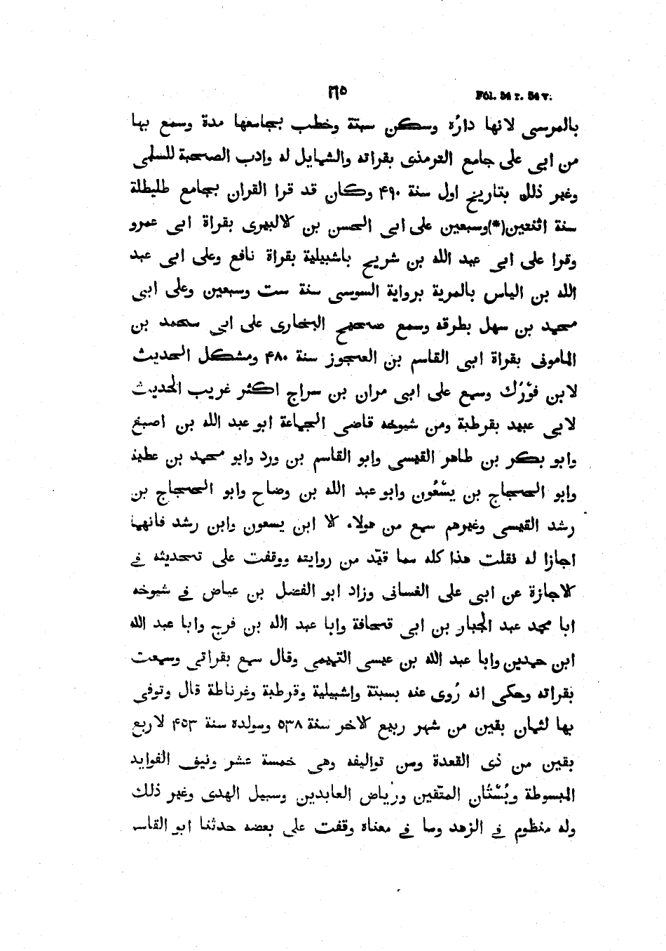 بِالْمِرْسِيِّ لأَنَّهَا دَارُهُ وَسَكَنَ سَبْتَةَ وَخَطَبَ بِجَامِعِهَا مُدَّةً وَسَمِعَ بِهَا مِنْ أَبِي عَلِيٍّ جَامِعَ الترمذي بقراته والشمايل لَهُ وَأَدَبَ الصُّحْبَةِ لِلسُّلَمِيِّ وَغَيْرَ ذَلِكَ بِتَارِيخِ أَوَّلِ سَنَةِ 490 وَكَانَ قَدْ قَرَأَ الْقُرْآنَ بِجَامِعِ طليطلة سنة اثنتين وسبعين على أبا الحسن بن الألبيري بقراة أَبِي عَمْرٍو وَقَرَأَ عَلَى أَبِي عَبْدِ اللَّهِ بن شريح بإشبيلية بقراة نَافِعٍ وَعَلَى أَبِي عَبْدِ اللَّهِ بْنِ إِلْيَاسَ بِالْمَرِيَّةِ بِرِوَايَةِ السُّوسِيِّ سَنَةَ سِتٍّ وَسَبْعِينَ وَعَلَى أَبِي مُحَمَّدِ بْنِ سَهْلٍ بِطُرُقِهِ وَسَمِعَ صَحِيحَ البخاري على أبي محمد بن المأموني بقراة أبي القاسم بن العجز سَنَةَ 480 وَمُشْكِلَ الْحَدِيثِ لابْنِ فَوْرَكٍ وَسَمِعَ عَلَى أَبِي مَرْوَانَ بْنِ سِرَاجٍ أَكْثَرَ غَرِيبِ الْحَدِيثِ لأَبِي عُبَيْدٍ بِقُرْطُبَةَ وَمِنْ شُيُوخِهِ قَاضِي الْجَمَاعَةِ أَبُو عَبْدِ اللَّهِ بْنُ أَصْبَغَ وَأَبُو بَكْرِ بْنُ طَاهِرٍ الْقَيْسِيُّ وَأَبُو الْقَاسِمِ بْنُ وَرْدٍ وَأَبُو مُحَمَّدِ بْنُ عَطِيَّةَ وَأَبُو الْحَجَّاجِ بْنُ يسْعُونَ وَأَبُو عَبْدِ اللَّهِ بْنُ وَضَّاحٍ وَأَبُو الحجاج بن رشد القيسي وغيرهم سمع مِنْ هَؤُلاءِ إِلا ابْنَ يسعون وَابْنَ رُشْدٍ فإنهما أجازا له فقلت هَذَا كُلَّهُ مِمَّا قَيَّدَ مِنْ رِوَايَتِهِ وَوَقَفْتُ عَلَى تَحْدِيثِهِ فِي الإِجَازَةِ عَنْ أَبِي عَلِيٍّ الْغَسَّانِيِّ وَزَادَ أَبُو الْفَضْلِ بْنُ عِيَاضٍ فِي شُيُوخِهِ أَبَا مُحَمَّدٍ عَبْدَ الْجَبَّارِ بْنَ أَبِي قُحَافَةَ وَأَبَا عَبْدِ اللَّهِ بْنَ فَرَجٍ وَأَبَا عبد الله ابن حَمْدِينَ وَأَبَا عَبْدِ اللَّهِ بْنَ عِيسَى التَّمِيمِيَّ وقال سمع بقراتي وسمعت بقراته وَحَكَى أَنَّهُ رُوِيَ عَنْهُ بِسَبْتَةَ وَإِشْبِيلِيَةَ وَقُرْطُبَةَ وَغَرْنَاطَةَ قَالَ وَتُوُفِّيَ بِهَا لِثَمَانٍ بَقِينَ مِنْ شَهْرِ رَبِيعٍ الآخَرِ سَنَةَ 538 وَمَوْلِدُهُ سَنَةَ 453 لأَرْبَعٍ بقين من ذي القعدة ومن تواليفه وهي خمسة عشر ونيف الفوايد الْمَبْسُوطَةُ وَبُسْتَانُ الْمَتَّقَيِّنِ وَرِيَاضُ الْعَابِدِينَ وَسَبِيلُ الْهُدَى وَغَيْرُ ذَلِكَ وَلَهُ مَنْظُومٌ فِي الزُّهْدِ وَمَا فِي مَعْنَاهُ وَقَفْتُ عَلَى بَعْضِهِ حَدَّثَنَا أَبُو القاسم