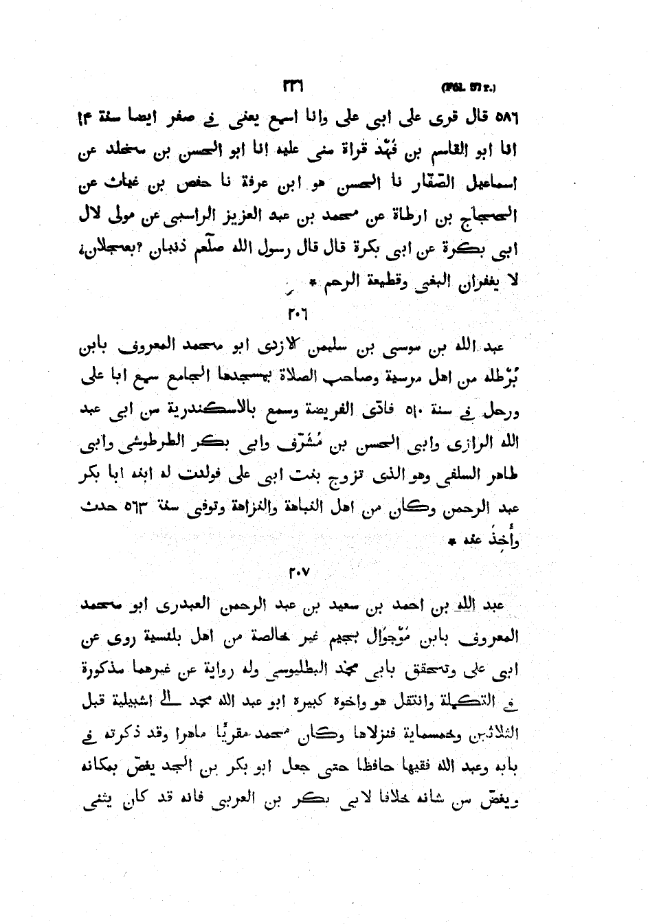 586 قال قرى عَلَى أَبِي عَلِيٍّ وَأَنَا أَسْمَعُ يَعْنِي فِي صَفَرٍ أَيْضًا سَنَةَ 14 أَنَا أَبُو الْقَاسِمِ بْنُ فهد قراة مِنِّي عَلَيْهِ أَنَا أَبُو الْحَسَنِ بْنُ مَخْلَدٍ عَنْ إِسْمَاعِيلَ الصَّفَّارِ نَا الْحَسَنُ هُوَ ابْنُ عَرَفَةَ نَا حَفْصُ بْنُ غِيَاثٍ عَنِ الْحَجَّاجِ بْنِ أَرْطَأَةَ عَنْ مُحَمَّدِ بْنِ عَبْدِ الْعَزِيزِ الراسبي عم مَوْلًى لآلِ أَبِي بَكْرَةَ عَنْ أَبِي بَكْرَةَ قَالَ قَالَ رَسُولُ اللَّهِ صَلَّى اللَّهُ عَلَيْهِ وسلم ذنبان بعجلان لا يغفران الْبَغْيُ وَقَطِيعَةُ الرَّحِمِ عَبْدُ اللَّهِ بْنُ مُوسَى بْنِ سُلَيْمَانَ الْأَزْدِيُّ أَبُو مُحَمَّدٍ الْمَعْرُوفُ بِابْنِ بُرْطُلَّةَ مِنْ أَهْلِ مُرْسِيَّةَ وَصَاحِبُ الصَّلاة بِمَسْجِدِهَا الْجَامِعِ سَمِعَ أَبَا عَلِيٍّ وَرَحَلَ فِي سَنَةِ 510 فَأَدَّى الْفَرِيضَةَ وَسَمِعَ بِالإِسْكَنْدَرِيَّةَ مِنْ أَبِي عَبْدِ اللَّهِ الرَّازِيِّ وَأَبِي الْحَسَنِ بْنِ مُشَرَّفٍ وَأَبِي بَكْرٍ الطُّرْطُوشِيِّ وَأَبِي طَاهِرٍ السَّلَفِيِّ وَهُوَ الَّذِي تَزَوَّجَ بِنْتَ أَبِي عَلِيٍّ فَوَلَدَتْ لَهُ ابْنَهُ أَبَا بَكْرٍ عَبْدَ الرَّحْمَنِ وَكَانَ مِنْ أَهْلِ النباهة وَتُوُفِّيَ سَنَةَ 563 حَدَّثَ وَأَخَذَ عَنْهُ عَبْدُ اللَّهِ بْنُ أَحْمَدَ بْنِ سَعِيدِ بْنِ عَبْدِ الرَّحْمَنِ الْعَبْدَرِيُّ أَبُو مُحَمَّدٍ الْمَعْرُوفُ بِابْنِ مَوْجوال بِجِيمٍ غَيْرِ خَالِصَةٍ مِنْ أَهْلِ بَلَنْسِيَةَ رَوَى عَنْ أَبِي عَلِيٍّ وَتَحَقَّقَ بِأَبِي مُحَمَّدٍ الْبَطْلَيُوسِيِّ وَلَهُ رِوَايَةٌ عَنْ غَيْرِهِمَا مَذْكُورَةٌ فِي التَّكْمِلَةِ وَانْتَقَلَ هُوَ وَأَخُوهُ كَبِيرَةُ أَبُو عَبْدِ اللَّهِ مُحَمَّدٌ إلى اشبيلية قبل الثلاثين وخمسماية فنزلاها وكانا محمد مقريا ماهرا وقد ذكرته بمكانه فِي بَابِهِ وَعَبْدُ اللَّهِ فَقِيهًا حَافِظًا حَتَّى جعل أبو بكر بن الجد يغض بِمَكَانِهِ وَيَغُضُّ مِنْ شَأْنِهِ خِلافًا لأَبِي بَكْرِ بْنِ الْعَرَبِيِّ فَإِنَّهُ قَدْ كَانَ يُثْنِي