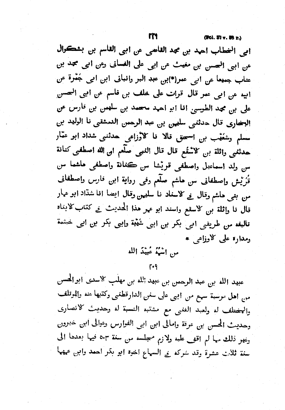 أَبِي الْخَطَّابِ أَحْمَدَ بْنِ مُحَمَّدٍ الْقَاضِي عَنْ أَبِي الْقَاسِمِ بْنِ بَشْكُوَالَ عَنْ أَبِي الْحَسَن بْنِ مُغِيثٍ عَنْ أَبِي عَلِيٍّ الْغسَّانِيِّ وَعَنْ أَبِي مُحَمَّدِ بْنِ عَتَّابٍ جَمِيعًا عَنْ أَبِي عُمَرَ بْنِ عَبْدِ الْبَرِّ وَأَنْبَأَنِي ابْنُ أَبِي جَمْرَةَ عَنْ أَبِيهِ عَنْ أَبِي عُمَرَ قَالَ قَرَأْتُ عَلَى خَلَفِ بْنِ قَاسِمٍ عَنْ أَبِي الْحَسَنِ عَلِيِّ بْنِ مُحَمَّدٍ الطُّوسِيِّ أَنَا أَبُو أَحْمَدَ مُحَمَّدُ بْنُ سُلَيْمَانَ بْنِ فَارِسٍ عَنِ الْبُخَارِيِّ قَالَ حَدَّثَنِي سُلَيْمَانُ بْنُ عَبْدِ الرَّحْمَنِ الدِّمَشْقِيُّ نَا الْوَلِيدُ بْنُ مُسْلِمٍ وَشُعَيْبُ بْنُ اسحق قال نا أوزاعي حدَّثَنِي شَدَّادٌ أَبُو عَمَّارٍ حَدَّثَنِي وَاثِلَةُ بْنُ الأَسْقَعِ قَالَ قَالَ النَّبِيُّ صَلَّى اللَّهُ عَلَيْهِ وَسَلَّمَ إِنَّ اللَّهَ اصْطَفَى كِنَانَةَ مِنْ وَلَدِ إِسْمَاعِيلَ وَاصْطَفَى قُرَيْشًا مِنْ كِنَانَةَ وَاصْطَفَى هَاشِمًا مِنْ قُرَيْشٍ وَاصْطَفَانِي مِنْ هَاشِمٍ صَلَّى اللَّهُ عَلَيْهِ وَسَلَّمَ وَفِي رِوَايَةِ ابْنِ فَارِسٍ وَاصْطَفَانِي مِنْ بَنِي هَاشِمٍ وَقَالَ فِي الإِسْنَادِ نَا سُلَيْمَانُ وَقَالَ أَيْضًا أَنَا شَدَّادٌ أَبُو عَمَّارٍ قَالَ نَا وَاثِلَةُ بْنُ الأَسْقَعِ وَأَسْنَدَ أَبُو عمر هذا الحديث في كتاب الأبناه تَأْلِيفُهُ مِنْ طَرِيقَيْ أَبِي بَكْرِ بْنِ أَبِي شَيْبَةَ وَأَبِي بَكْرِ بْنِ أَبِي خَيْثَمَةَ وَمَدَارُهُ عَلَى الأَوْزَاعِيِّ