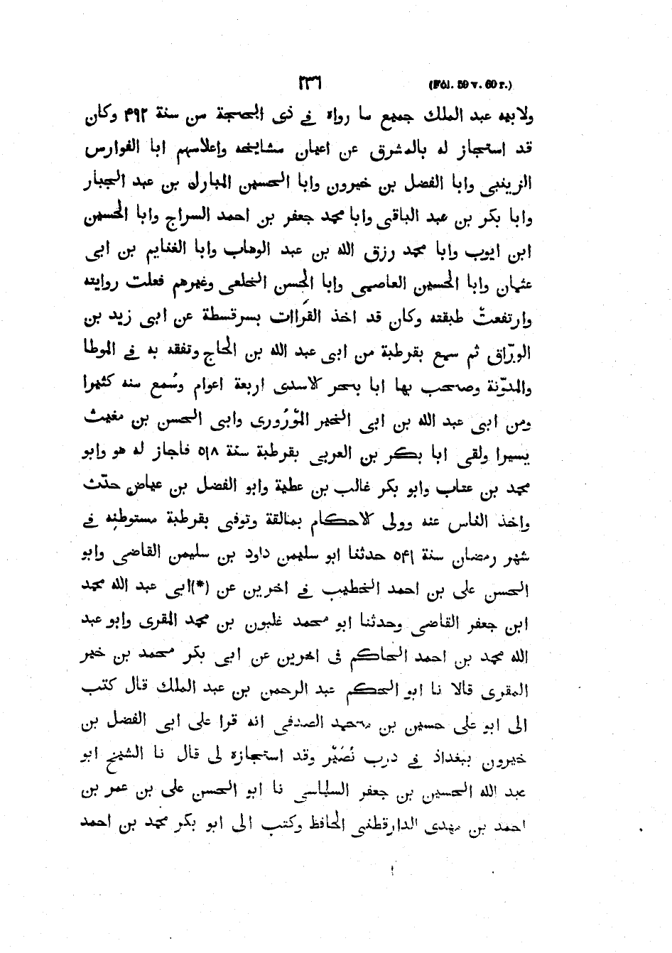 وَلأَبِيهِ عَبْدِ الْمَلِكِ جَمِيعَ مَا رَوَاهُ فِي ذي الحجة من سنة 492 قَدِ اسْتَجَازَ لَهُ بِالْمَشْرِقِ عَنْ أَعْيَانِ مَشَايِخِهِ وَأَعْلامِهِمْ أَبَا الْفَوَارِسِ الزَّيْنَبَّيَ وَأَبَا الْفَضْلِ بْنَ خَيْرُونَ وَأَبَا الْحُسَيْنِ الْمُبَارَكَ بْنَ عَبْدِ الْجَبَّارِ وَأَبَا بَكْرِ بْنَ عَبْدِ الْبَاقِي وَأَبَا مُحَمَّدٍ جعفر بن أحمد السراج وأبا الحسين ابن أَيُّوبَ وَأَبَا مُحَمَّدٍ رِزْقَ اللَّهِ بْنَ عَبْدِ الْوَهَّابِ وَأَبَا الْغَنَايِمِ بْنَ أَبِي عُثْمَانَ وَأَبَا الْحُسَيْنِ الْعَاصِمِيَّ وَأَبَا الْحَسَنِ الْخِلَعِيَّ وَغَيْرَهُمْ فَعَلَتْ روايته وارتفعت طبقته وكان قد أخذ القرات بِسَرَقُسْطَةَ عَنْ أَبِي زَيْدِ بْنِ الْوَرَّاقِ ثُمَّ سَمِعَ بِقُرْطُبَةَ مِنْ أَبِي عَبْدِ اللَّهِ بْنِ الْحَاجِّ وَتَفَقَّهَ بِهِ فِي الْمُوَطَّأِ وَالْمُدَوَّنَةِ وَصَحِبَ بِهَا أَبَا بَحْرٍ الأَسَدِيَّ أَرْبَعَةَ أَعْوَامٍ وَسَمِعَ مِنْهُ كَثِيرًا وَمِنْ أَبِي عَبْدِ اللَّهِ بْنِ أَبِي الْخَيْرِ الْمَوْرُورِيِّ وَأَبِي الْحَسَنِ بْنِ مُغِيثٍ يَسِيرًا وَلَقِيَ أَبَا بَكْرِ بْنَ الْعَرَبِيِّ بِقُرْطُبَةَ سَنَةَ 518 فَأَجَازَ لَهُ هُوَ وَأَبُو مُحَمَّدِ بْنُ عَتَّابٍ وَأَبُو بَكْرٍ غَالِبُ بْنُ عَطِيَّةَ وَأَبُو الْفَضْلِ بْنُ عِيَاضٍ حَدَّثَ وَأَخَذَ النَّاسُ عَنْهُ وَوَلِيَ الأَحْكَامَ بِمَالِقَةَ وَتُوُفِّيَ بِقُرْطُبَةَ مُسْتَوْطَنِهِ فِي شَهْرِ رَمَضَانَ سَنَةَ 541 حَدَّثَنَا أَبُو سُلَيْمَانَ دَاوُدُ بْنُ سُلَيْمَانَ الْقَاضِي وَأَبُو الْحَسَنِ عَلِيُّ بْنُ أَحْمَدَ الْخَطِيبُ فِي آخَرَيْنِ عَنْ أَبِي عَبْدِ الله محمد ابن جَعْفَرٍ الْقَاضِي وَحَدَّثَنَا أَبُو مُحَمَّدٍ غُلْبُونُ بْنُ محمد المقري وَأَبُو عَبْدِ اللَّهِ مُحَمَّدُ بْنُ أَحْمَدَ الْحَاكِمِ فِي آخَرَيْنِ عَنْ أَبِي بَكْرٍ مُحَمَّدِ بْنِ خير المقري قَالا نَا أَبُو الْحَكَمِ عَبْدُ الرَّحْمَنِ بْنُ عَبْدِ الْمَلِكِ قَالَ كَتَبَ إِلَيَّ أَبُو عَلِيٍّ حُسَيْنُ بْنُ مُحَمَّدٍ الصَّدَفِيُّ أَنَّهُ قَرَأَ عَلَى أَبِي الْفَضْلِ بْنِ خَيْرُونَ بِبَغْدَادَ فِي دَرْبِ نُصَيْرٍ وَقَدِ اسْتَجَازَهُ لِي قَالَ نَا الشَّيْخُ أَبُو عَبْدِ اللَّهِ الْحُسَيْنُ بْنُ جَعْفَرٍ السَّلَمَاسِيُّ نَا أَبُو الْحَسَنِ عَلِيُّ بْنُ عُمَرَ بْنِ أحمد بن مهدي الدارقطني الْحَافِظُ وَكَتَبَ إِلَيَّ أَبُو بَكْرٍ مُحَمَّدُ بْنُ أحمد