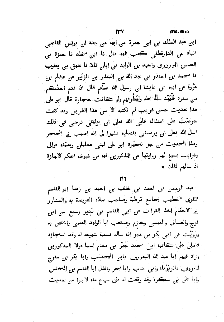ابن عَبْدِ الْمَلِكِ بْنِ أَبِي جَمْرَةَ عَنْ أَبِيهِ عَنْ جَدِّهِ أَنَّ يُونُسَ الْقَاضِي أَنْبَأَهُ عَنِ الدارقطني كَتَبَ إِلَيْهِ قَالَ نَا ابْنُ مَخْلَدٍ نَا حَمْزَةُ بْنُ الْعَبَّاسِ الْمَوْرُورِيُّ وَأَحْمَدُ بْنُ الْوَلِيدِ بْنِ أَبَانٍ قَالا نَا عُتَيْقُ بْنُ يَعْقُوبَ نَا مُحَمَّدُ بْنُ الْمُنْذِرِ بْنِ عَبْدِ اللَّهِ بْنِ الْمُنْذِرِ بْنِ الزُّبَيْرِ عَنْ هِشَامِ بْنِ عروة عن أبيه عن عايشة إِنَّ رَسُولَ اللَّهِ صَلَّى اللَّهُ عَلَيْهِ وَسَلَّمَ قَالَ إِذَا قَدِمَ أَحَدُكُمْ مِنْ سَفَرِهِ فَلْيُهْدِ إلى أهله وليطرفهم وَلَوْ كَانَتْ حِجَارَةً قَالَ أَبُو عَلِيٍّ هَذَا حَدِيثٌ حَسَنٌ غَرِيبٌ لَمْ نَكْتُبْهُ إِلا مِنْ هَذَا الطَّرِيقِ وَقَدْ كُنْتُ حَرَصْتُ عَلَى امْتِثَالِهِ فَأَبَى اللَّهُ تَعَالَى أَنْ يُبْلِغَنِي غَرَضِي فِي ذلك أسئل الله تعالى أن يرضيني بقضايه بَشِيرًا لِي أَنَّهُ أُصِيبَ فِي الْحِجْرِ وَهَذَا الحديث من جز نحيرة أبو علي لبني غشليان وضمنه عوالي وغرايب يَسُوغُ لَهُمْ رِوَايَتُهَا عَنِ الْمَذْكُورِينَ فِيهِ مِنْ شُيُوخِهِ بِحُكْمِ الإِجَازَةِ إِذْ سَأَلَهُمْ ذَلِكَ عَبْدُ الرَّحْمَنِ بْنُ أَحْمَدَ بْنِ خَلَفِ بْنِ أَحْمَدَ بن رضا أبو القاسم المقري الْخَطِيبُ بِجَامِعِ قُرْطُبَةَ وَصَاحِبُ صَلاةِ الْفَرِيضَةِ بِهِ والمشاور في الأحكام أخذ القرات عَنْ أَبِي الْقَاسِمِ بْنِ مُدِيرٍ وَسَمِعَ مِنَ ابْنِ فَرَجٍ وَالْغَسَّانِيِّ وَالْعَبْسِيِّ وَخَازِمٍ وَصَحِبَ أَبَا الْوَلِيدِ الْعُتْبِيَّ وَاخْتَصَّ بِهِ وَرَوَيْتُ عَنْ أَبِي بَكْرِ بْنِ خَيْرٍ أَنَّهُ سَأَلَهُ تَسْمِيَةَ شُيُوخِهِ لَهُ وَقَدِ اسْتَجَازَهُ فَأَمْلَى عَلَى كَاتِبِهِ أَبِي محمد جبر بن هشام اسما هَؤُلَاءِ الْمَذْكُورِينَ وَزَادَ فِيهِمْ أَبَا عَبْدِ اللَّهِ الْمَعْرُوفِ بِابْنِ الْمُحْتَسِبِ وَأَبَا بَكْرِ بْنَ مُفَرَّجٍ الْمَعْرُوفَ بِالربَوْبلةِ وَابْنَ عَتَّابٍ وَأَبَا بَحْرٍ وَأَغْفَلَ أَبَا الْقَاسِمِ بْنَ النَّخَّاسِ وَأَبَا عَلِيِّ بْنَ سُكْرَةَ وَقَدْ وَقَفْتُ لَهُ عَلَى سَمَاعٍ مِنْهُ لا جزا من حديث
