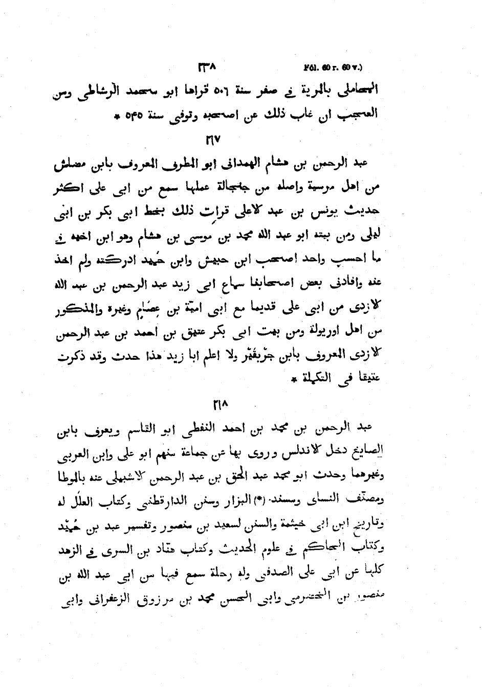 الْمَحَامِلِيِّ بِالْمَرِيَّةِ فِي صَفَرٍ سَنَةَ 560 قَرَأَهَا أَبُو محمد الرشاطي ومن العجب أن غاب ذلك عن أصحبه ويوفي سنة 545 عبد الرحمن بن هشام الهمذاني أَبُو الْمُطَرِّفِ الْمَعْرُوفُ بِابْنِ مضاشٍ مِنْ أَهْلِ مُرْسِيَّةَ وَأَصْلُهُ مِنْ جنجالةَ عَمَلِهَا سَمِعَ مِنْ أَبِي عَلِيٍّ أَكْثَرَ حَدِيثِ يُونُسَ بْنِ عَبْدِ الأَعْلَى قَرَأْتُ ذَلِكَ بِخَطِّ أَبُي بَكْرِ بْنِ أَبِي لَيْلَى وَمِنْ بَيْتِهِ أَبُو عَبْدِ اللَّهِ مُحَمَّدُ بْنُ مُوسَى بْنِ هِشَامٍ وَهُوَ ابْنُ أخيه فيما أحسب وأحد أصحب ابْنِ حُبَيْشٍ وَابْنِ حُمَيْدٍ أَدْرَكْتُهُ وَلَمْ آخُذْ عَنْهُ وَأَفَادَنِي بَعْضُ أَصْحَابِنَا سَمَاعَ أَبِي زَيْدٍ عَبْدِ الرَّحْمَنِ بْنِ عَبْدِ اللَّهِ الْأزْدِيِّ مِنْ أَبِي عَلِيٍّ قَدِيمًا مَعَ أَبِي؟ أُمَيَّةَ بْنِ عصام وغيره والمذكور مِنْ أَهْلِ أُورِيُولَةَ وَمِنْ بَيْتِ أَبِي بَكْرٍ عُتَيْقُ بْنُ أَحْمَدَ بْنِ عَبْدِ الرَّحْمَنِ الْأزْدِيُّ الْمَعْرُوفُ بِابْنِ جَرْبَقَيْرَ وَلا أَعْلَمُ أَبَا زَيْدٍ هَذَا حَدَّثَ وَقَدْ ذَكَرْتُ عُتَيْقًا فِي التَّكْمِلَةِ
