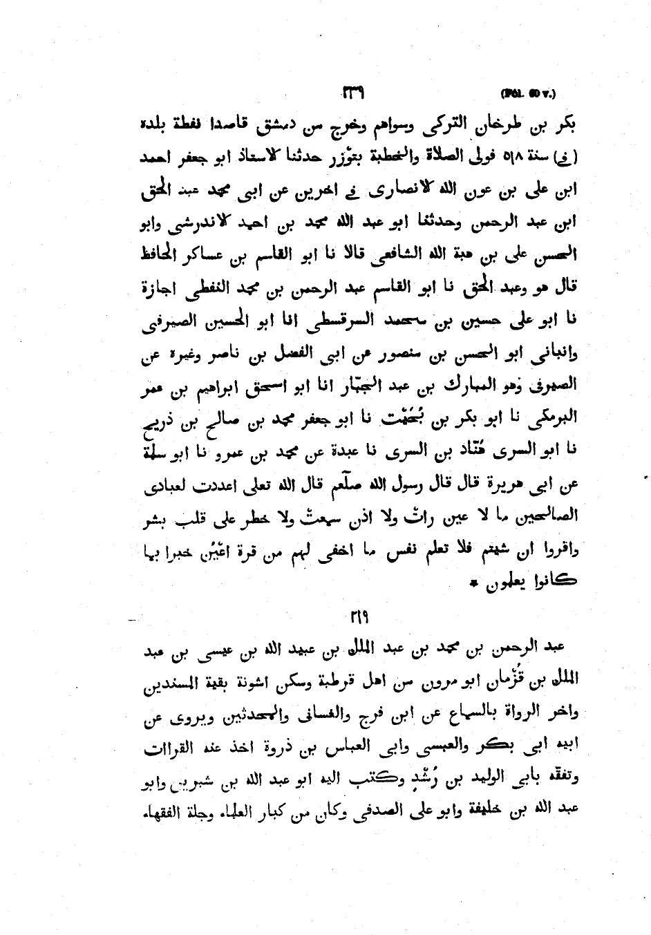 بَكْرِ بْنِ طَرْخَانَ التُّرْكِيِّ وَسِوَاهُمْ وَخَرَجَ مِنْ دِمَشْقَ قَاصِدًا نَفْطَةَ بَلَدِهُ فِي سَنَةِ 518 فَوَلِيَ الصَّلاةَ وَالْخُطْبَةَ بِتَوْزَرَ حَدَّثَنَا الأُسْتَاذُ أَبُو جَعْفَرٍ أحمد ابن عَلِيِّ بْنِ عَوْنِ اللَّهِ الْأنْصَارِيُّ فِي آخَرَيْنِ عن أبي محمد عبد الحق ابن عَبْدِ الرَّحْمَنِ وَحَدَّثَنَا أَبُو عَبْدِ اللَّهِ مُحَمَّدُ بْنُ أَحْمَدَ الأندرشيُّ وَأَبُو الْحَسَنِ عَلِيُّ بْنُ هِبَةِ اللَّهِ الشَّافِعِيُّ قَالا نَا أَبُو الْقَاسِمِ بْنُ عَسَاكِرَ الْحَافِظُ قَالَ هُوَ وَعَبْدُ الْحَقِّ نا أَبُو الْقَاسِمِ عَبْدُ الرَّحْمَنِ بْنُ مُحَمَّدِ النَّفْطِيُّ إِجَازَةً نَا أَبُو عَلِيٍّ حُسَيْنُ بْنُ مُحَمَّدٍ السَّرَقُسْطِيُّ أَنَا أَبُو الْحُسَيْنِ الصَّيْرَفِيُّ وَأَنْبَأَنِي أَبُو الْحَسَنِ بْنُ مَنْصُورٍ عَنْ أَبِي الْفَضْلِ بْنِ نَاصِرٍ وَغَيْرِهِ عَنِ الصَّيْرَفِيِّ وَهُوَ الْمُبَارَكُ بن عبد الجبار أنا أبو اسحق إِبْرَاهِيمُ بْنُ عُمَرَ الْبَرْمَكِيُّ نَا أَبُو بَكْرِ بن بحيت نَا أَبُو جَعْفَرٍ مُحَمَّدُ بْنُ صَالِحِ بْنِ ذَرِيحٍ نَا أَبُو السَّرِيِّ هَنَّادُ بْنُ السَّرِيِّ نَا عَبْدَةُ عَنْ مُحَمَّدِ بْنِ عَمْرٍو نَا أَبُو سَلَمَةَ عَنْ أَبِي هُرَيْرَةَ قَالَ قَالَ رَسُولَ اللَّهِ صَلَّى اللهُ عَلَيْهِ وَسَلَّمَ قَالَ اللَّهُ تَعَالَى أَعْدَدْتُ لِعِبَادِي الصَّالِحِينَ مَا لا عَيْنٌ رَأَتْ وَلا أُذُنٌ سَمِعَتْ وَلا خَطَرَ على قلب بشر إِنْ شِئْتُمْ فَلا تَعْلَمُ نَفْسٌ مَا أُخْفِيَ لهم من قرة أعين خبرا بما كانوا يعلمون عَبْدُ الرَّحْمَنِ بْنُ مُحَمَّدِ بْنِ عَبْدِ الْمَلِكِ بْنِ عُبَيْدِ اللَّهِ بْنِ عِيسَى بْنِ عَبْدِ الملك بن قزمان أبو مرون مِنْ أَهْلِ قُرْطُبَةَ وَسَكَنَ أُشُونَةَ بَقِيَّةُ الْمُسْنِدِينَ وَآخِرُ الرُّوَاةِ بِالسَّمَاعِ عَنِ ابْنِ فَرَجٍ وَالْغَسَّانِيِّ وَالْمُحَدِّثِينَ وَيَرْوِي عَنْ أَبِيهِ أَبِي بَكْرٍ وَالْعَبْسِيِّ وأبي العباس بن ذروة أخذ عنه القرات وَتَفَقَّهَ بِأَبِي الْوَلِيدِ بْنِ رُشْدٍ وَكَتَبَ إِلَيْهِ أَبُو عَبْدِ اللَّهِ بْنُ شِبْرِينَ وَأَبُو عَبْدِ اللَّهِ بْنُ خَلِيفَةَ وَأَبُو عَلِيٍّ الصَّدَفِيُّ وَكَانَ من كبار العلماء وجلة الفقهاء