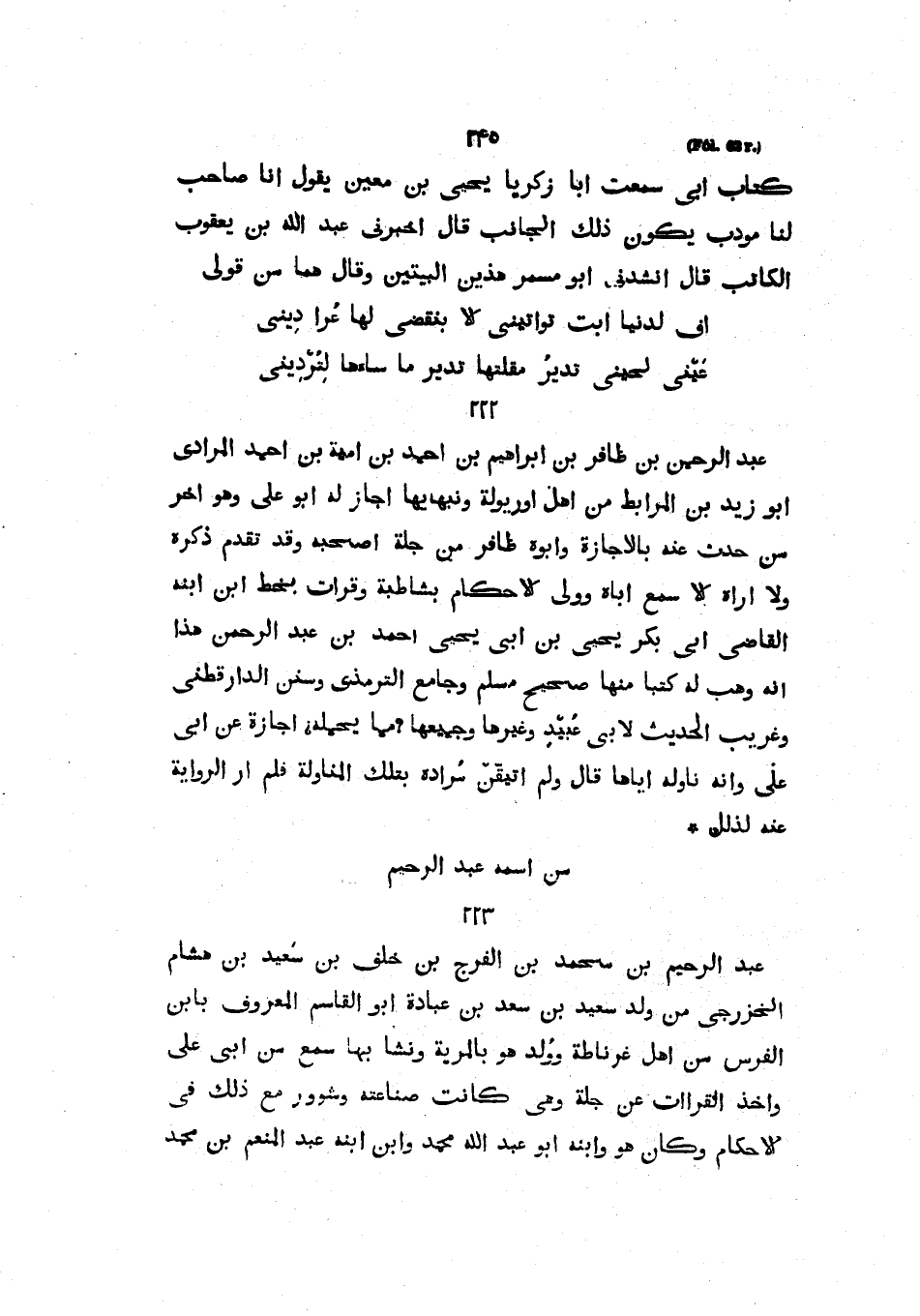 كِتَابِ أَبِي سَمِعْتُ أَبَا زَكَرِيَّا يَحْيَى بْنَ مَعِينٍ يَقُولُ أَنَا صَاحِبٌ لَنَا مُؤَدِّبٌ يَكُونُ ذَلِكَ الْجَانِبَ قَالَ أَخْبَرَنِي عَبْدُ اللَّهِ بْنُ يَعْقُوبَ الْكَاتِبُ قَالَ أَنْشَدَنِي أَبُو مُسْمَرٍ هَذَيْنِ البيتين وقال هما من قولي
