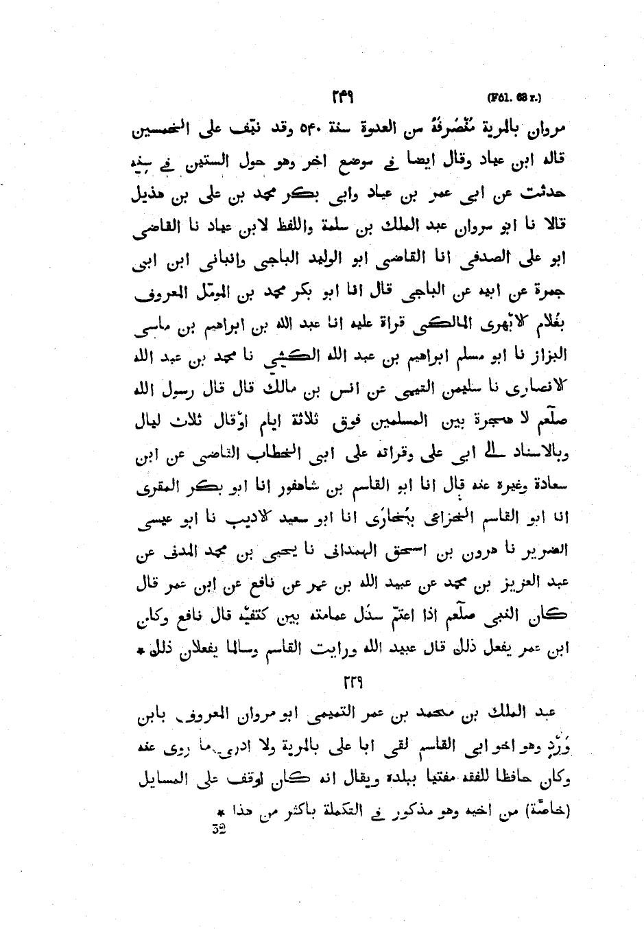 مروان بالمرية منصرفه من لعدوة سَنَةَ 540 وَقَدْ نَيَّفَ عَلَى الْخَمْسِينَ قَالَهُ ابْنُ عَيَّادٍ وَقَالَ أَيْضًا فِي مَوْضِعٍ آخَرَ وَهُوَ حَوْلَ السِّتِّينَ فِي سِنِّهِ حَدَّثْتُ عَنْ أَبِي عُمَرَ بْنِ عَيَّادٍ وَأَبِي بَكْرٍ مُحَمَّدِ بْنِ عَلِيِّ بْنِ هُذَيْلٍ قَالا نَا أَبُو مَرْوَانَ عبد الملك عَبْدُ الْمَلِكِ بْنُ سَلَمَةَ وَاللَّفْظُ لابْنِ عَيَّادٍ نَا الْقَاضِي أَبُو عَلِيٍّ الصَّدَفِيُّ أَنَا الْقَاضِي أَبُو الْوَلِيدِ الْبَاجِيُّ وَأَنْبَأَنِي ابْنُ أَبِي جَمْرَةَ عَنْ أَبِيهِ عَنِ الْبَاجِيِّ قَالَ أَنَا أَبُو بكر محمد بن المومل المعروف بغلام الأبهري المالكي قراة عَلَيْهِ أَنَا عَبْدُ اللَّهِ بْنُ إِبْرَاهِيمَ بْنِ مَاسِيٍّ الْبَزَّازُ نَا أَبُو مُسْلِمٍ إِبْرَاهِيمُ بْنُ عَبْدِ اللَّهِ الْكَشِّيُّ نَا مُحَمَّدُ بْنُ عَبْدِ الله الأنصاري نا سليمان التميمي عَنْ أَنَسِ بْنِ مَالِكٍ قَالَ قَالَ رَسُولُ الله صلى الله عليه وسلم نا سليمان التميمي عَنْ أَنَسِ بْنِ مَالِكٍ قَالَ قَالَ رَسُولُ اللَّهِ صَلَّى اللَّهُ عَلَيْهِ وَسَلَّمَ لا هِجْرَةَ بَيْنَ الْمُسْلِمِينَ فَوْقَ ثَلاثَةِ أَيَّامٍ أَوْ قَالَ ثَلاثِ لَيَالٍ وَبِالإِسْنَادِ إِلَى أَبِي عَلِيٍّ وَقَرَأْتُهُ عَلَى أَبِي الْخَطَّابِ الْقَاضِي عَنِ ابْنِ سَعَادَةَ وغيره عنه قال أبو القاسم بن شاهفور أبو بكر المقري أَنَا أَبُو الْقَاسِمِ الْخُزَاعِيُّ بِبُخَارَى أَنَا أَبُو سَعِيدٍ الأَدِيبُ نَا أَبُو عِيسَى الضَّرِيرُ نَا هرون بن اسحق الهمذاني نَا يَحْيَى بْنُ مُحَمَّدٍ الْمَدَنِيُّ عَنْ عَبْدِ العزي بْنِ مُحَمَّدٍ عَنْ عُبَيْدِ اللَّهِ بْنِ عُمَرَ عَنْ نَافِعٍ عَنِ ابْنِ عُمَرَ قَالَ كَانَ النبي صلى الله عليه وسلم إذا أعتم سَدَلَ عِمَامَتَهُ بَيْنَ كَتِفَيْهِ قَالَ نَافِعٌ وَكَانَ ابْنُ عُمَرَ يَفْعَلُ ذَلِكَ قَالَ عُبَيْدُ اللَّهِ وَرَأَيْتُ الْقَاسِمَ وَسَالِمًا يَفْعَلانِ ذَلِكَ عَبْدُ الْمَلِكِ بْنُ مُحَمَّدِ بْنِ عُمَرَ التَّمِيمِيُّ أَبُو مَرْوَانَ الْمَعْرُوفُ بِابْنِ وَرْدٍ وَهُوَ أَخُو أَبِي الْقَاسِمِ لَقِيَ أَبَا عَلِيٍّ بِالْمَرِيَّةِ وَلا أَدْرِي مَا رَوَى عَنْهُ وَكَانَ حَافِظًا لِلْفِقْهِ مُفْتِيًا بِبَلَدِهِ ويقال أنه كان أوقف على المسايل خاصة وهو أَخِيهِ وَهُوَ مَذْكُورٌ فِي التَّكْمِلَةِ بِأَكْثَرِ مِنْ هذا