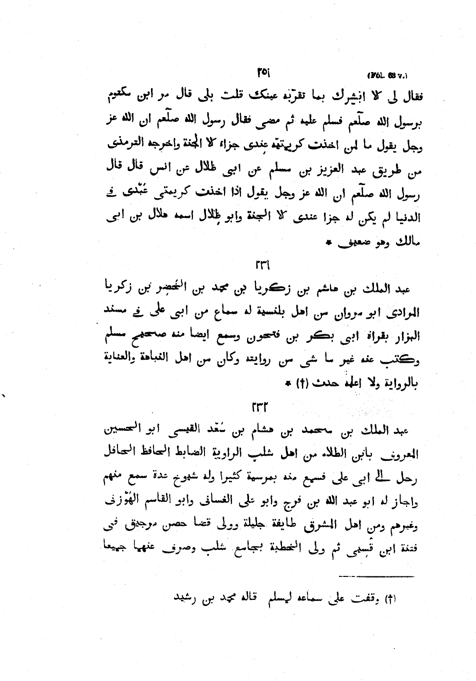 فقال لي ألا أبشرك بما تقربه عينك قلت بلى قال مر ابن مَكْتُومٍ بِرَسُولِ اللَّهِ صَلَّى اللَّهُ عَلَيْهِ وَسَلَّمَ فَسَلَّمَ عَلَيْهِ ثُمَّ مَضَى فَقَالَ رَسُولُ اللَّهِ صَلَّى اللَّهُ عَلَيْهِ وَسَلَّمَ إِنَّ اللَّهَ عَزَّ وَجَلَّ يَقُولُ مَا لِمَنْ أَخَذْتُ كَرِيمَتَيْهِ عِنْدِي جَزَاءٌ إِلا الْجَنَّةُ وَأَخْرَجَهُ التِّرْمِذِيُّ مِنْ طَرِيقِ عَبْد الْعَزِيزِ بْنِ مُسْلِمٍ عَنْ أَبِي ظِلالٍ عَنْ أَنَسٍ قَالَ قَالَ رَسُولُ اللَّهِ صَلَّى اللَّهُ عَلَيْهِ وَسَلَّمَ إِنَّ اللَّهَ عَزَّ وَجَلَّ يَقُولُ إِذَا أَخَذْتُ كَرِيمَتَيْ عَبْدِي فِي الدُّنْيَا لم يكن له جزا عِنْدِي إِلا الْجَنَّةُ وَأَبُو ظِلالٍ اسْمُهُ هِلالُ بْنُ أَبِي مَالِكٍ وَهُوَ ضَعِيفٌ عَبْدُ الْمَلِكِ بْنُ هَاشِمِ بْنِ زَكَرِيَّا بْنِ مُحَمَّدِ بْنِ الْخَضِرِ بْنِ زَكَرِيَّا الْمُرَادِيُّ أَبُو مَرْوَانَ مِنْ أَهْلِ بَلَنْسِيَةَ لَهُ سَمَاعٌ مِنْ أَبِي عَلِيٍّ في مسند البزار بقراة أَبِي بَكْرِ بْنِ فَتْحُونٍ وَسَمِعَ؟ أَيْضًا مِنْهُ صَحِيحَ مُسْلِمٍ وَكَتَبَ عَنْهُ غَيْرَ مَا شَيْءٍ مِنْ رِوَايَتِهِ وَكَانَ مِنْ أَهْلِ النَّبَاهَةِ وَالْعِنَايَةِ بِالرِّوَايَةِ وَلا أَعْلَمُهُ حَدَّثَ عَبْدُ الْمَلِكِ بْنُ مُحَمَّدِ بْنِ هِشَامِ بْنِ سَعْدٍ الْقَيْسِيُّ أَبُو الْحُسَيْنِ الْمَعْرُوفُ بِابْنِ الطَّلاءِ مِنْ أَهْلِ شِلْبَ الرواية الضَّابِطُ الْحَافِظُ الْحَافِلُ رَحَلَ إِلَى أَبِي عَلِيٍّ فَسَمِعَ مِنْهُ بِمُرْسِيَّةَ كَثِيرًا وَلَهُ شُيُوخٌ عِدَّةٌ سَمِعَ مِنْهُمْ وَأَجَازَ لَهُ أَبُو عَبْدِ اللَّهِ بْنُ فَرَجٍ وَأَبُو عَلِيٍّ الْغَسَّانِيُّ وَأَبُو الْقَاسِمِ الهوزني وغيرهم من أهل المشرق طايفة جليلة وولي قضا حصن مرجيق في فتنة ابن قيسي ثُمَّ وَلِيَ الْخُطْبَةَ بِجَامِعِ شِلْبَ وَصُرِفَ عَنْهُمَا جميعاً