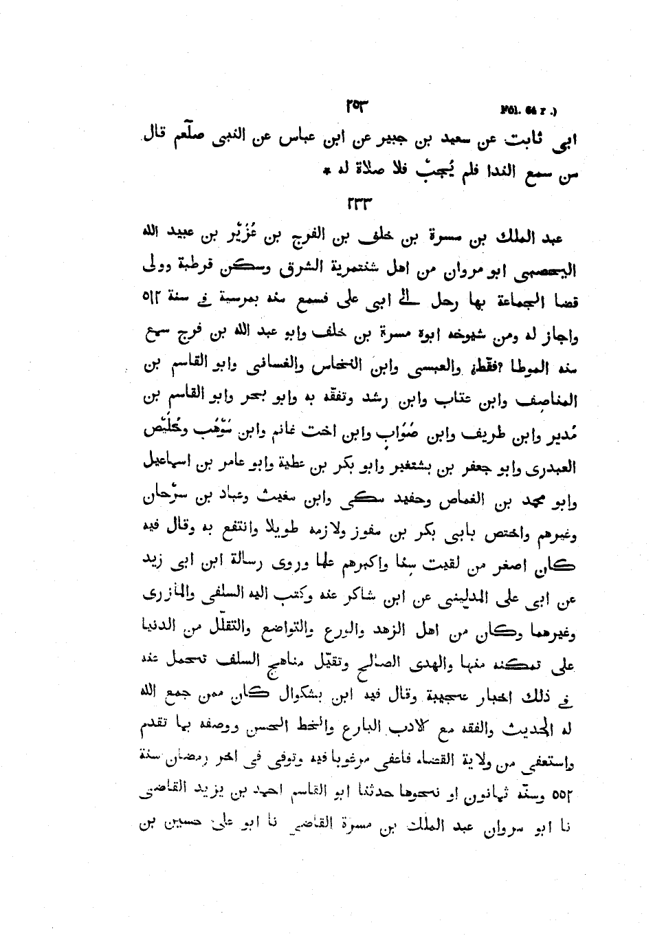 عَبْدُ الْمَلِكِ بن مسرة بن خلف بن الفرج بْنِ عُزَيْرِ بْنِ عُبَيْدِ اللَّهِ الْيَحْصِبيُّ أَبُو مَرْوَانَ مِنْ أَهْلِ شنتمريةَ الشَّرْقِ وَسَكَنَ قُرْطُبَةَ وولى قضا الْجَمَاعَةِ بِهَا رَحَلَ إِلَى أَبِي عَلِيٍّ فَسَمِعَ مِنْهُ بِمُرْسِيَّةَ فِي سَنَةِ 512 وَأَجَازَ لَهُ وَمِنْ شُيُوخِهِ أَبُوهُ مَسَرَّةُ بْنُ خَلَفٍ وَأَبُو عَبْدِ اللَّهِ بْنُ فَرَجٍ سَمِعَ مِنْهُ الْمُوَطَّأَ فَقَطْ وَالْعَبْسِيُّ وَابْنُ النَّخَّاسِ وَالْغَسَّانِيُّ وَأَبُو الْقَاسِمِ بْنُ المناصف وابن عتاب وابن رشد وتققه بِهِ وَأَبُو بَحْرٍ وَأَبُو الْقَاسِمِ بْنُ مُدَيْرٍ وَابْنُ طَرِيفٍ وَابْنُ صَوَابٍ وَابْنُ أُخْتِ غَانِمٍ وابن موهب وحليص الْعَبْدَرِيُّ وَأَبُو جَعْفَرِ بْنُ بَشْتَغِيرَ وَأَبُو بَكْرِ بْنُ عَطِيَّةَ وَأَبُو عَامِرِ بْنُ إِسْمَاعِيلَ وَأَبُو محمد بن الغماص وحفيد سكي وَابْنُ مُغِيثٍ وَعَبَّادُ بْنُ سَرْحَانَ وَغَيْرُهُمْ وَاخْتَصَّ بِأَبِي بَكْرِ بْنِ مُفَوَّزٍ وَلازَمَهُ طَوِيلا وَانْتَفَعَ بِهِ وَقَالَ فِيهِ كَانَ أَصْغَرَ مَنْ لَقِيتُ سِنًّا وَأَكْبَرَهُمْ عِلْمًا وَرَوَى رِسَالَةَ ابْنِ أَبِي زيد عن أبي علي المدليني عَنِ ابْنِ شَاكِرٍ عَنْهُ وَكَتَبَ إِلَيْهِ السَّلَفِيُّ وَالْمَازَرِيُّ وَغَيْرُهُمَا وَكَانَ مِنْ أَهْلِ الزُّهْدِ وَالْوَرَعِ والتواضع والتقلل من الدنيا على تمكنها منها والهدى الصالح وتقيل مَنَاهِجِ السَّلَفِ تُحْمَلُ عَنْهُ فِي ذَلِكَ أَخْبَارٌ عَجِيبَةٌ وَقَالَ فِيهِ ابْنُ بَشْكُوَالَ كَانَ مِمَّنْ جَمَعَ اللَّهُ لَهُ الْحَدِيثَ وَالْفِقْهَ مَعَ الأَدَبِ الْبَارِعِ وَالْخَطِّ الْحَسَنِ وَوَصَفَهُ بِمَا تَقَدَّمَ وَاسْتَعْفَى مِنْ وِلايَةِ الْقَضَاءِ فَأُعْفِيَ مَرْغُوبًا فِيهِ وَتُوُفِّيَ فِي آخِرِ رَمَضَانَ سَنَةَ 552 وَسِنُّهُ ثَمَانُونَ أَوْ نَحْوُهَا حَدَّثَنَا أَبُو الْقَاسِمِ أَحْمَدُ بْنُ يَزِيدَ الْقَاضِي نَا أَبُو مَرْوَانَ عَبْدُ الْمَلِكِ بْنُ مَسَرَّةَ الْقَاضِي نَا أَبُو عَلِيٍّ حُسَيْنُ بْنُ