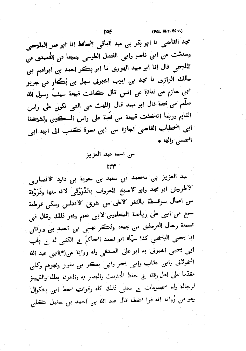 عَبْدُ الْعَزِيزِ بن محمد بن سعيد بن معوية بْنِ دَاوُدَ الْأنْصَارِيُّ الْأُطْرُوشُ أَبُو مُحَمَّدٍ وَأَبُو الْأَصْبَغِ الْمَعْرُوفُ بِالدَّرَوْقِيِّ لِأَنَّهُ مِنْهَا وَدَرَوْقَةُ مِنْ أَعْمَالِ سَرَقُسْطَةَ بِالثَّغْرِ الْأَعْلَى مِنْ شَرْقِ الْأَنْدَلُسِ وَسَكَنَ قُرْطُبَةَ سَمِعَ مِنْ أَبِي عَلِيٍّ رِيَاضَةَ الْمُتَعَلِّمِينَ لِأَبِي نُعَيْمٍ وَغَيْرَ ذَلِكَ وَقَالَ فِي تَسْمِيَةِ رِجَالِ التِّرْمِذِيِّ مِنْ جَمْعِهِ وَذَكَرَ عِيسَى بْنَ أَحْمَدَ بْنِ وَرْدَانَ أَبَا يَحْيَى الْبَلْخِيَّ كَذَا سَمَّاهُ أَبُو أَحْمَدَ الْحَاكِمُ فِي الْكُنَى لَهُ فِي بَابِ أَبِي يَحْيَى أَخْبَرَنِي بِهِ أَبُو عَلِيٍّ الصَّدَفِيُّ وَلَهُ رِوَايَةٌ عَنْ أَبِي عَبْدِ اللَّهِ الْخَوْلَانِيِّ وَابْنِ عَتَّابٍ وَأَبِي بَحْرٍ وَأَبِي بَكْرِ بْنِ مَفْوَزٍ وَغَيْرِهِمِ وَكَانَ مُقَدَّمًا عَلَى أَهْلِ وَقْتِهِ فِي حِفْظِ الْحَدِيثِ وَالْبَصَرِ بِهِ وَالْمَعْرِفَةِ بِعِلَلِهِ وَالتَّمْيِيزِ لِرِجَالِهِ وَلَهُ مَجْمُوعَاتٌ فِي مَعْنَى ذَلِكَ كُلِّهِ وَقَرَأْتُ بِخَطِّ ابْنِ بشكوال وهو من رواتته أَنَّهُ قَرَأَ بِخَطِّهِ قَالَ عَبْدُ اللَّهِ بْنُ أحْمَدَ بْنِ حَنْبَلٍ كَانَ