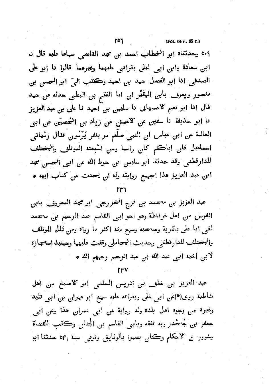 509 وَحَدَّثَنَاهُ أَبُو الْخَطَّابِ أَحْمَدُ بْنُ مُحَمَّدٍ الْقَاضِي سَمَاعًا عَلَيْهِ قَالَ نا ابْنُ سَعَادَةَ وَابْنُ أبي ليلى بقراتي عَلَيْهِمَا وَغَيْرُهُمَا قَالُوا نا أَبُو عَلِيٍّ الصَّدَفِيُّ أَنَا أَبُو الْفَضْلِ حَمَدُ بْنُ أَحْمَدَ وَكَتَبَ إِلَيَّ أَبُو الْحَسَنِ بْنُ مَنْصُورٍ وَيُعْرَفُ بِابْنِ المقيرأن أَبَا الْفَتْحَ بْنَ الْبَطِّيَّ حَدَّثَهُ عَنْ حَمَدٍ قَالَ أَنَا أَبُو نُعَيْمٍ الْأَصْبَهَانِيُّ نا سُلَيْمَانُ بْنُ أَحْمَدَ نا عَلِيُّ بْنُ عَبْدِ الْعَزِيزِ نا أبو حذيفة نا سفين عَنِ الْأَعْمَشِ عَنْ زِيَادِ بْنِ الْحُصَيْنِ عَنْ أَبِي الْعَالِيَةِ عَنِ ابْنِ عَبَّاسٍ أَنَّ النَّبِيَّ صَلَّى اللَّهُ عَلَيْهِ وَسَلَّمَ مَرَّ بِنَفَرٍ يَرْمُونَ فَقَالَ رَمَيَانِي إِسْمَاعِيلُ فَإِنَّ أَبَاكُمْ كَانَ رَامِيًا ومن أسمعته الموتلف والمختلف للدار قطني وَقَدْ حَدَّثَنَا أَبُو سُلَيْمَانَ بْنُ حَوَطِ اللَّهِ عن أبي الحسن محمد ابن عَبْدِ الْعَزِيزِ هَذَا بِجَمِيعِ رِوَايَتِهِ وَلَهُ أَنْ يُحَدِّثَ عَنْ كِتَابِ أَبِيهِ عَبْدُ الْعَزِيزِ بْنُ مُحَمَّدِ بْنِ فَرَجٍ الْخَزْرَجِيُّ أَبُو مُحَمَّدٍ الْمَعْرُوفُ بِابْنِ الْفَرَسِ مِنْ أَهْلِ غَرْنَاطَةَ وَهُوَ أَخُو أبو الْقَاسِمِ عَبْدِ الرَّحِيمِ بْنِ مُحَمَّدٍ لَقِيَ أَبَا عَلِيٍّ بِالْمَرِيَّةِ وَصَحِبَهُ وَسَمِعَ مِنْهُ أَكْثَرَ مَا رواه من ذلك الموتلف والمختلف للدار قطني وحديث المحاملي وقفت عليهما وَحِينَئِذٍ اسْتَجَازَهُ لِابْنِ أَخِيه أَبِي عَبْدِ اللَّهِ بْنِ عَبْدِ الرَّحِيمِ رَحِمَهُمُ اللَّهِ عَبْدُ الْعَزِيزِ بْنُ خَلَفِ بْنِ إِدْرِيسَ السُّلَمِيُّ أَبُو الْأَصْبَغِ مِنْ أَهْلَ شَاطِبَةَ رَوَى عَنْ أَبِي عَلِيٍّ وبقراته عليه سمع أبو عِمْرَانَ بْنَ أَبِي تَلِيدٍ وَغَيْرَهُ مِنْ وُجُوهِ أَهْلِ بَلَدِهِ وَلَهُ رِوَايَةٌ عَنْ أَبِي عِمْرَانَ هَذَا وَعَنْ أَبِي جَعْفَرِ بْنِ جَحْدُرَ وَبِهِ تَفَقُّهٌ وَبِأَبِي الْقَاسِمِ بْنِ الْجِنَانِ وَكَتَبَ لِلْقُضَاةِ وشوور فِي الْأَحْكَامِ وَكَانَ بَصِيرًا بِالْوَثَائِقِ وَتُوُفِّيَ سَنَةَ 541 حدثنا أبو