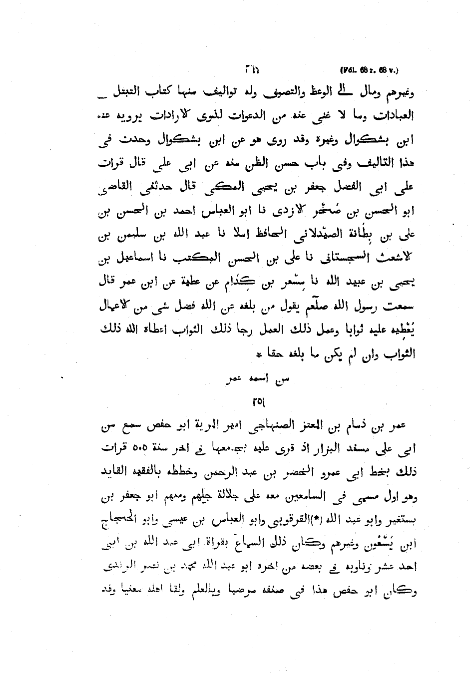 وغيرهم ومال إلى الوعظ والتصوف وله تواليف مِنْهَا كِتَابُ التَّبَتُّلِ فِي الْعَبَادَاتِ وَمَا لَا غِنًى عَنْهُ مِنَ الْدَعَوَاتِ لِذَوِي الْإِرَادَاتِ يَرْوِيهِ عَنْهُ ابْنُ بَشْكُوَالَ وَغَيْرُهُ وَقَدْ رَوَى هُوَ عَنِ ابْنِ بَشْكُوَالَ وَحَدَّثَ فِي هَذَا التَّأْلِيفِ وَفِي بَابِ حُسْنِ الظَّنِّ مِنْهُ عَنْ أَبِي عَلِيٍّ قَالَ قَرَأْتُ عَلَى أَبِي الْفَضْلِ جَعْفَرِ بْنِ يَحْيَى الْمَكِّيِّ قَالَ حدَّثَنِي الْقَاضِي أَبُو الْحَسَنِ بْنُ صَخْرٍ الْأزْدِيُّ نا أَبُو الْعَبَّاسِ أَحْمَدُ بْنُ الْحَسَنِ بْنِ عَلِيِّ بْنِ بِطَانَةَ الصيدلاني الحافظ أملاً نا عَبْدُ اللَّهِ بْنُ سُلَيْمَانَ بْنِ الأَشْعَثِ السِّجِسْتَانِيُّ نا عَلِيُّ بْنُ الْحَسَنِ الْمُكَتِّبِ نا إِسْمَاعِيلُ بْنُ يَحْيَى بْنِ عُبَيْدِ اللَّهِ نا مِسْعرِ بْنِ كِدَامٍ عَنْ عَطِيَّةَ عَنِ ابْنِ عُمَرَ قَالَ سَمِعْتُ رَسُولَ اللَّهِ صَلَّى اللَّهُ عليه وسلميقول مَنْ بَلَغَهُ عَنِ اللَّهِ فَضْلُ شَيْءٍ مِنَ الأعمال يعطيه عليه ثواباُ وعمل بذلك العمل رجا الثَّوَابَ أَعْطَاهُ اللَّهُ ذَلِكَ الثَّوَابَ وَإِنْ لَمْ يَكُنْ مَا بَلَغَهُ حَقًّا.