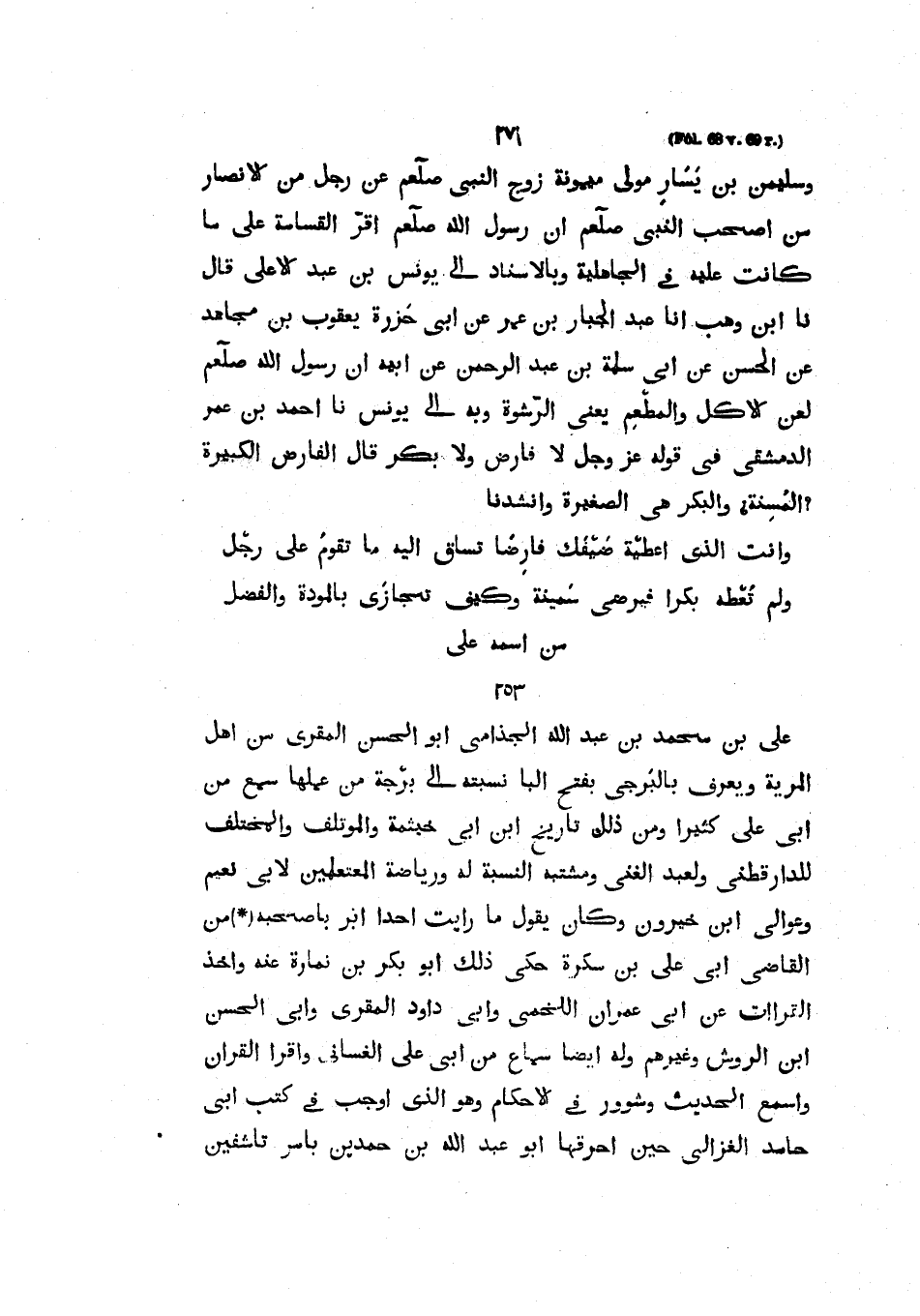 وَسُلَيْمَانَ بْنِ يَسَارٍ مَوْلَى مَيْمُونَةَ زَوْجِ النَّبِيِّ صلى الله عليه وسلمعن رَجُلٍ مِنَ الْأَنْصَارِ مِنْ أَصْحَابِ النَّبِيِّ صَلَّى الله عليه وسلمأن رسول الله صلى الله عليه وسلمأقر الْقَسَامَةَ عَلَى مَا كَانَتْ عَلَيْهِ فِي الْجَاهِلِيَّةِ وَبِالْإِسْنَادِ إِلَى يُونُسَ بْنِ عَبْدِ الْأَعْلَى قَالَ نا ابْنُ وَهْبٍ أَنَا عَبْدُ الْجَبَّارِ بْنُ عُمَرَ عَنْ أَبِي حَزْرَةَ يَعْقُوبَ بْنِ مُجَاهِدٍ عَنِ الْحَسَنِ عَنْ أَبِي سَلَمَةَ بْنِ عَبْدِ الرَّحْمَنِ عَنْ أَبِيهِ أَنَّ رَسُولَ اللَّهِ صَلَّى الله عليه وسلملعن الْآكِلَ وَالْمُطْعِمَ يَعْنِي الرِّشْوَةَ وَبِهِ إِلَى يُونُسَ نا أَحْمَدُ بْنُ عُمَرَ الدِّمَشْقِيُّ فِي قَوْلِهِ عز وجل لا فارض ولا بكر قَالَ الْفَارِضُ الْكَبِيرَةُ الْمُسِنَّةُ وَالْبِكْرُ هِيَ الصَّغِيرَةُ وأنشدنا: