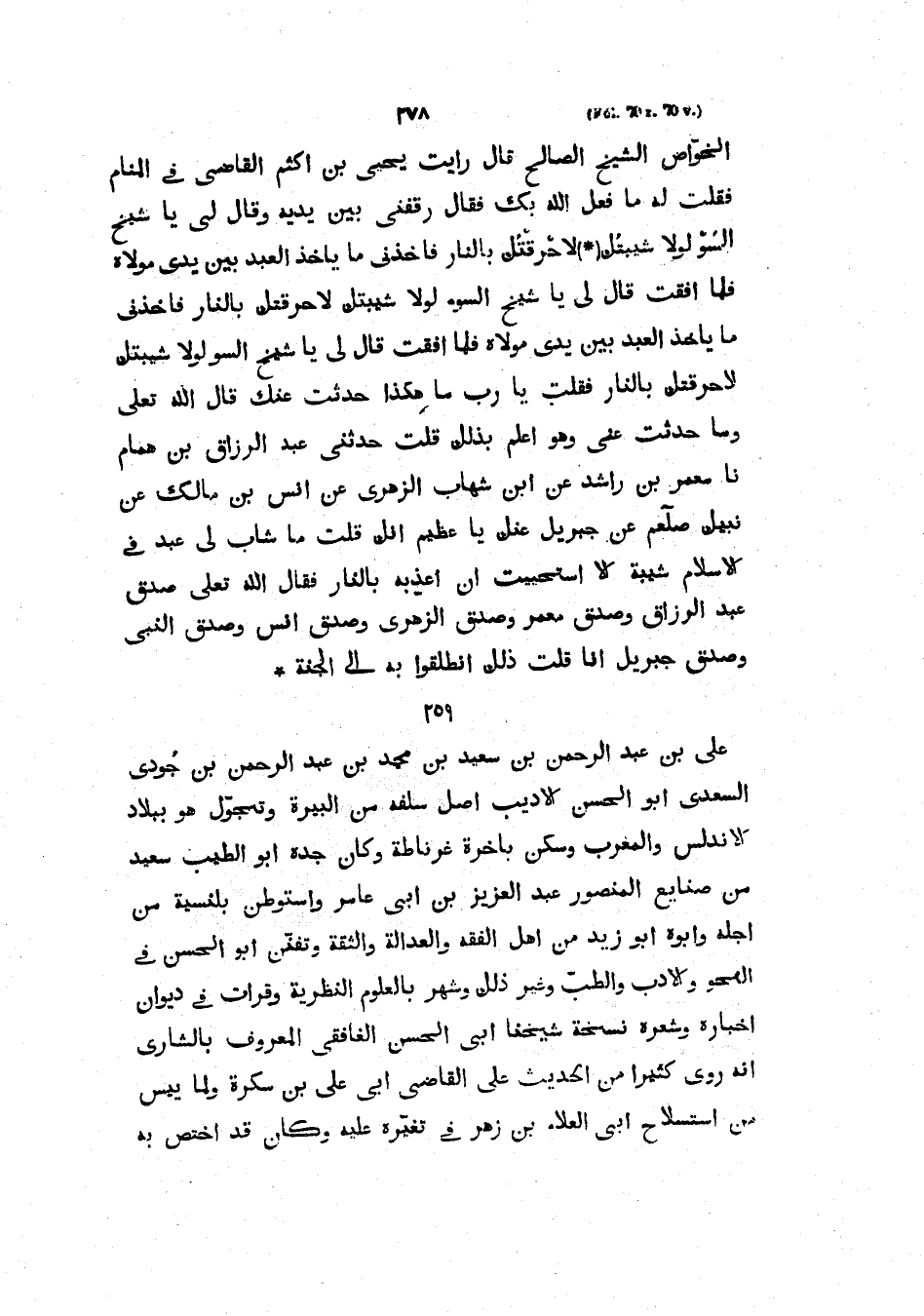 الْخَوَّاصُ الشَّيْخُ الصَّالِحُ قَالَ رَأَيْتُ يَحْيَى بْنُ أَكْثَمَ الْقَاضِي فِي الْمَنَامِ فَقُلْتُ لَهُ مَا فعل الله بك فقال رقفني بَيْنَ يَدَيْهِ وَقَالَ لِي يَا شَيْخَ السُّوءِ لَوْلَا شَيْبَتُكَ لَأحْرَقْتُكَ بِالنَّارِ فَأَخَذَنِي مَا يَأْخُذُ الْعَبْدَ بَيْنَ يَدَيْ مَوْلَاهُ فَلَمَّا أفقْتُ قَالَ لِي يَا شَيْخَ السُّوءِ لَوْلَا شَيْبَتُكَ لَأحْرَقْتُكَ بِالنَّارِ فَأَخَذَنِي مَا يَأْخُذُ الْعَبْدَ بَيْنَ يَدَيْ مَوْلَاهُ فَلَمَّا أفقْتُ قَالَ لِي يَا شَيْخَ السُّوءِ لَوْلَا شَيْبَتُكَ لَأَحْرَقْتُكَ بِالنَّارِ فَقُلْتُ يَا رَبِّ مَا هَكَذَا حَدَّثْتُ عَنْكَ قَالَ اللَّهُ تَعَالَى وَمَا حَدَّثْتَ عَنِّي وَهُوَ أَعْلَمُ بِذَلِكَ قُلْتُ حَدَّثَنِي عَبْدُ الرَّزَّاقِ بْنُ هَمَّامٍ نا مَعْمَرُ بْنُ رَاشِدٍ عَنِ ابْنِ شِهَابٍ الزُّهْرِيِّ عَنْ أنسِ بْنِ مَالِكٍ عَنْ نَبِيِّكِ صَلَّى الله عليه وسلمعن جِبْرِيلَ عَنْكَ يَا عَظِيمُ إِنَّكَ قُلْتَ مَا شَابَ لِي عَبْدٌ فِي الْإسْلَام شَيْبَةً إِلَّا استحيت أَنْ أُعَذِّبَهُ بِالنَّارِ فَقَالُ اللَّهُ تَعَالَى صَدَقَ عَبْدُ الرَّزَّاقِ وَصَدَقَ مَعْمَرٌ وَصَدَقَ الزُّهْرِيُّ وَصَدَقَ أنس وصدق النبي وَصَدَقَ جِبْرِيلُ أَنَا قُلْتُ ذَلِكَ انْطَلِقُوا بِهِ إِلَى الْجَنَّةِ عَلِيُّ بْنُ عَبْدِ الرَّحْمَنِ بْنِ سَعِيدِ بْنِ مُحَمَّدِ بْنِ عَبْدِ الرَّحْمَنِ بْنِ جُودِيِّ السَّعْدِيُّ أَبُو الْحَسَنِ الْأَدِيبُ أَصْلُ سَلَفِهِ مِنَ الْبَيَرَةِ وَتَجَوَّلَ هُوَ بِبِلَادِ الْأَنْدَلُسِ وَالْمَغْرِبِ وَسَكَنَ بَاخِرَةَ غَرْنَاطَةَ وَكَانَ جَدُّهُ أَبُو الطَّيِّبِ سعيد من صنايع الْمَنْصُورِ عَبْدِ الْعَزِيزِ بْنِ أَبِي عَامِرٍ وَاسْتَوْطَنَ بَلَنْسِيَةَ مِنْ أَجْلِهِ وَأَبُوهُ أَبُو زَيْدٍ مِنْ أهل الفقه وَالثِّقَةِ وَتَفَنَّنَ أَبُو الْحَسَنِ فِي النَّحْوِ وَالْأَدَبِ وَالطِّبِّ وَغَيْرِ ذَلِكَ وَشُهِرَ بِالْعُلُومِ النَّظَرِيَّةِ وَقَرَأْتُ فِي دِيوَانِ أَخْبَارِهِ وَشِعْرِهِ نَسَخَةَ شَيْخِنَا أَبِي الْحَسَنِ الْغَافِقِيِّ الْمَعْرُوفِ بِالشَّارِي أَنَّهُ رَوَى كَثِيرًا مِنَ الْحَدِيثِ عَلَى الْقَاضِي أَبِي عَلِيِّ بْنِ سكرة ولما يئس من استسلاح أَبِي الْعَلَاءِ بْنِ زُهْرٍ فِي تَغَيُّرِهِ عَلَيْهِ وَكَانَ قَدِ اخْتَصَّ بِهِ