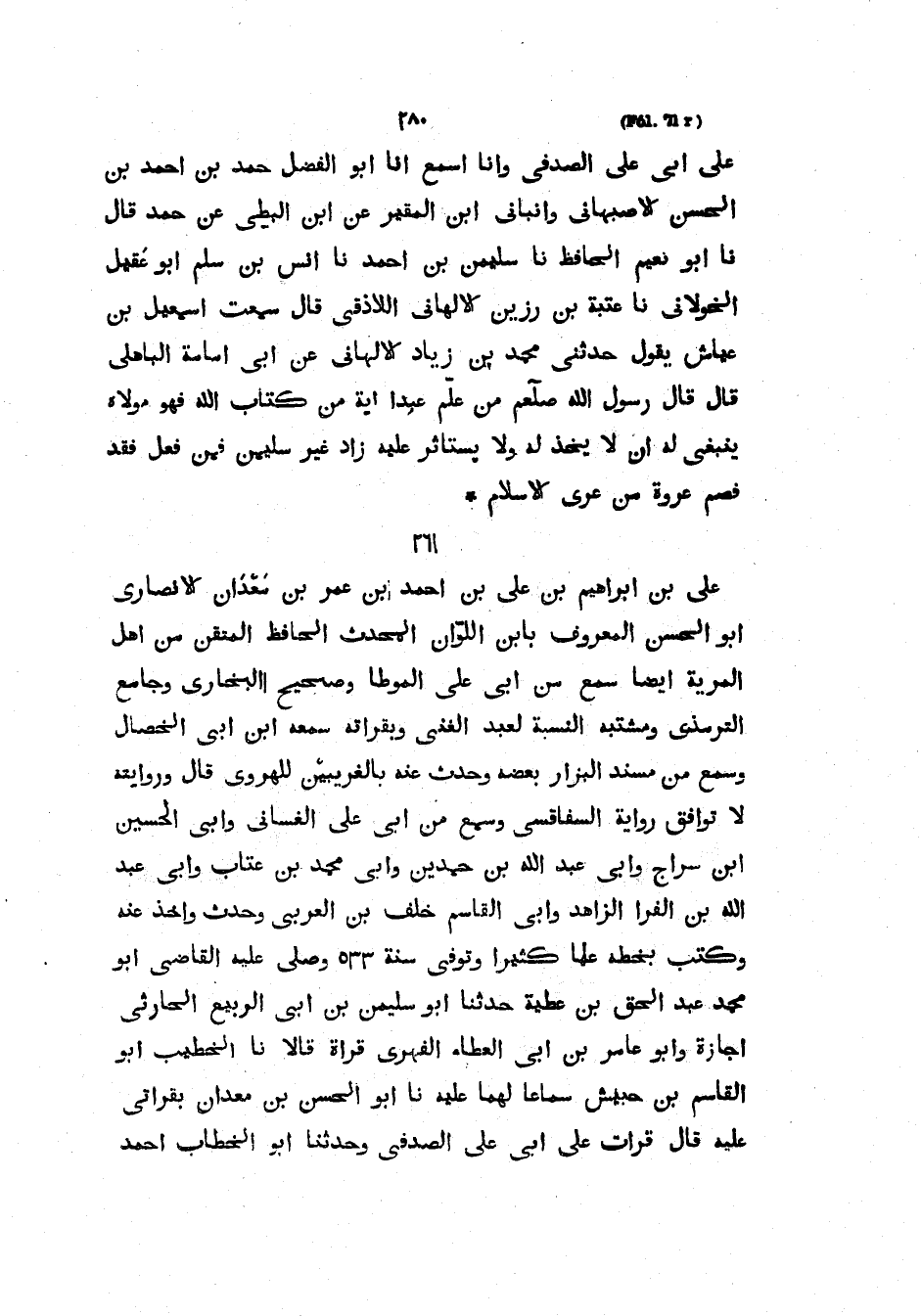 عَلَى أَبِي عَلِيٍّ الصَّدَفِيِّ وَأَنَا أَسْمَعُ أَنَا أَبُو الْفَضْلِ حَمْدُ بْنُ أَحْمَدَ بْنِ الْحَسَنِ الْأَصْبَهَانِيُّ وَأَنْبَأَنِي ابْنُ الْمُقَيِّرِ عَنِ ابْنِ الْبَطِّيِّ عَنْ حَمَدٍ قَالَ نا أَبُو نُعَيْمٍ الْحَافِظُ نا سُلَيْمَانُ بْنُ أَحْمَدَ نا أَنَسُ بْنُ سَلَمٍ أَبُو عَقِيلٍ الْخَوْلَانِيُّ نا عُتْبَةُ بْنُ رُزَيْنٍ الْأَلْهَانِيُّ اللَّاذِقِيُّ قَالَ سَمِعْتُ إِسْمَاعِيلَ بْنَ عَيَّاشٍ يَقُولُ حدَّثَنِي مُحَمَّدُ بْنُ زِيَادٍ الْأَلْهَانِيُّ عَنْ أَبِي أُمَامَةَ الْبَاهِلِيِّ قَالَ قَالَ رَسُولُ الله صلى الله عليه وسلممن عَلَّمَ عَبْدًا آيَةً مِنْ كِتَابِ اللَّهِ فَهُوَ مولاه ينبغي له أن لا يخذله ولايستأثر عَلَيْهِ زَادَ غَيْرُ سُلَيْمَانَ فَمَنْ فَعَلَ فَقَدْ فصم عُرْوَةً مِنْ عُرَى الْإسْلَامِ.