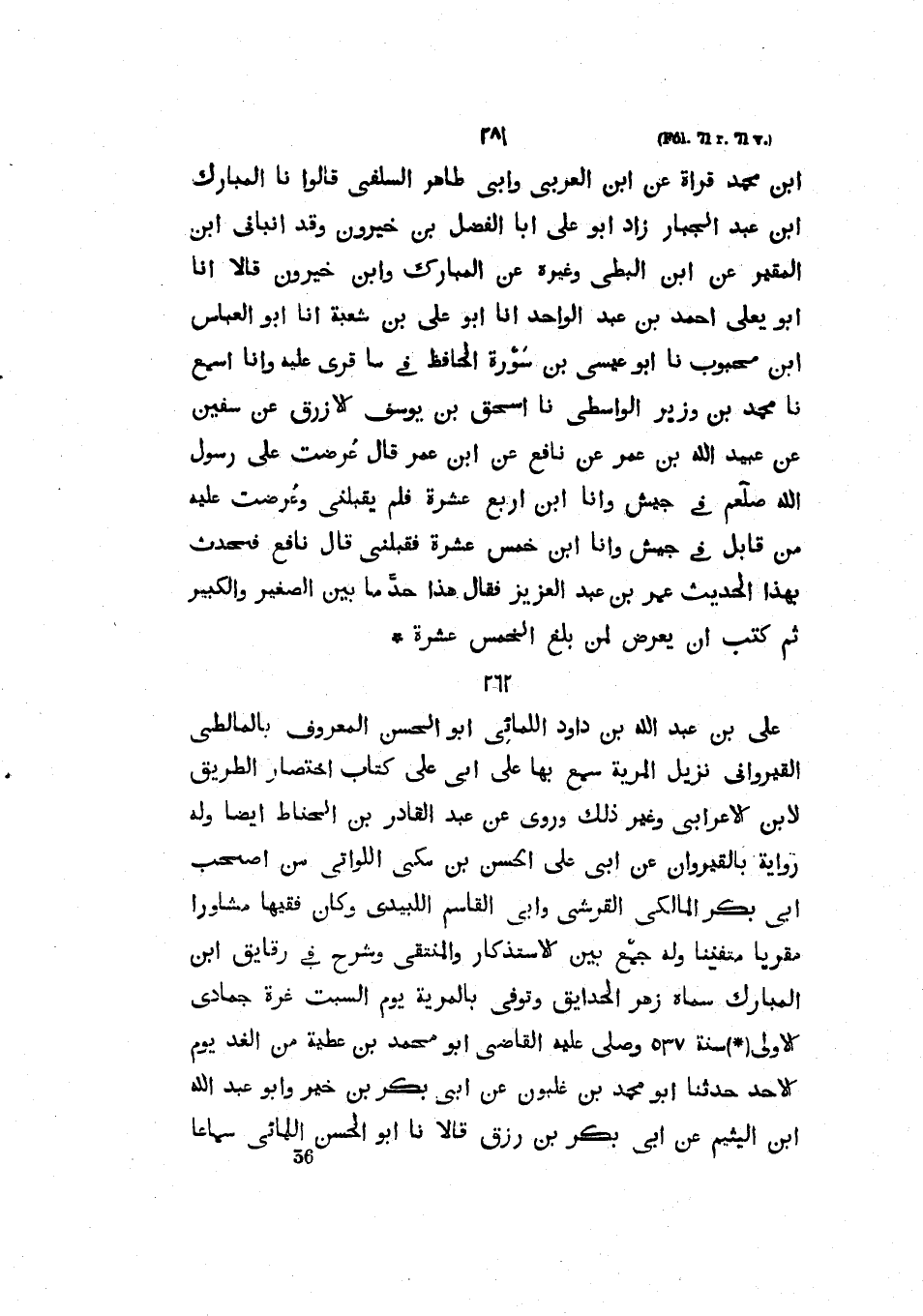 بن محمد قراة عَنِ ابْنِ الْعَرَبِيِّ وَأَبِي طَاهِرٍ السَّلَفِيِّ قَالُوا نا المبارك بن عبد الجبار زاد عَلِيٍّ أَبَا الْفَضْلَ بْنَ خَيْرُونَ وَقَدْ أَنْبَأنِي ابْنُ الْمُقَيِّرِ عَنِ ابْنِ الْبَطِّيِّ وَغَيْرِهِ عَنِ الْمُبَارَكِ وَابْن خَيْرُونَ قَالَا أَنَا أَبُو يَعْلَى أَحْمَدُ بْنُ عَبْدِ الْوَاحِدِ أَنَا أَبُو عَلِيِّ بن شعبة أنا أبو العباس ابن مَحْبُوبٍ نا أَبُو عِيسَى بْنُ سَوْرَةَ الْحَافِظُ في ما قرى عَلَيْهِ وَأَنَا أَسْمَعُ نا مُحَمَّدُ بْنُ وَزِيرٍ الواسطي نا اسحق بن يوسف الأزرق عن سفين عَنْ عُبَيْدِ اللَّهِ بْنِ عُمَرَ عَنْ نَافِعٍ عَنْ ابْنِ عُمَرَ قَالَ عُرِضْتُ عَلَى رَسُولِ الله صلى الله عليه وسلمفي جَيْشٍ وَأَنَا ابْنُ أَرْبَعَ عَشَرَةَ فَلَمْ يَقْبَلْنِي وَعُرِضْتُ عَلَيْهِ مِنْ قَابِلٍ فِي جَيْشٍ وَأَنَا ابْنُ خَمْسَ عَشْرَةَ فَقَبِلَنِي قَالَ نَافِعٌ فَحَدَّثَ بِهَذَا الْحَدِيثِ عُمَرُ بْنُ عَبْدِ الْعَزِيزِ فَقَالَ هَذَا حَدُّ مَا بَيْنَ الصَّغِيرِ وَالْكَبِيرِ ثُمَّ كَتَبَ أَنْ يَعْرِضَ لِمَنْ بَلَغَ الْخَمْسَ عَشْرَةَ.