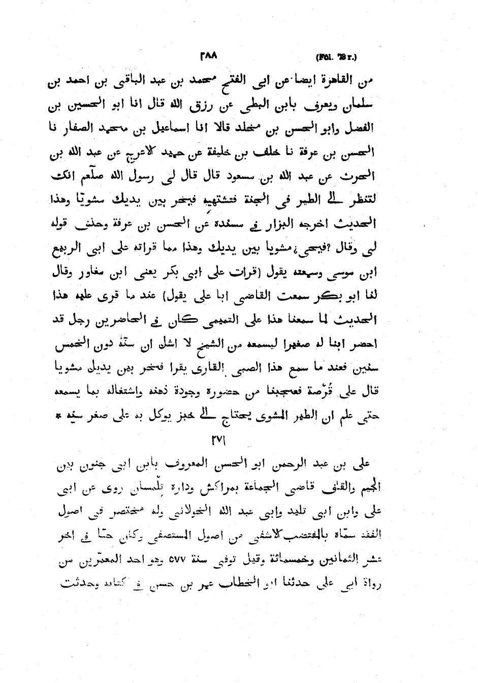 مِنَ الْقَاهِرَةِ أَيْضًا عَنْ أَبِي الْفَتْحِ مُحَمَّدِ بْنِ عَبْدِ الْبَاقِي بْنِ أَحْمَدَ بْنِ سَلْمَانَ ويعرف بابن البطيء عَنْ رِزْقِ اللَّهِ قَالَ أَنَا أَبُو الْحُسَيْنِ بْنُ الْفَضْلِ وَأَبُو الْحَسَنِ بْنُ مَخْلَدٍ قَالَا أَنَا إِسْمَاعِيلُ بْنُ مُحَمَّدٍ الصَّفَّارُ نا الْحَسَنُ بْنُ عَرَفَةَ نا خَلَفُ بْنُ خَلِيفَةَ عَنْ حميد الأعرج عن عبد الله بن الحرث عَنْ عَبْدِ اللَّهِ بْنِ مَسْعُودٍ قَالَ قَالَ لي رسول الله صلى الله عليه وسلمإنك لَتَنْظُرُ إِلَى الطَّيْرِ فِي الْجَنَّةِ فَتَشْتَهِيهِ فَيَخِرُّ بَيْنَ يَدَيْكَ مَشْوِيًّا وَهَذَا الْحَدِيثُ أَخْرَجَهُ الْبَزَّارُ فِي مُسْنَدِهِ عَنِ الْحَسَنِ بْنِ عَرَفَةَ وَحَذَفَ قوله لي وقال فيحى مَشْوِيًّا بَيْنَ يَدَيْكَ وَهَذَا مِمَّا قَرَأْتُهُ عَلَى أَبِي الرَّبِيعِ بْنِ مُوسَى وَسَمِعْتُهُ يَقُولُ) قَرَأْتُ عَلَى أَبِي بَكْرٍ يَعْنِي ابْنَ مُغَاوِرٍ وَقَالَ لَنَا أَبُو بَكْرٍ سَمِعْتُ الْقَاضِي أَبَا عَلِيٍّ يقول (عندما قرى عليه هذا الحديث لما سمعنا هذا على التَّمِيمِيِّ كَانَ فِي الْحَاضِرِينَ رَجُلٌ قَدْ أَحْضَرَ ابْنًا لَهُ صَغِيرًا لِيُسْمِعَهُ مِنَ الشَّيْخِ لَا أشك أن سنة دون الخمس سنين فعند ما سَمِعَ هَذَا الصَّبِيُّ الْقَارِئَ يَقْرَأَ فَخَرَّ بَيْنَ يَدَيْكَ مَشْوِيًّا قَالَ عَلَيَّ قُرْصَة فَعَجِبْنَا مِنْ حُضُورِهِ وَجَوْدَةِ ذِهْنِهِ وَاشْتِغَالِهِ بِمَا يَسْمَعُهُ حَتَّى عَلِمَ أَنَّ الطَّيْرَ الْمَشْوِيَّ يَحْتَاجُ إِلَى خُبْزٍ يوكل بِهِ عَلَى صِغَرِ سِنِّهِ.