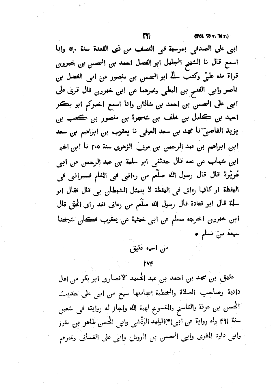 أَبِي عَلِيٍّ الصَّدَفِيِّ بِمُرْسِيَّةَ فِي النِّصْفِ مِنْ ذِي الْقَعْدَةِ سَنَةَ 510 وَأَنَا أَسْمَعُ قَالَ نا الشَّيْخُ الْجَلِيلُ أَبُو الْفَضْلِ أَحْمَدُ بْنُ الْحَسَنِ بن خيرون قراة مِنْهُ عَلَيَّ وَكَتَبَ إِلَيَّ أَبُو الْحَسَنِ بْنُ مَنْصُورٍ عَنْ أَبِي الْفَضْلِ بْنِ نَاصِرٍ وَأَبِي الْفَتْحِ بْنِ الْبَطِّيِّ وَغَيْرِهِمَا عَنِ ابْنِ خَيْرُونَ قال قرى عَلَى أَبِي عَلِيٍّ الْحَسَنِ بْنِ أَحْمَدَ بْنِ شَاذَانَ وَأَنَا أَسْمَعُ أَخْبَرَكُمْ أَبُو بَكْرٍ أَحْمَدُ بْنُ كَامِلِ بْنِ خَلَفِ بْنِ شَجَرَةَ بْنِ مَنْصُورِ بْنِ كَعْبِ بْنِ يَزِيدَ الْقَاضِي نا مُحَمَّدُ بْنُ سَعْدٍ الْعَوْفِيُّ نا يَعْقُوبُ بْنُ إِبْرَاهِيمَ بْنِ سَعْدِ بْنِ إِبْرَاهِيمَ بْنِ عَبْدِ الرَّحْمَنِ بْنِ عَوْفٍ الزُّهْرِيُّ سَنَةَ 205 نا ابْنُ أَخِي ابْنِ شِهَابٍ عَنْ عَمِّهِ قَالَ حدَّثَنِي أَبُو سَلَمَةَ بْنُ عَبْدِ الرَّحْمَنِ عَنْ أَبِي هُرَيْرَةَ قَالَ قَالَ رَسُولُ اللَّهِ صَلَّى اللَّهُ عليه وسلممن رَآنِي فِي الْمَنَامِ فَسَيَرَانِي فِي الْيَقَظَةِ أَوْ كَأَنَّمَا رَآنِي فِي الْيَقَظَةِ لا يَتَمَثَّلُ الشَّيْطَانُ بِي قَالَ فَقَالَ أَبُو سَلَمَةَ قَالَ أَبُو قَتَادَةَ قَالَ رَسُولُ اللَّهِ صَلَّى اللَّهُ عَلَيْهِ وسلممن رَآنِي فَقَدْ رَأَى الْحَقَّ قَالَ ابْنُ خَيْرُونَ أَخْرَجَهُ مُسْلِمٌ عَنْ أَبِي خَيْثَمَةَ عَنْ يَعْقُوبَ فَكَانَ شَيْخُنَا سَمِعَهُ مِنْ مُسْلِمٍ.