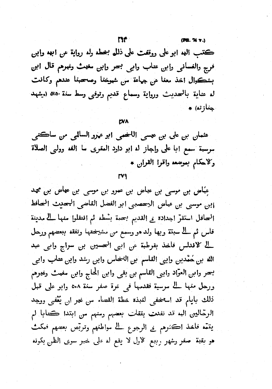 عِيَاضُ بْنُ مُوسَى بْنِ عِيَاضِ بْنِ عَمْرِو بْنِ مُوسَى بْنِ عِيَاضِ بْنِ مُحَمَّدِ بْنِ مُوسَى بْنِ عِيَاضٍ الْيَحْصِبِيُّ أَبُو الْفَضْلِ الْقَاضِي الْمُحَدِّثُ الْحَافِظُ الْحَافِلُ اسْتَقَرَّ أَجْدَادُهُ فِي الْقَدِيمِ بِحمة بسْطه ثُمَّ انْتَقَلُوا مِنْهَا إِلَى مَدِينَةِ فَاسَ ثُمَّ إِلَى سَبْتَةَ وَبِهَا وُلِدَ هُوَ وَسَمِعَ مِنْ مَشْيَخَتِهَا وَتَفَقَّهَ بِبَعْضِهِمْ وَرَحَلَ إِلَى الأَنْدَلُسِ فَأَخَذَ بِقُرْطُبَةَ عَنْ أَبِي الْحُسَيْنِ بْنِ سِرَاجٍ وَأَبِي عَبْدِ اللَّهِ بْنِ حَمْدَيْنِ وَأَبِي الْقَاسِمِ بْنِ النَّخَّاسِ وَابْنِ رُشْدٍ وَابْنِ عَتَّابٍ وَأَبِي بَحْرٍ وَابْنِ الْعَوَّادِ وَأَبِي الْقَاسِمِ بْنِ بَقِيٍّ وَابْنِ الْحَاجِّ وَابْنِ مُغِيثٍ وَغَيْرِهِمْ وَرَحَلَ مِنْهَا إِلَى مُرْسِيَّةَ فَقَدِمَهَا فِي غُرَّةِ صَفَرٍ سَنَةَ 508 وَأَبُو عَلِيٍّ قَبْلَ ذَلِكَ بِأَيَّامٍ قَدِ اسْتَخْفَى لَنَبْذِهِ خُطَّةَ الْقَضَاءِ مِنْ غَيْرِ أن يعفى ووجد الرحالين إليه قد نفذت بققات بَعْضِهِمْ وَمِنْهُمْ مِنِ ابْتَدَأَ كِتَابًا لَمْ يُتِمَّهُ فَأَخَذَ أَكْثَرُهُمْ فِي الرُّجُوعِ إِلَى مَوَاطِنِهِمْ وَتَرَبَّصَ بَعْضُهُمْ فَمَكَثَ هُوَ بَقِيَّةَ صَفَرٍ وَشَهْرَ رَبِيعٍ الأَوَّلِ لا يَقَعُ لَهُ عَلَى خَبَرٍ سِوَى الظن بكونه