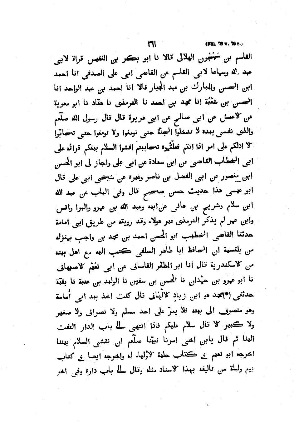 القاسم بن سمجون الْهِلالِيِّ قَالا نا أَبُو بَكْرِ بْنُ النَّفِيسِ قراة لأَبِي عَبْدِ اللَّهِ وَسَمَاعًا لأَبِي الْقَاسِمِ عَنِ القاضي أبي علي الصدفي أنا أحمد ابن الْحَسَنِ وَالْمُبَارَكُ بْنُ عَبْدِ الْجَبَّارِ قَالا أَنَا أَحْمَدَ بْنِ عَبْدِ الْوَاحِدِ أَنَا الْحَسَنُ بْنُ شُعْبَةَ أَنَا مُحَمَّدُ بْنُ أَحْمَدَ نا التِّرْمِذِيُّ نا هناد نا أبو معوية عَنِ الأَعْمَشِ عَنْ أَبِي صَالِحٍ عَنْ أَبِي هُرَيْرَةَ قَالَ قَالَ رَسُولُ اللَّهِ صَلَّى اللَّهُ عليه وسلموالذي نَفْسِي بِيَدِهِ لا تَدْخُلُوا الْجَنَّةَ حَتَّى تُؤْمِنُوا وَلا تُؤْمِنُوا حَتَّى تَحَابُّوا أَلا أَدُلُّكُمْ عَلَى أَمْرٍ إِذَا أَنْتُمْ فَعَلْتُمُوهُ تَحَابَبْتُمْ أَفْشُوا السَّلامَ بَيْنَكُمْ قَرَأْتُهُ عَلَى أَبِي الْخَطَّابِ الْقَاضِي عَنِ ابْنِ سَعَادَةَ عَنْ أَبِي عَلِيٍّ وَأَجَازَ لِي أبو الحسن ابْنُ مَنْصُورٍ عَنْ أَبِي الْفَضْلِ بْنِ نَاصِرٍ وَغَيْرِهِ عَنْ شَيْخِي أَبِي عَلِيٍّ قَالَ أَبُو عِيسَى هَذَا حَدِيثٌ حَسَنٌ صَحِيحٌ قَالَ وَفِي الباب عن عبد الله ابن سَلامٍ وَشُرَيْحِ بْنِ هَانِئٍ عَنْ أَبِيهِ وَعَبْدِ الله بن عمرو والبرا وَأَنَسٍ وَابْنِ عُمَرَ لَمْ يَذْكُرِ التِّرْمِذِيُّ غَيْرَ هَؤُلَاءِ وَقَدْ رَوَيْتُهُ مِنْ طَرِيقِ أَبِي أُمَامَةَ حَدَّثَنَا الْقَاضِي الْخَطِيبُ أَبُو الْحَسَنِ أَحْمَدُ بْنُ مُحَمَّدِ بْنِ وَاجِبٍ بِمَنْزِلِهِ مِنْ بَلَنْسِيَةَ أَنَّ الْحَافِظَ أَبَا طَاهِرٍ السَّلَفِيَّ كَتَبَ إِلَيْهِ مَعَ أَهْلِ بَيْتِهِ مِنَ الإِسْكَنْدَرِيَّةِ قَالَ أَنَا أَبُو الْمُظَفَّرِ الْقَاسَانِيُّ عَنْ أَبِي نُعَيْمٍ الأَصْبَهَانِيِّ نا أَبُو عَمْرِو بْنُ حَمْدَانَ نا الْحَسَنُ بْنُ سفين نا الْوَلِيدُ بْنُ عُتْبَةَ نا بَقِيَّةُ حَدَّثَنِي مُحَمَّدٌ هُوَ ابْنُ زِيَادٍ الأَلْهَانِيُّ قَالَ كُنْتُ آخُذُ بِيَدِ أَبِي أُمَامَةَ وَهُوَ مُنْصَرِفٌ إِلَى بَيْتِهِ فَلا يَمُرُّ عَلَى أَحَدٍ مُسْلِمٍ وَلا نَصْرَانِيٍّ وَلا صَغِيرٍ وَلا كَبِيرٍ إِلا قَالَ سَلامٌ عَلَيْكُمْ فَإِذَا انْتَهَى إِلَى بَابِ الدَّارِ التفت إلينا ثم قال يا بن أخي أمرنا نبينا صلى الله عليه وسلمأن نُفْشِيَ السَّلامَ بَيْنَنَا أَخْرَجَهُ أَبُو نُعَيْمٍ فِي كِتَابِ حِلْيَةِ الأَوْلِيَاءِ لَهُ وَأَخْرَجَهُ أَيْضًا فِي كِتَابِ يَوْمٍ وَلَيْلَةٍ مِنْ تَأْلِيفِهِ بِهَذَا الإِسْنَادِ مِثْلِهِ وَقَالَ إِلَى بَابِ دَارِهِ وَفِي آخِرِ
