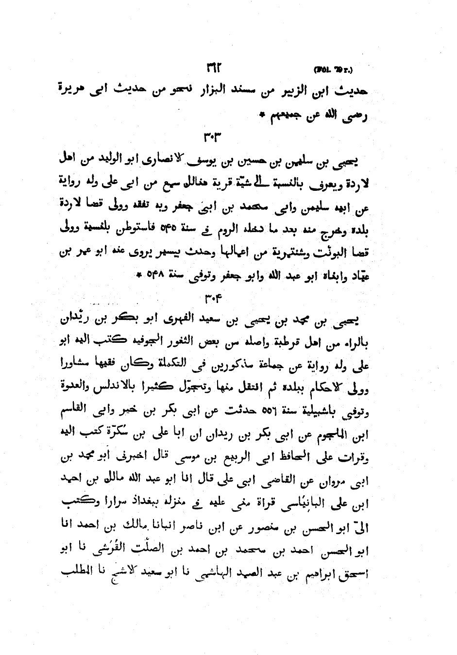 يَحْيَى بْنُ مُحَمَّدِ بْنِ يَحْيَى بْنِ سَعِيدٍ الْفِهْرِيُّ أَبُو بَكْرِ بْنُ رَيْدَانَ بِالرَّاءِ مِنْ أَهْلِ قُرْطُبَةَ وَأَصْلُهُ مِنْ بَعْضِ الثُّغُورِ الْجَوْفِيَّةِ وكَتَبَ إِلَيْهِ أَبُو عَلِيٍّ وَلَهُ رِوَايَةٌ عَنْ جَمَاعَةٍ مَذْكُورِينَ فِي التَّكْمِلَةِ وَكَانَ فَقِيهًا مُشَاوِرًا وَوَلِيَ الأَحْكَامَ بِبَلَدِهِ ثُمَّ انْتَقَلَ مِنْهَا وَتَجَوَّلَ كَثِيرًا بِالأَنْدَلُسِ وَالعدوة وَتُوُفِّيَ بِإِشْبِيلِيَّةَ سَنَةَ 556 حُدِّثْتُ عَنْ أَبِي بَكْرِ بْنِ خَيْرٍ وَأَبِي الْقَاسِمِ ابن الملجوم عَنْ أَبِي بَكْرِ بْنِ رَيْدَانَ أَنَّ أَبَا عَلِيِّ بْنَ سكرة كَتَبَ إِلَيْهِ وَقَرَأْتُ عَلَى الْحَافِظِ أَبِي الرَّبِيعِ بْنِ مُوسَى قَالَ أَخْبَرَنِي أَبُو مُحَمَّدِ بْنُ أَبِي مَرْوَانَ عَنِ الْقَاضِي أَبِي عَلِيٍّ قَالَ أَنَا أَبُو عَبْدِ الله مالك بن أحمد ابن علي البانياسي قراة مِنِّي عَلَيْهِ فِي مَنْزِلِهِ بِبَغْدَادَ مِرَارًا وَكَتَبَ إِلَيَّ أَبُو الْحَسَنِ بْنُ مَنْصُورٍ عَنِ ابْنِ ناصر أنبانا مالك بن أحمد أبا أَبُو الْحَسَنِ أَحْمَدُ بْنُ مُحَمَّدِ بْنِ أَحْمَدَ بن الصلت القرشي نا أبو اسحق إِبْرَاهِيمُ بْنُ عَبْدِ الصَّمَدِ الْهَاشِمِيُّ نا أَبُو سعيد الأشج نا المطلب