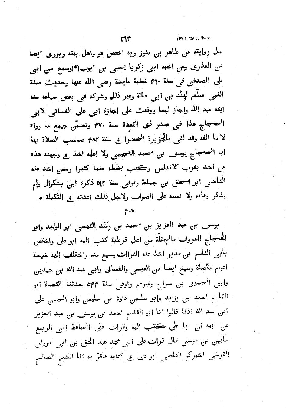 جُلُّ رِوَايَتِهِ عَنْ طَاهِرِ بْنِ مفوز وَبِهِ اخْتَصَّ هُوَ وَأَهْلُ بَيْتِهِ وَيَرْوِي أَيْضًا عَنِ الْعُذْرِيِّ وَعَنْ أَخِيهِ أَبِي زَكَرِيَّا يَحْيَى بْنِ أَيُّوبَ وَسَمِعَ مِنْ أَبِي عَلِيٍّ الصَّدَفِيِّ فِي سنة 490 خطبة عايشة رَضِيَ اللَّهُ عَنْهَا وَحَدِيثَ صِفَةِ النَّبِيِّ صَلَّى الله عليه وسلملهند بْنِ أَبِي هَالَةَ وَغَيْرَ ذَلِكَ وَشَرِكَهُ فِي بَعْضِ سَمَاعِهِ مِنْهُ ابْنُهُ عَبْدُ اللَّهِ وَأَجَازَ لَهُمَا وَوَقَفْتُ عَلَى إِجَازَةِ أَبِي عَلِيٍّ الْغَسَّانِيِّ لأَبِي الْحَجَّاجِ هَذَا فِي صَدْرِ ذِي الْقَعْدَةِ سَنَةَ 470 وَتَضَمَّنَ جَمِيعَ مَا رَوَاهُ لا مَا أَلَّفَهُ وَقَدْ لَقِيَ بِالْجَزِيرَةِ الْخَضْرَاءِ فِي سَنَةِ 482 صَاحِبَ الصَّلاةِ بِهَا أَبَا الْحَجَّاجِ يُوسُفَ بْنَ مُحَمَّدٍ التُّجِيبِيَّ وَلا أَعْلَمُهُ أَخَذَ فِي وِجْهَتِهِ هَذِهِ عَنْ أَحَدٍ بِغَرْبِ الأَنْدَلُسِ وَكَتَبَ بِخَطِّهِ عِلْمًا كَثِيرًا وَمِمَّنْ أَخَذَ عَنْهُ الْقَاضِي أَبُو اسحق بْنُ جَمَاعَةٍ وَتُوُفِّيَ سَنَةَ 512 ذَكَرَهُ ابْنُ بَشْكُوَالَ وَلَمْ يَذْكُرْ وَفَاتَهُ وَلا نَسَبَهُ عَلَى الصَّوَابِ وَلأَجْلِ ذَلِكَ أَعَدْتُهُ فِي التَّكْمِلَةِ.