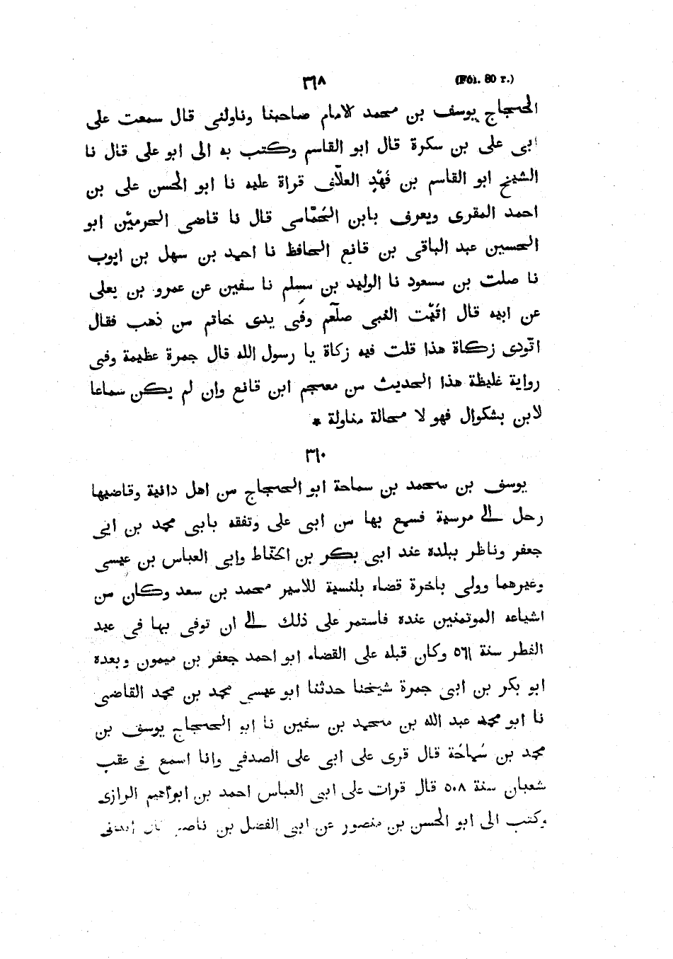 الْحَجَّاجِ يُوسُفَ بْنِ مُحَمَّدٍ الْإِمَامِ صَاحِبِنَا وَنَاوَلَنِي قَالَ سَمِعْتُ عَلَى أَبِي عَلِيِّ بْنِ سكرة قَالَ أَبُو الْقَاسِمِ وَكَتَبَ بِهِ إِلَى أَبُو عَلِيٍّ قَالَ نا الشَّيْخُ أَبُو الْقَاسِمِ بْنُ فهد العلاف قراة عَلَيْهِ نا أَبُو الْحَسَنِ عَلِيُّ بْنُ أَحْمَدَ المقري وَيُعْرَفُ بِابْنِ الحَمَّاسِيِّ قَالَ نا قَاضِي الْحَرَمَيْنِ أَبُو الْحُسَيْنِ عَبْدُ الْبَاقِي بْنُ قَانِعٍ الْحَافِظُ نا أَحْمَدُ بْنُ سَهْلِ بْنِ أَيُّوبَ نا صَلْتُ بْنُ مَسْعُودٍ نا الْوَلِيدُ بْنُ مُسْلِمٍ نا سفين عَنْ عَمْرِو بْنِ يَعْلَى عَنْ أَبِيهِ قَالَ أتيت النبي صلى الله عليه وسلموفي يدي خاتم من ذهب فقال أتودي زَكَاةَ هَذَا قُلْتُ فِيهِ زَكَاةٌ يَا رَسُولَ اللَّهِ قَالَ جَمْرَةٌ عَظِيمَةٌ وَفِي رِوَايَةٍ غَلِيظَةٌ هَذَا الْحَدِيثُ مِنْ مُعْجَمِ ابْنِ قَانِعٍ وَإِنْ لم يكن سماعاً لابن بشكوال فهو لا محالة مناولة.