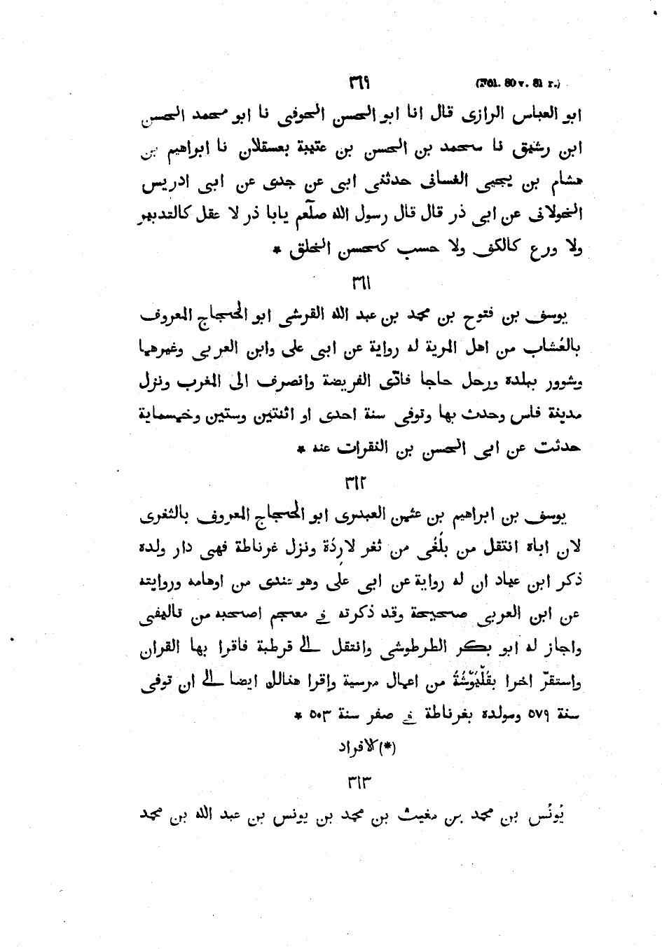 أَبُو الْعَبَّاسِ الرَّازِيُّ قَالَ أَنَا أَبُو الْحَسَنِ الحوفي نا أبو محمد الحسن ابن رَشِيقٍ نا مُحَمَّدُ بْنُ الْحَسَنِ بْنِ عُتَيْبَةَ بِعَسْقَلانَ نا إِبْرَاهِيمُ بْنُ هِشَامِ بْنِ يَحْيَى الغساني حدثني أبي عن جدي عن أَبِي إِدْرِيسَ الْخَوْلانِيِّ عَنْ أَبِي ذَرٍّ قَالَ قال رسول الله صلى الله عليه وسلميا با ذَرٍّ لا عَقْلَ كَالتَّدْبِيرِ وَلا وَرَعَ كَالْكَفِّ وَلا حَسَبَ كَحُسْنِ الْخُلُقِ.