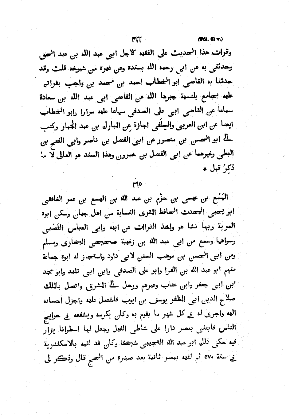 وَقَرَأْتُ هَذَا الْحَدِيثَ عَلَى الْفَقِيهِ الأَجَلِّ أَبِي عَبْدِ اللَّهِ بْنِ عَبْدِ الْحَقِّ وَحَدَّثَنِي بِهِ عَنْ أَبِي رَحِمَهُ اللَّهُ بِسَنَدِهِ وَعَنْ غَيْرِهِ مِنْ شُيُوخِهِ قُلْتُ وَقَدْ حَدَّثَنَا بِهِ الْقَاضِي أَبُو الْخَطَّابِ أَحْمَدُ بْنُ مُحَمَّدِ بْنِ وَاجِبٍ بقراتي عَلَيْهِ بِجَامِعِ بَلَنْسِيَةَ جَبَرَهَا اللَّهُ عَنِ الْقَاضِي أَبِي عَبْدِ اللَّهِ بْنِ سَعَادَةَ سَمَاعًا عَنِ الْقَاضِي أَبِي عَلِيٍّ الصَّدَفِيِّ سَمَاعًا عَلَيْهِ مِرَارًا وَأَبُو الْخَطَّابِ أَيْضًا عَنِ ابْنِ الْعَرَبِيِّ وَالسَّلَفِيِّ إجازة عن الْمُبَارَكِ بْنِ عَبْدِ الْجَبَّارِ وَكَتَبَ إِلَيَّ أَبُو الْحَسَنِ بْنُ مَنْصُورٍ عَنْ أَبِي الْفَضْلِ بْنِ نَاصِرٍ وَأَبِي الْفَتْحِ بْنِ الْبَطِّيِّ وَغَيْرِهِمَا عَنِ أَبِي الْفَضْلِ بْنِ خَيْرُونَ وَهَذَا السَّنَدُ هُوَ الْعَالِي لا مَا ذَكَرَ قَبْلُ.
