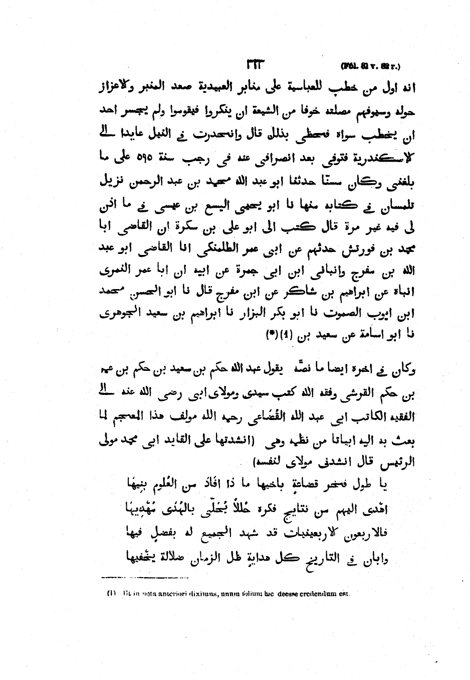 أَنَّهُ أَوَّلُ مَنْ خَطَبَ لِلْعَبَّاسِيَّةِ عَلَى مَنَابِرِ الْعُبَيْدِيَّةِ صَعِدَ الْمِنْبَرَ وَالإِعزاز حَوْلَهُ وَسُيُوفُهُمْ مُصْلَتَةٌ خَوْفًا مِنَ الشِّيعَةِ أَنْ يُنْكِرُوا فَيَقُومُوا وَلَمْ يَجْسُرْ أَحَدٌ أَنْ يَخْطُبَ سِوَاهُ فَحَظِيَ بِذَلِكَ قال وانحدرت في النيل عايداً إِلَى الإِسْكَنْدَرِيَّةِ فَتُوُفِّيَ بَعْدَ انْصِرَافِي عَنْهُ فِي رَجَبٍ سَنَةَ 595 عَلَى مَا بَلَغَنِي وَكَانَ مُسِنًّا حَدَّثَنَا أَبُو عَبْدِ اللَّهِ مُحَمَّدُ بْنُ عَبْدِ الرَّحْمَنِ نَزِيلُ تِلِمْسَانَ فِي كِتَابِهِ مِنْهَا نا أَبُو يَحْيَى الْيَسَعُ بْنُ عِيسَى فِي ما أَذِنَ لِي فِيهِ غَيْرَ مَرَّةٍ قَالَ كَتَبَ إِلَيَّ أَبُو عَلِيِّ بْنُ سكرة أَنَّ الْقَاضِي أَبَا مُحَمَّدِ بْنَ فورتش حَدَّثَهُمْ عَنْ أَبِي عُمَرَ الطلمنكي أنا الْقَاضِي أَبُو عَبْدِ اللَّهِ بْنُ مُفَرِّجٍ وَأَنْبَأَنِي ابْنُ أَبِي جَمْرَةَ عَنْ أبيه أن أبا عمر النمري ابناه عَنْ إِبْرَاهِيمَ بْنِ شَاكِرٍ عَنِ ابْنِ مُفَرِّجٍ قال نا أبو الحسن محمد ابن أَيُّوبَ الصموت نا أَبُو بَكْرٍ الْبَزَّارُ نا إِبْرَاهِيمُ بْنُ سَعِيدٍ الْجَوْهَرِيُّ نا أَبُو أُسَامَةَ عَنْ سَعِيد بْن.