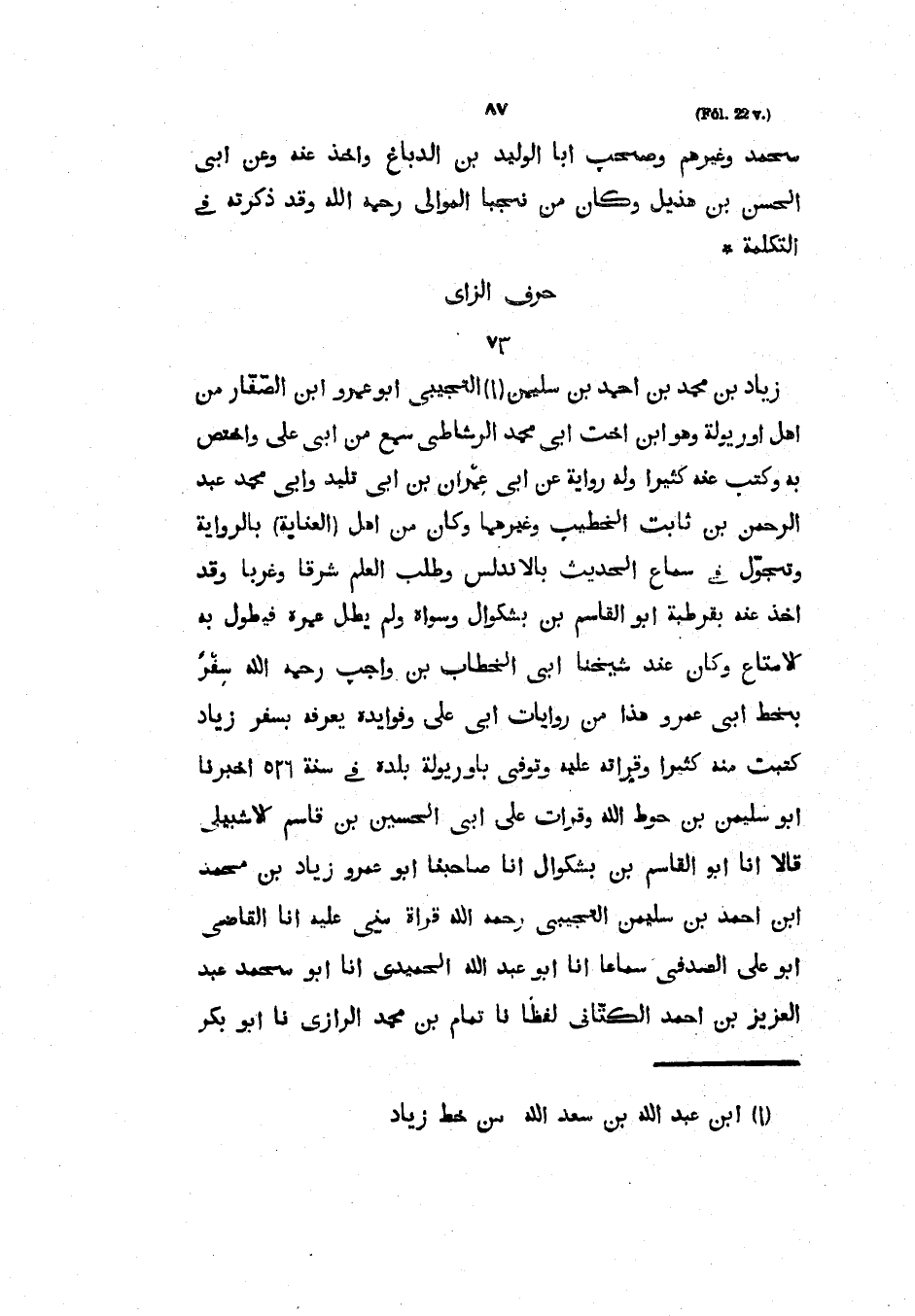 زِيَادُ بْنُ مُحَمَّدِ بْنِ أَحْمَدَ بن سليمان التجيبي أبو عمرو ابن الصَّفَّارِ مِنْ أَهْلِ أُورِيُولَةَ وَهُوَ ابْنُ أُخْتِ أَبِي مُحَمَّدٍ الرُّشَاطِيُّ سَمِعَ مِنْ أَبِي عَلِيٍّ وَاخْتَصَّ بِهِ وَكَتَبَ عَنْهُ كَثِيرًا وَلَهُ رِوَايَةٌ عَنْ أَبِي عِمْرَانَ بْنِ أَبِي تَلِيدٍ وَأَبِي محمد عَبْدِ الرَّحْمَنِ بْنِ ثَابِتٍ الْخَطِيبِ وَغَيْرِهِمَا وَكَانَ مِنْ أَهْلِ " الْعِنَايَةِ " بِالرِّوَايَةِ وَتَجَوَّلَ فِي سَمَاعِ الْحَدِيثِ بِالأَنْدَلُسِ وَطَلَبِ الْعِلْمِ شَرْقًا وَغَرْبًا وَقَدْ أَخَذَ عَنْهُ بِقُرْطُبَةَ أَبُو الْقَاسِمِ بْنُ بَشْكُوَالَ وَسِوَاهُ وَلَمْ يَطُلْ عُمْرُهُ فَيَطُولُ بِهِ الإِمْتَاعُ وكان عند شَيْخُنَا أَبِي الْخَطَّابِ بْنِ وَاجِبٍ رَحِمَهُ اللَّهُ سَفَرَ بِخَطِّ أَبِي عَمْرٍو هَذَا مِنْ رِوَايَاتِ أبي علي وفوايدة يَعْرِفُهُ بِسَفَرِ زِيَادٍ كَتَبْتُ مِنْهُ كَثِيرًا وَقَرَأْتُهُ عَلَيْهِ وَتُوُفِيَّ بِأُورِيُولَةَ بَلَدِهِ فِي سَنَةِ 526 أَخْبَرَنَا أَبُو سُلَيْمَانَ بْنُ حَوْطِ اللَّهِ وَقَرَأْتُ عَلَى أَبِي الْحُسَيْنِ بْنِ قَاسِمٍ الْإِشْبِيلِيِّ قَالَا أَنَا أَبُو الْقَاسِمِ بْنُ بَشْكُوَالَ أَنَا صَاحِبُنَا أَبُو عمرو زياد بن محمد ابن أحمد بن سليمان التجيبي رحمه الله قراة مِنِّي عَلَيْهِ أَنَا الْقَاضِي أَبُو عَلِيٍّ الصَّدَفِيُّ سَمَاعًا أَنَا أَبُو عَبْدِ اللَّهِ الْحَمِيدِيُّ أَنَا أَبُو مُحَمَّدٍ عَبْدُ الْعَزِيزِ بْنُ أَحْمَدَ الْكَتَّانِيُّ لَفْظًا نا تَمَّامُ بْنُ مُحَمَّدٍ الرَّازِيُّ نَا أبو بكر